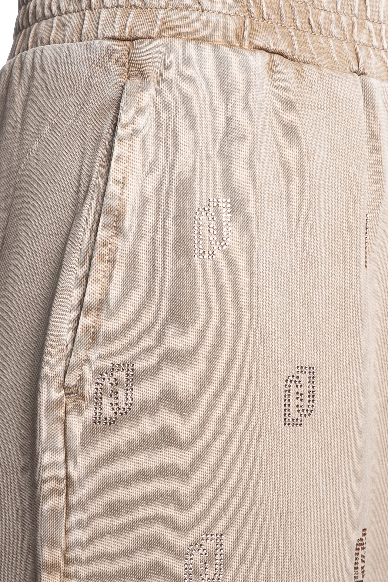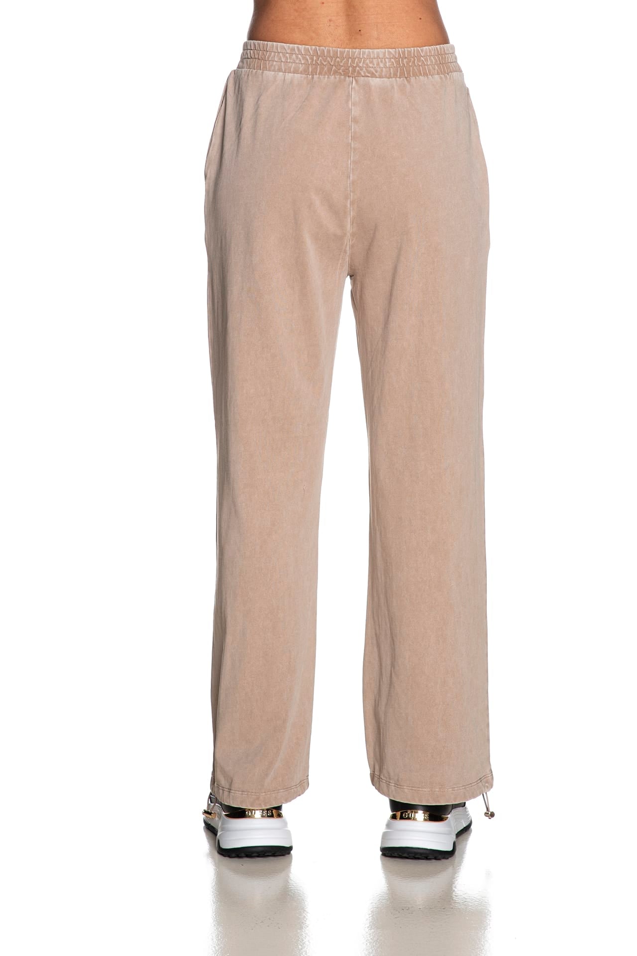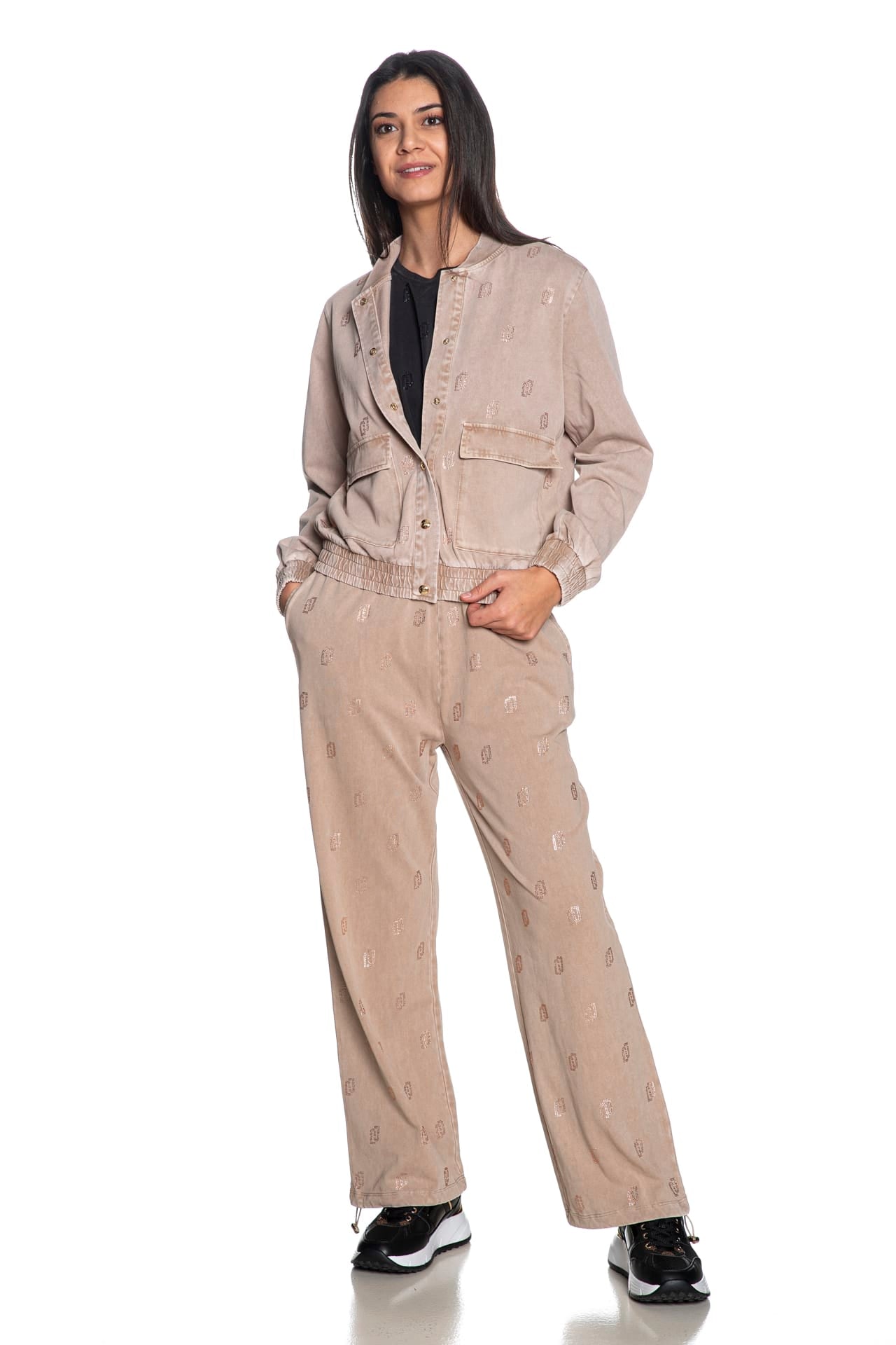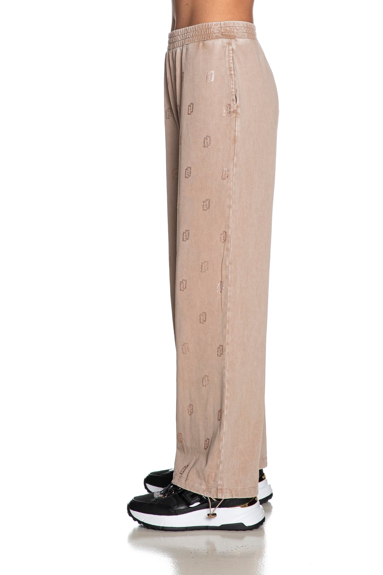 Pantalone Liu Jo Sport Palace Stss J Dlv da donna in jersey sottoposto a trattamento delavè per un effetto vintage, mdello palazzo wide fit, con lavorazione logo allover in strass nella parte anteriore, tasche a filo, elastico foderato in vita e polsino con coulisse elasticizzata regolabile da stopper