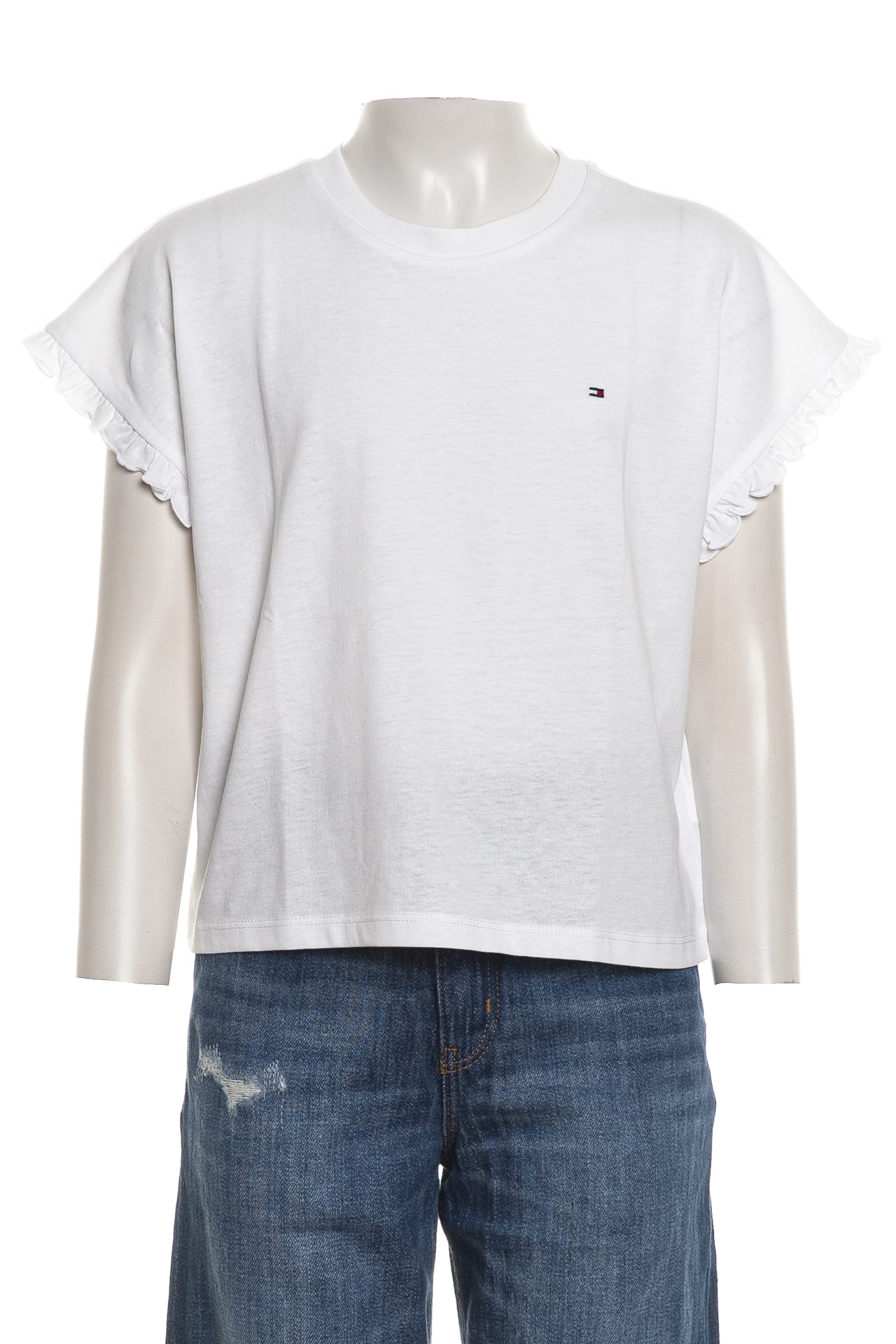 T shirt Tommy Hilfiger Ess Top Ss da bambina in jersey di misto cotone e poliestere, boxy fit girocollo, con rouches a bordo maniche corte a kimono e micro flag istituzionale ricamato sul petto