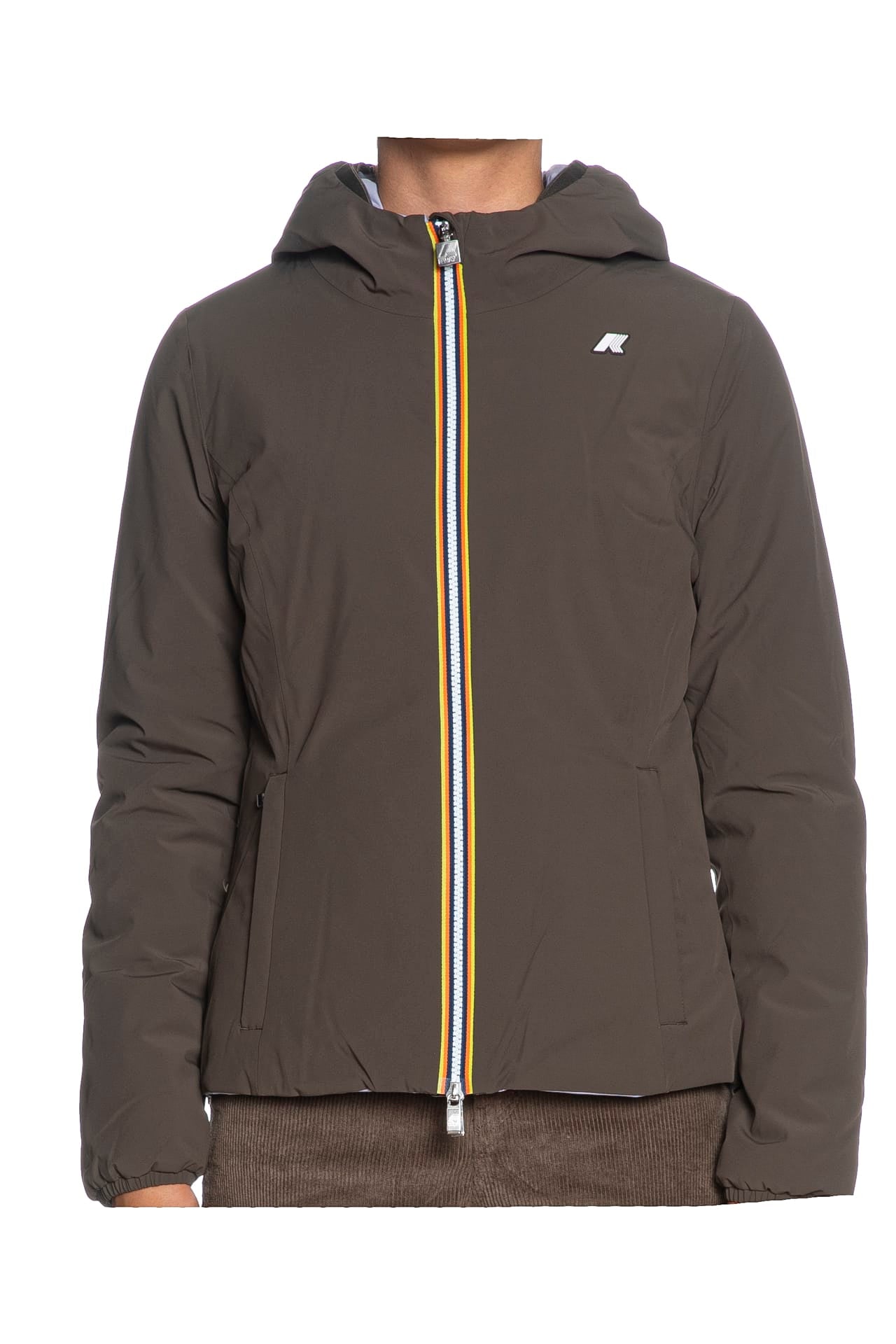 Giacca K-Way Lily St Warm Double da donna, slim fit corto dal taglio sagomato, reversibile con lato in tessuto impermeabile e idrorepellente di nylon stretch e lato in tessuto antivento di poliestere in colore differente, a grado di calore medio, con imbottitura in ovatta, cappuccio fisso, logo siliconato applicato sul petto, chiusura centrale full zip a doppio cursore bordata in gros grain a tre colori e su un lato coperta da patta, tasche laterali a filo con zip o bottone a pressione coperti e gancio portachiavi interno, polsini elastici, cuciture termonastrate per una sicura protezione e fondo posteriore stondato