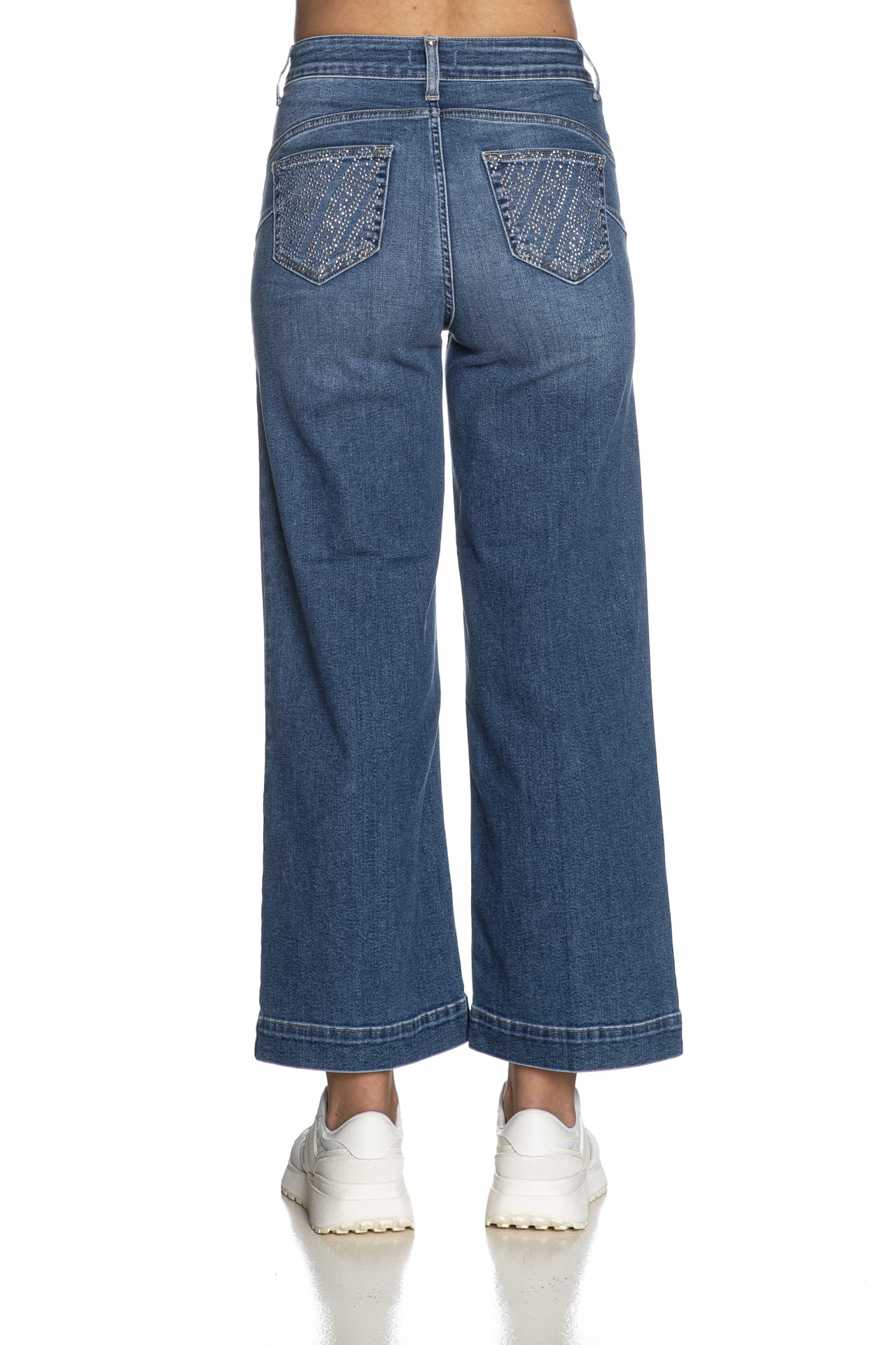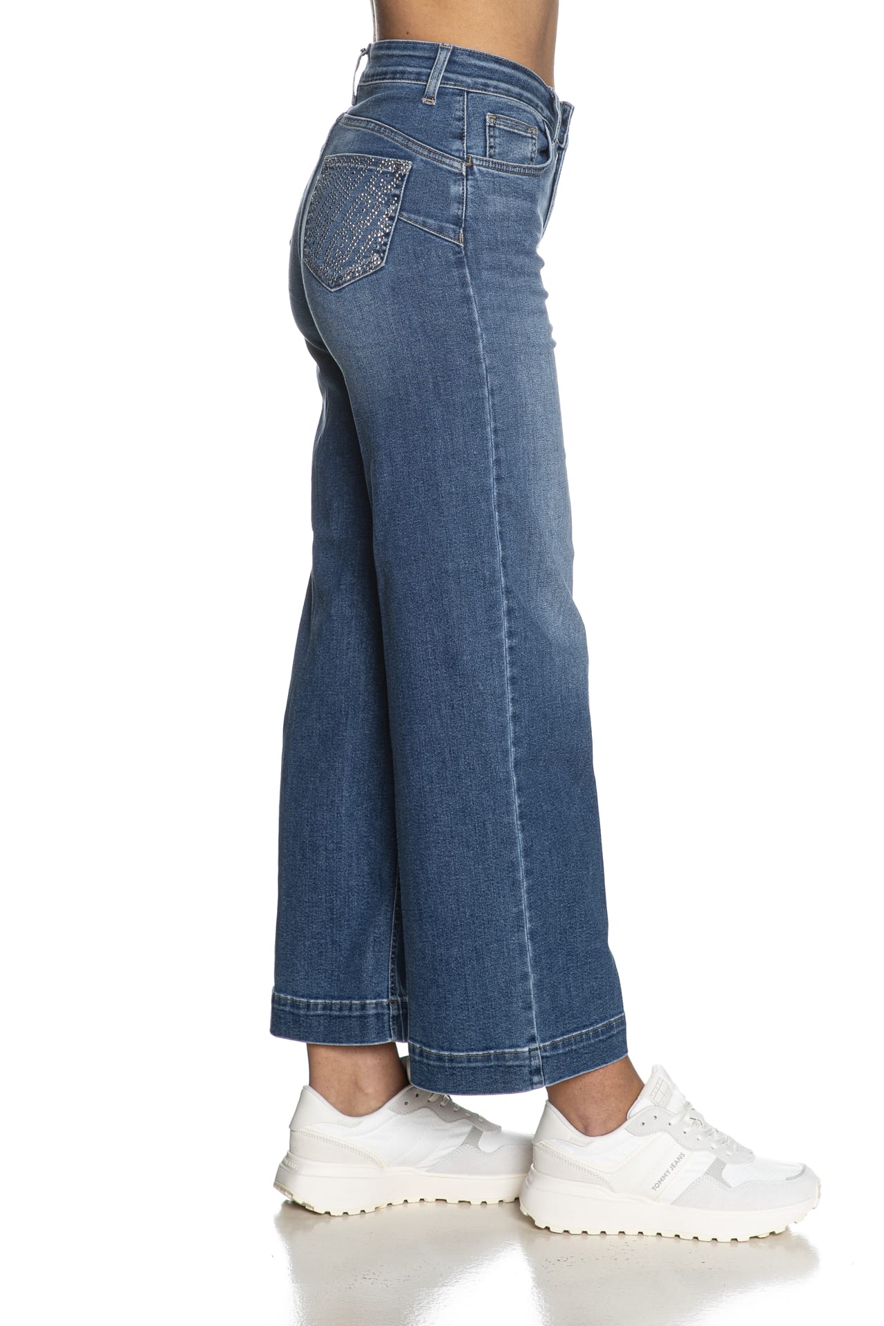 Jeans Liu Jo B Up Flare Crp da donna in denim stretch di misto cotone e lyocell sottoposto a trattamento per un aspetto used, modello cinque tasche bottom up perfect e wide fit a vita alta, con chiusura zip, strass sulle tasche posteriori patch e gamba ampia a zampa cropped