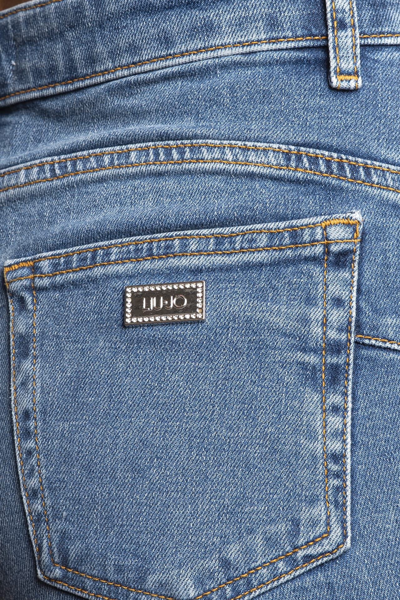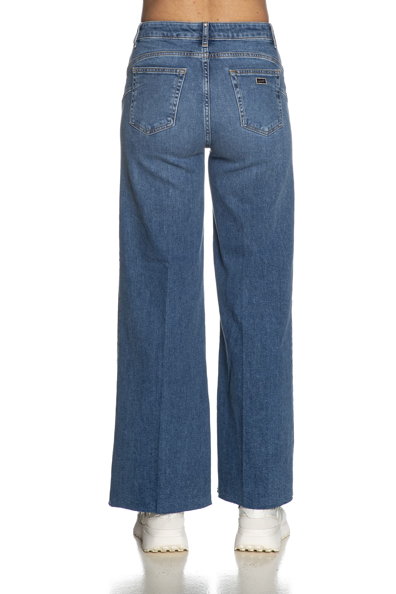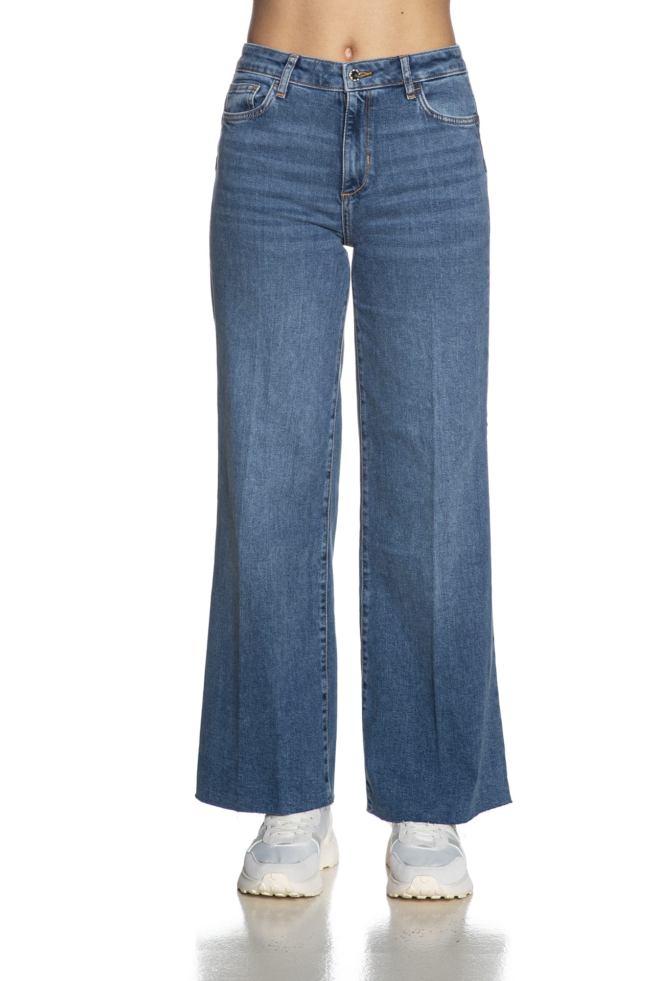 Jeans Liu Jo B Up Flare Stss Tg da donna in denim stretch di cotone sottoposto a trattamento per un aspetto vissuto, modello cinque tasche a vita alta e gamba dritta, con chiusura zip a scomparsa e bottone gioiello, tagli bottom up, tag logo metallico impreziosito da strass applicato su una delle due tasche a toppa posteriori e orlo a taglio vivo