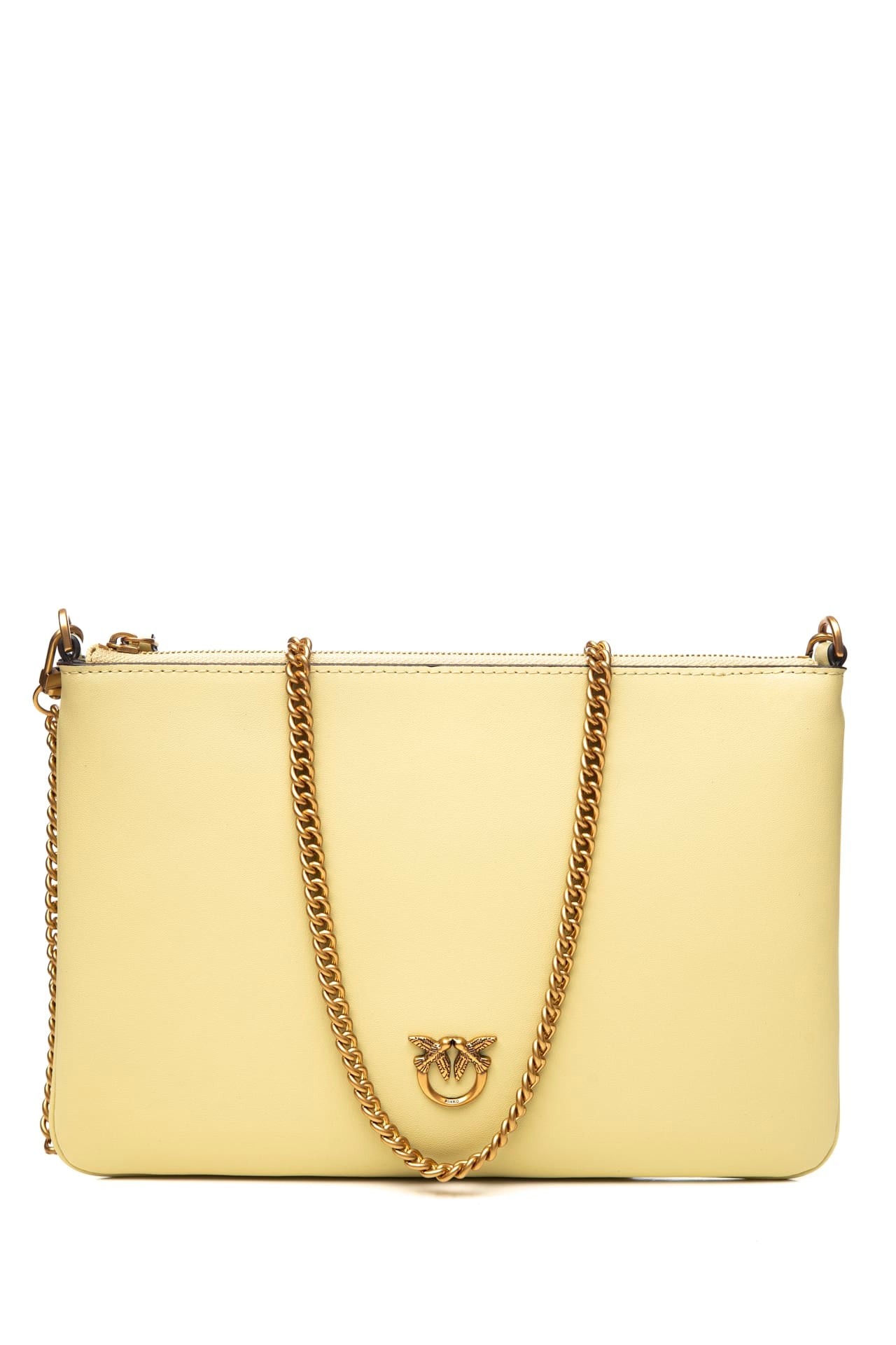 Borsa Pinko Classic Flat Love Bag Simply Gold da donna in pelle mano seta, a busta, con chiusura zip, fodera in polycotone, piccola iconica placchetta logo Love Birds Diamond Cut e tracolla rimovibile in catena di metallo oro anticato Misure: 25x2x16 cm