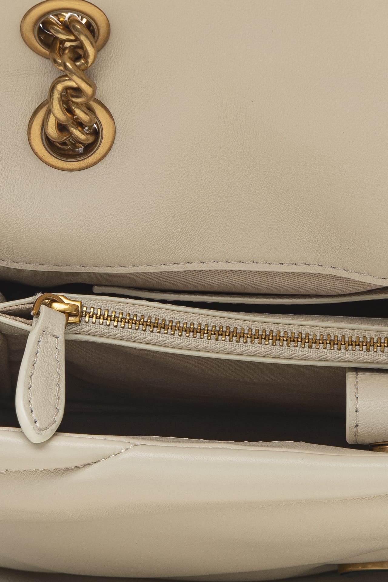 Borsa Pinko Love Puff Classic Sheep Gold da donna in pelle trapuntata diagonale, con fodera in microfibra ad effetto scamosciato, chiusura a incastro scorrevole, iconica fibbia Love Birds Diamond Cut sulla patta e tracolla regolabile in catena di metallo oro anticato Misure: 26x11x17 cm
