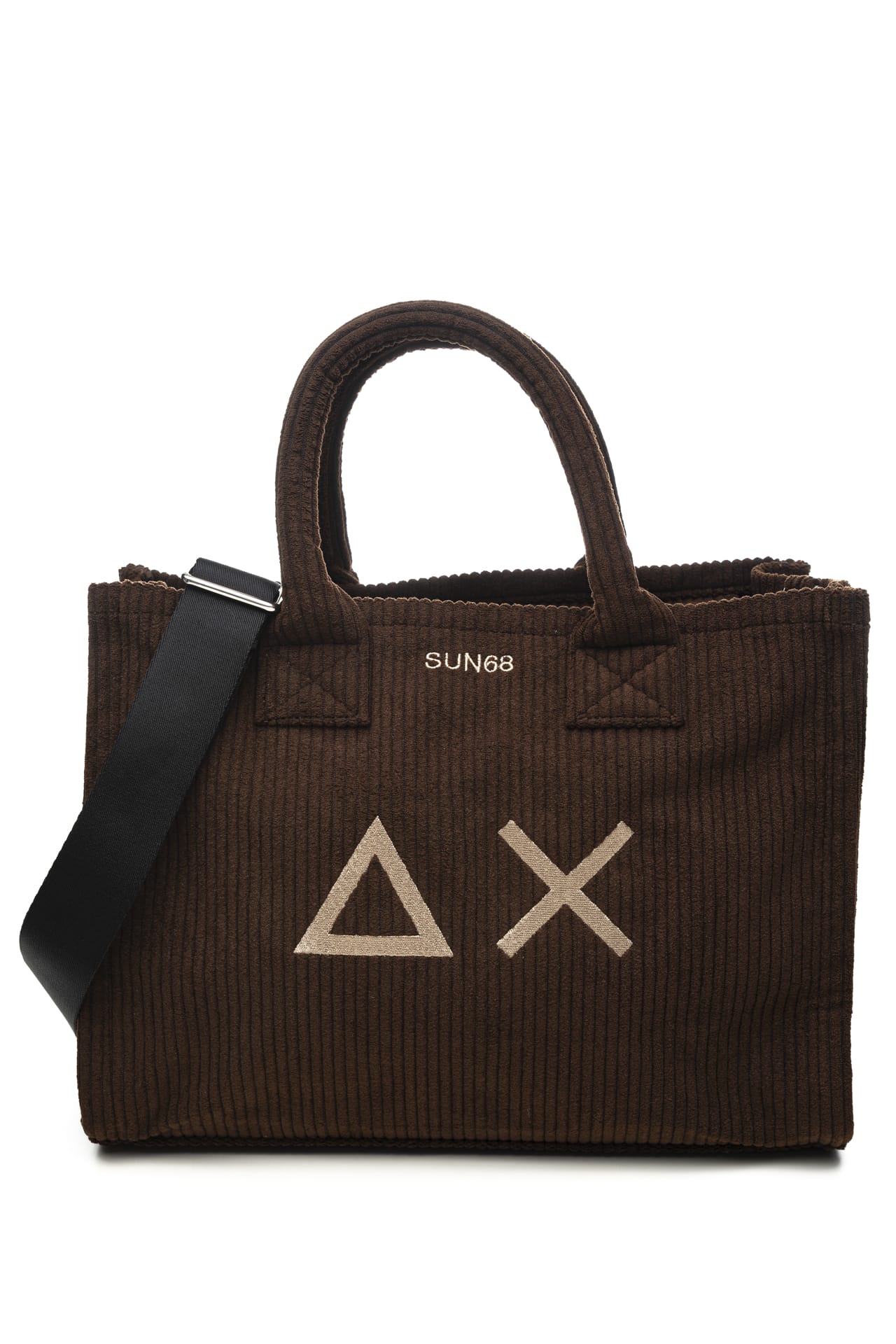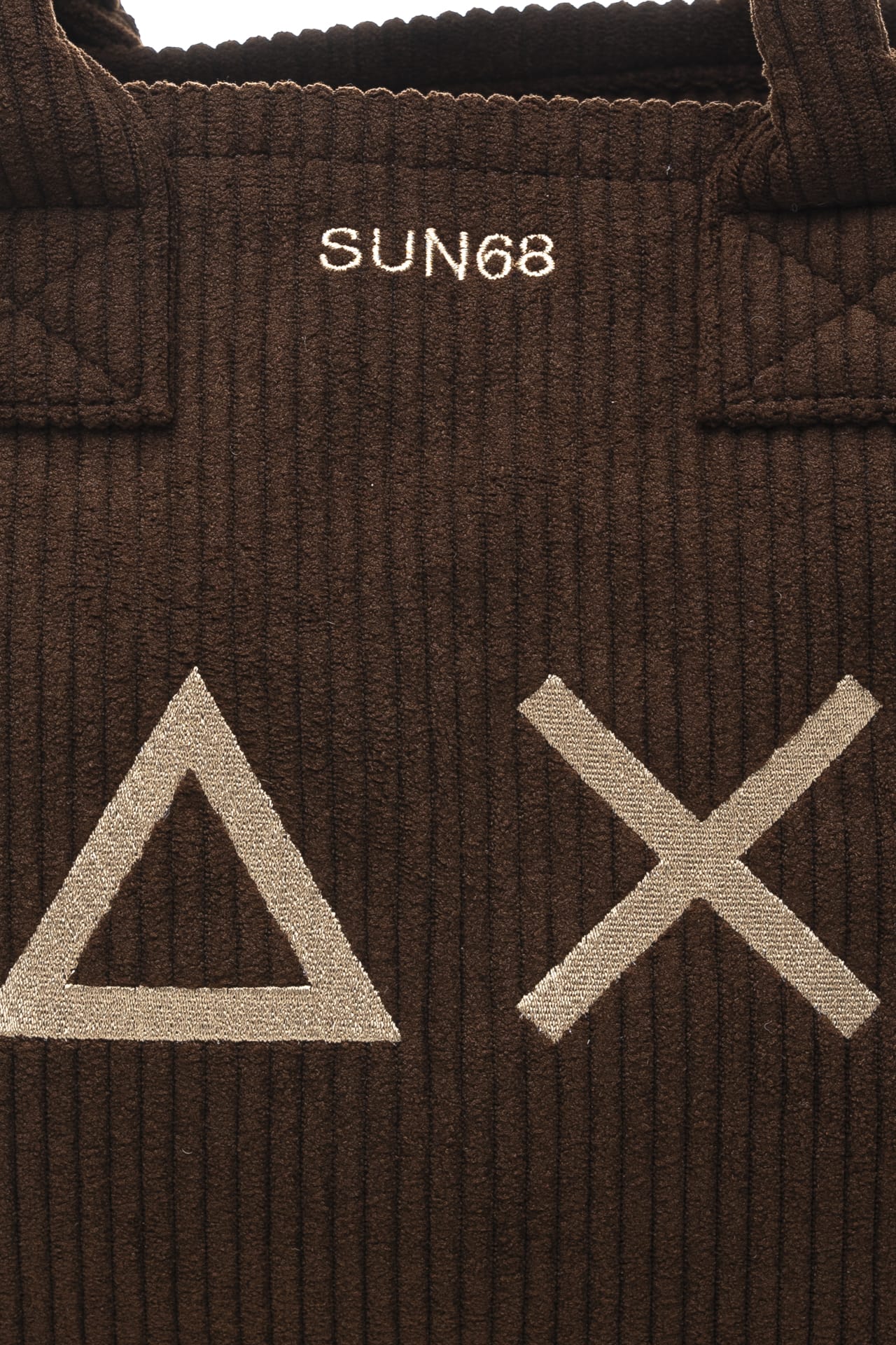 Borsa Sun68 Cali Midi Corduroy da donna in velluto a coste di poliestere, modello shopper medium con chiusura zip, macro monogramma e piccolo logo ricamati a contrasto colore, manici corti rigidi e tracolla larga in tessuto tecnico regolabile in lunghezza e rimovibile Misure: 35x15x27 cm