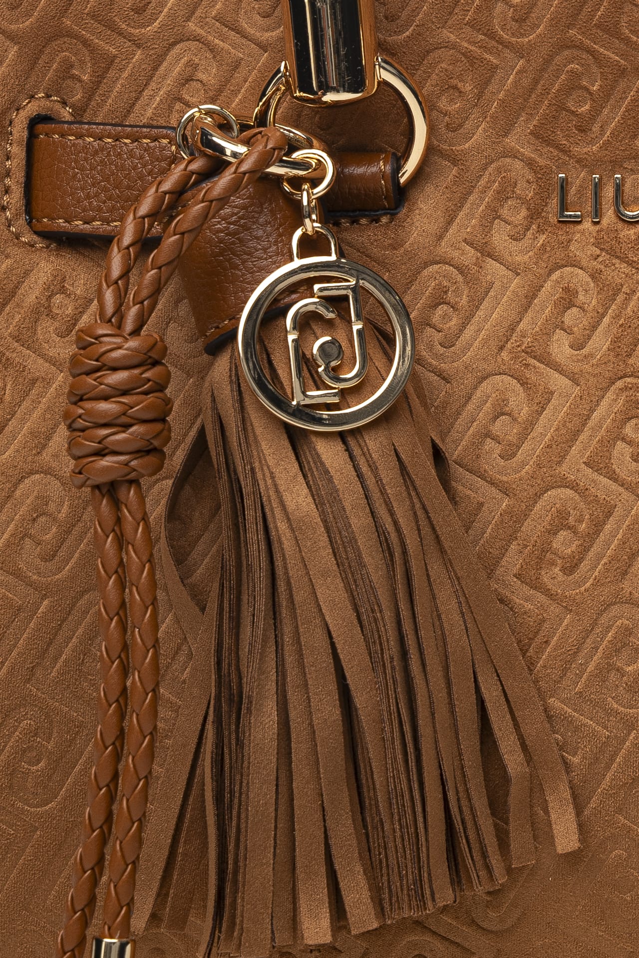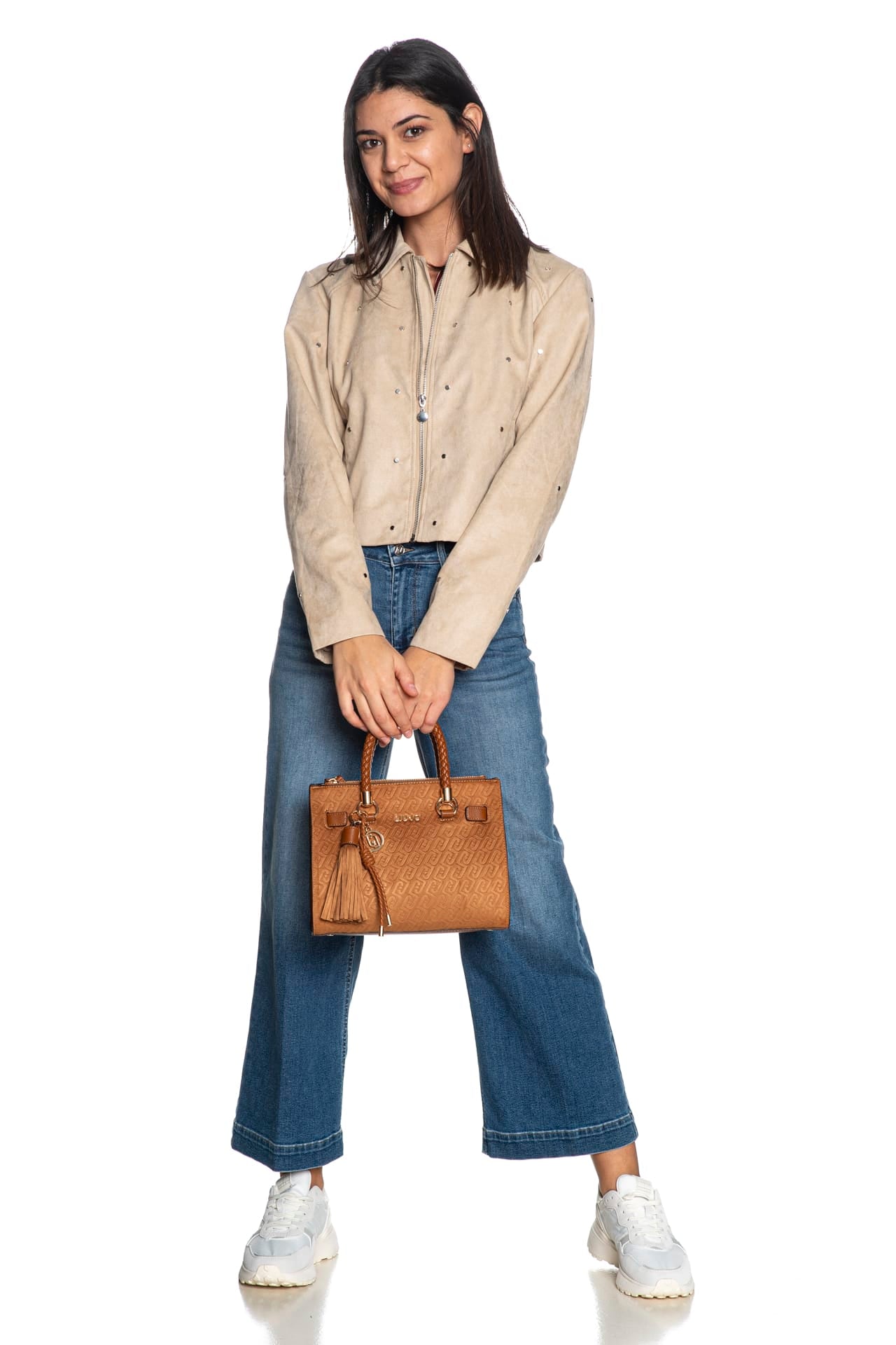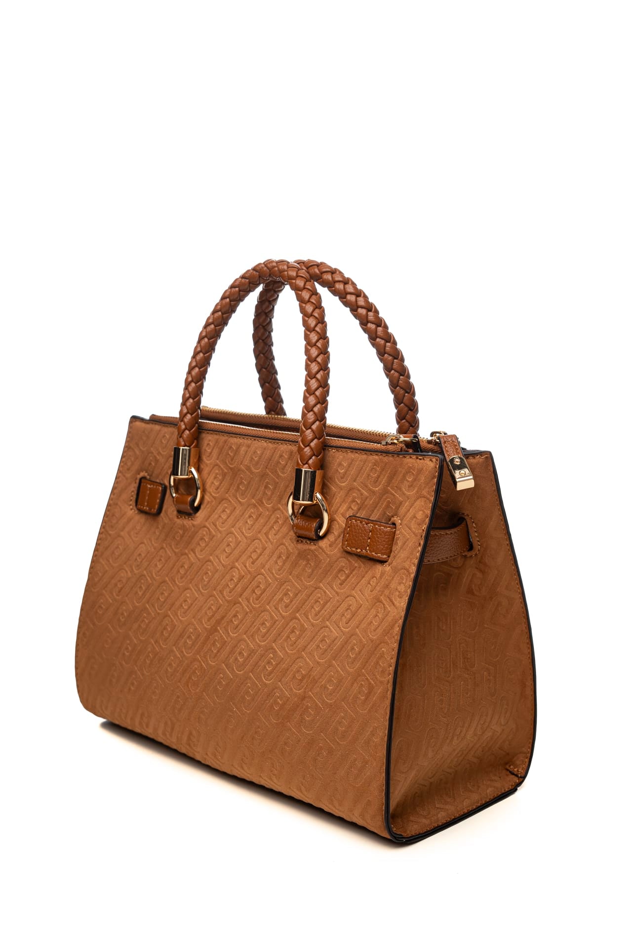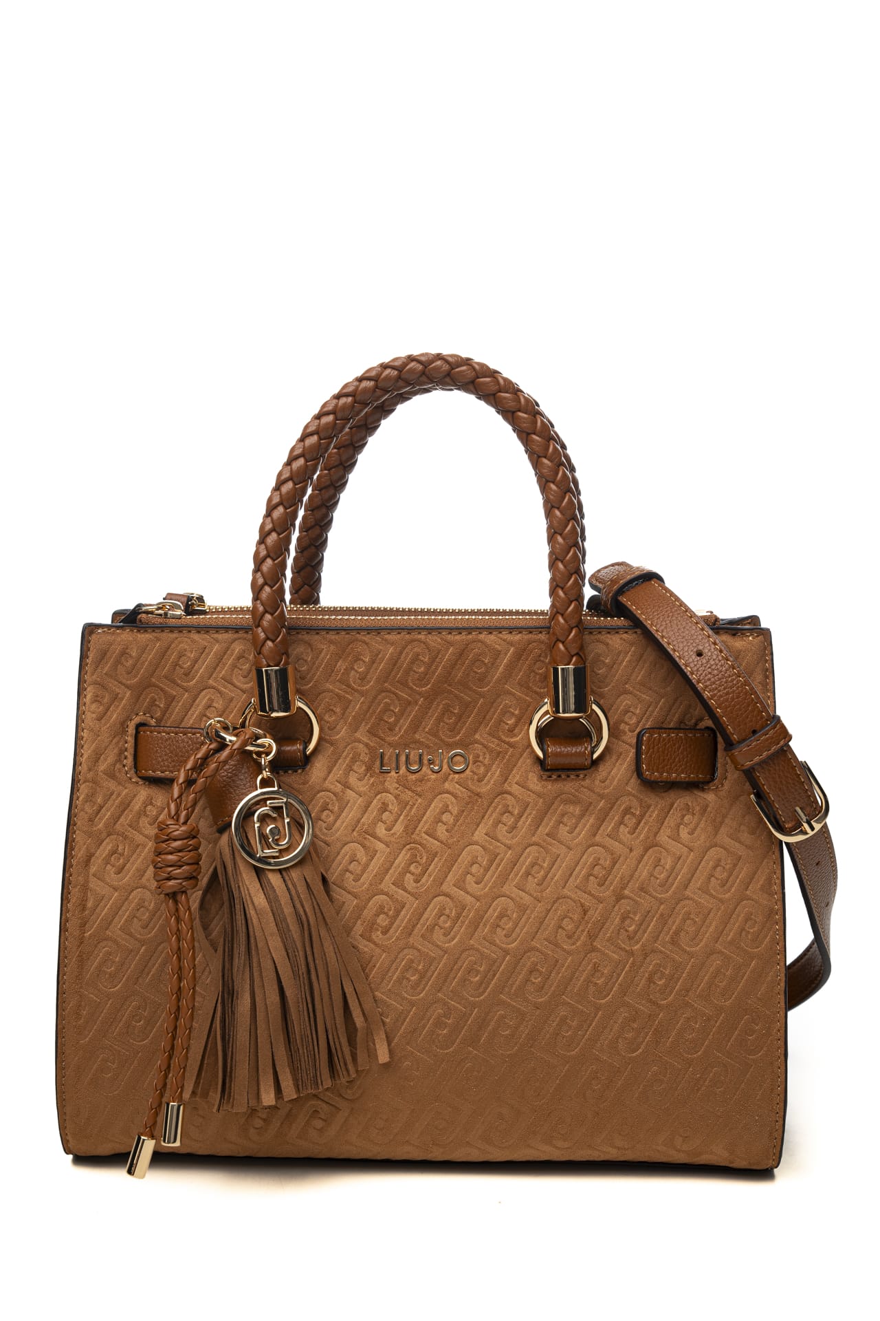 Borsa Liu Jo Manhattan S Stc da donna in poliuretano stampato deboss con monogrammi allover tono su tono, modello satchell small a mano, con charm logo nappina e cappio agganciati ai manici corti rigidi intrecciati, tracolla stretta rimovibile e regolabile in lunghezza, piccolo logo in metallo dorato e fascette laterali con bottoni a pressione per aumentarne la capienza, vano principale con chiusura magnetica e vani laterali a busta con chiusura zip Misure: 27x13x21 cm