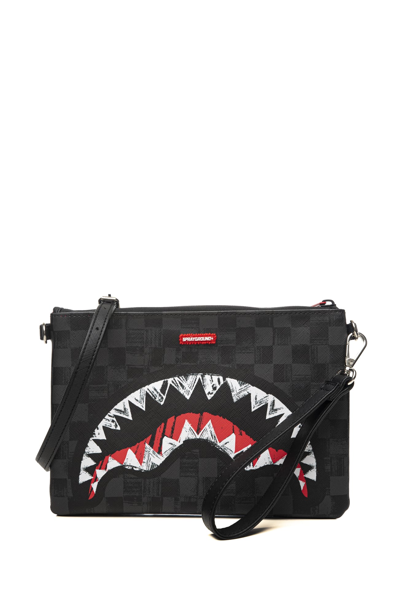 Pochette Sprayground Scribble Shark Crossover Clutch Unisex in polivinile simil saffiano resistente all'acqua stampato in fantasia disegno a scacchiera e Shark originale, modello a busta flat, con chiusura zip, piccolo logo gommato frontale e maniglia applicata sul lato posteriore, polsiera laterale e tracolla stretta regolabile in lunghezza rimovibili da moschettoni Misure: 26x18 cm