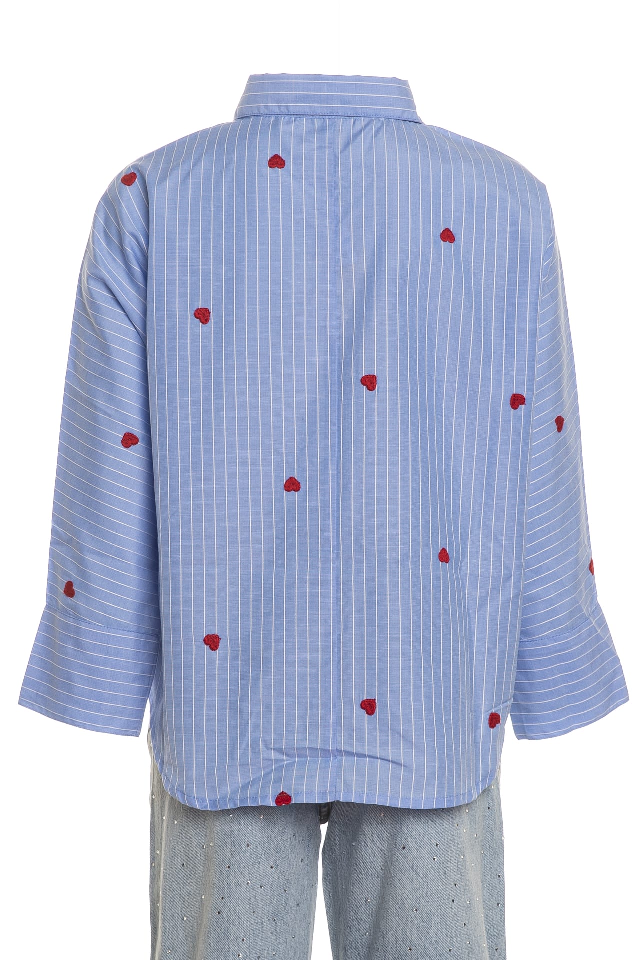 Camicia Kids Only New Lina Grace da bambina in tessuto di misto poliestere e cotone a righe strette, con piccoli cuori random ricamati in filo a contrasto colore, over fit a spalla scesa e manica tre quarti a kimono, con collo italiano e fondo stondato più lungo sul lato posteriore