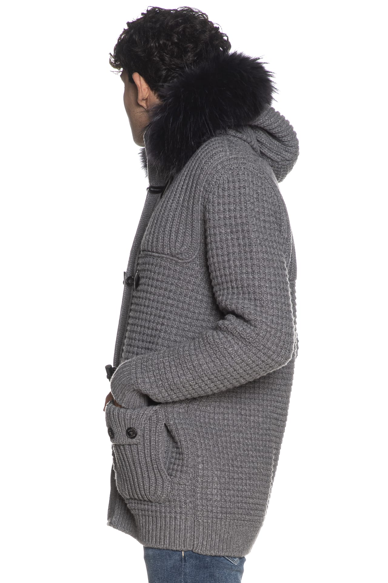 Giaccone Bark Short Duffle Coat Fur da uomo in filato di lana e fibra sintetica lavorata a punto Bark, modello montgomery, lunghezza tre quarti, con cappuccio staccabile dal bordo rimovibile in pelliccia naturale di murmasky, collo alto, carrè, polsini, cannolè e tasconi a toppa che nascondono le tasche a filo in lavorazione a costa inglese, chiusura full ad automatici nascosti e alamari