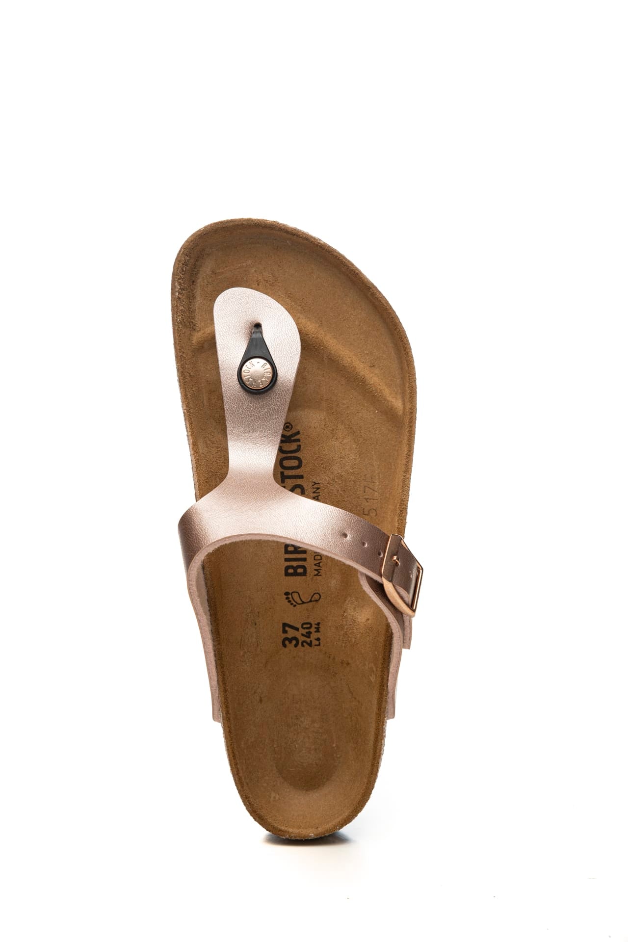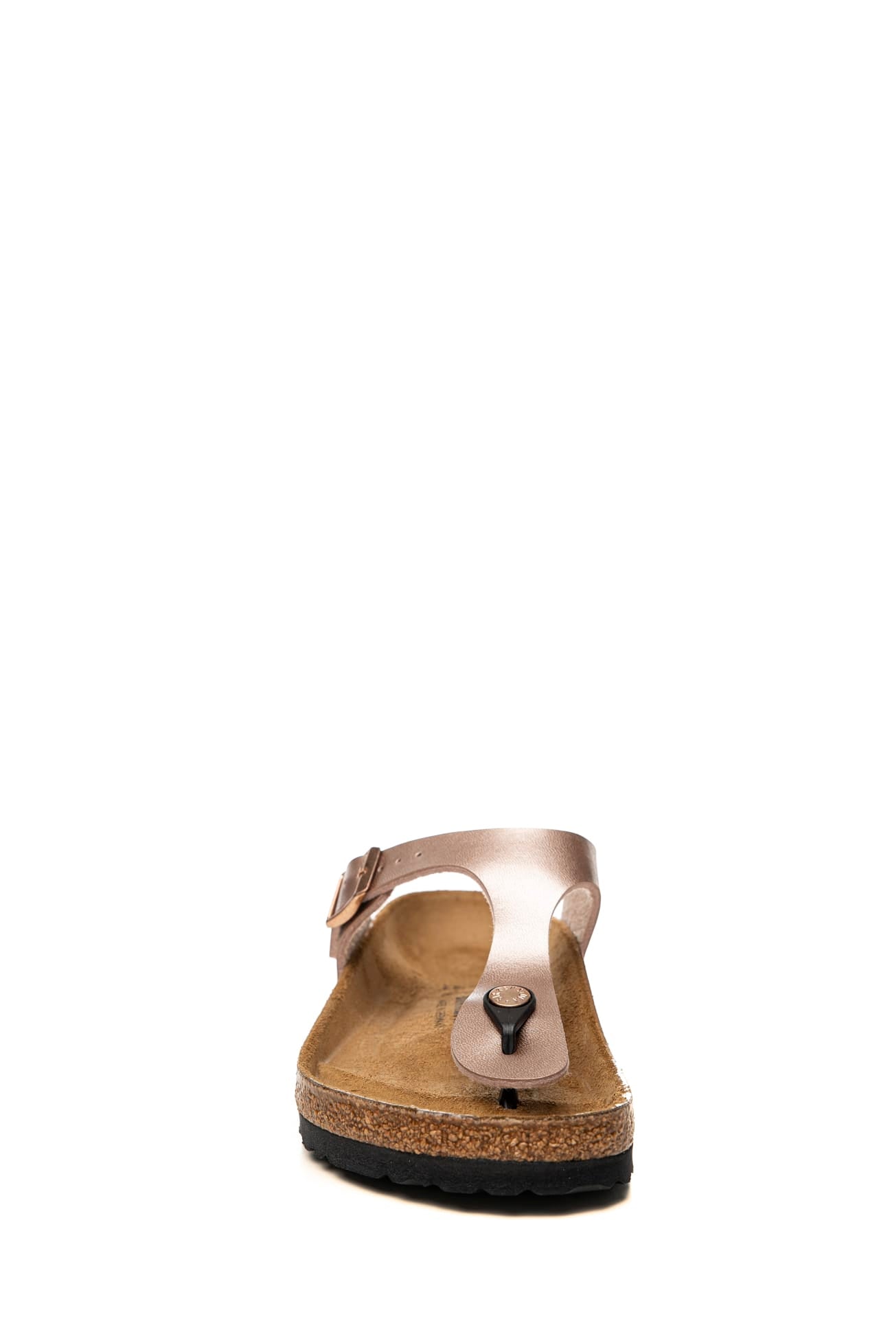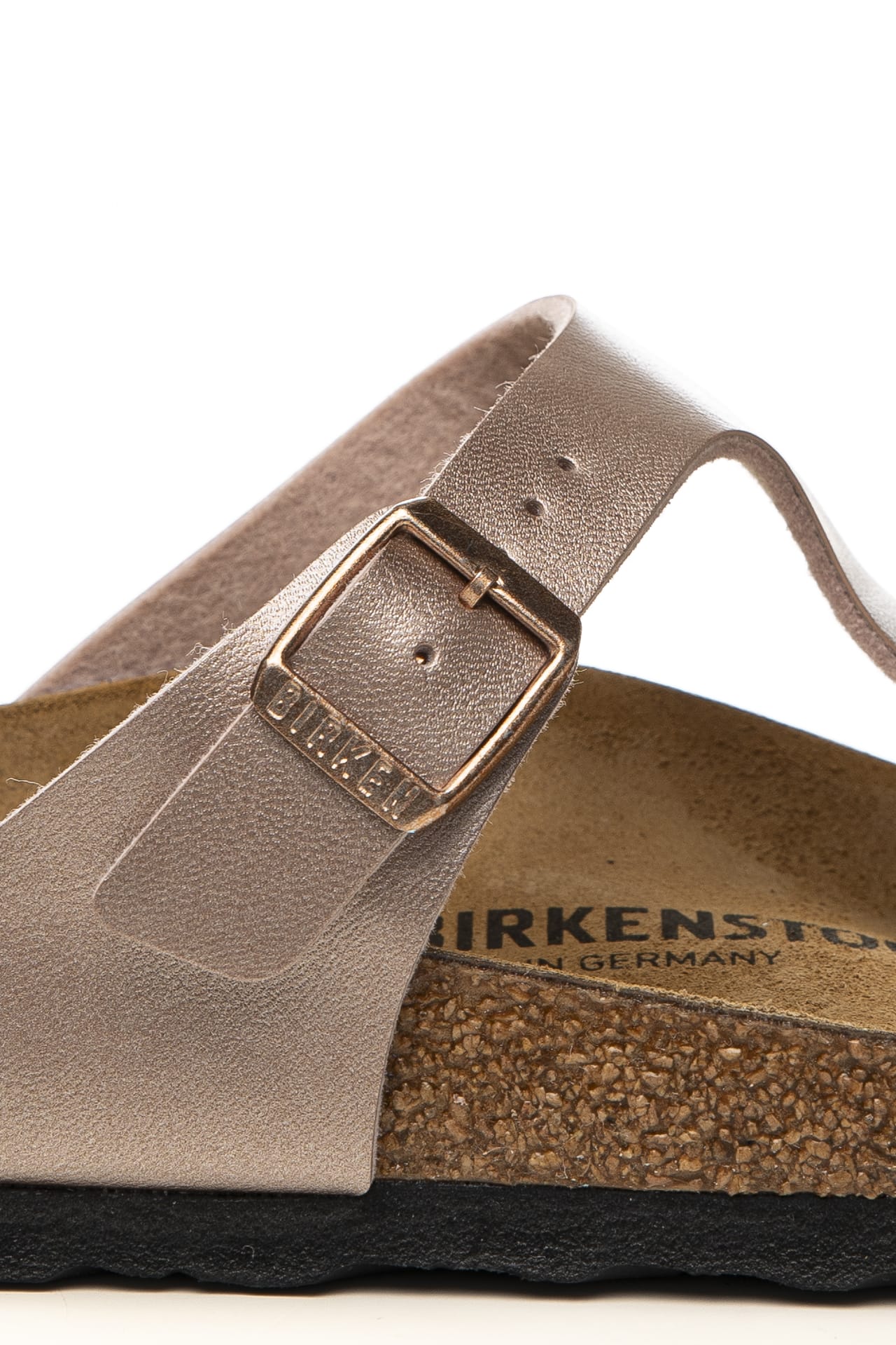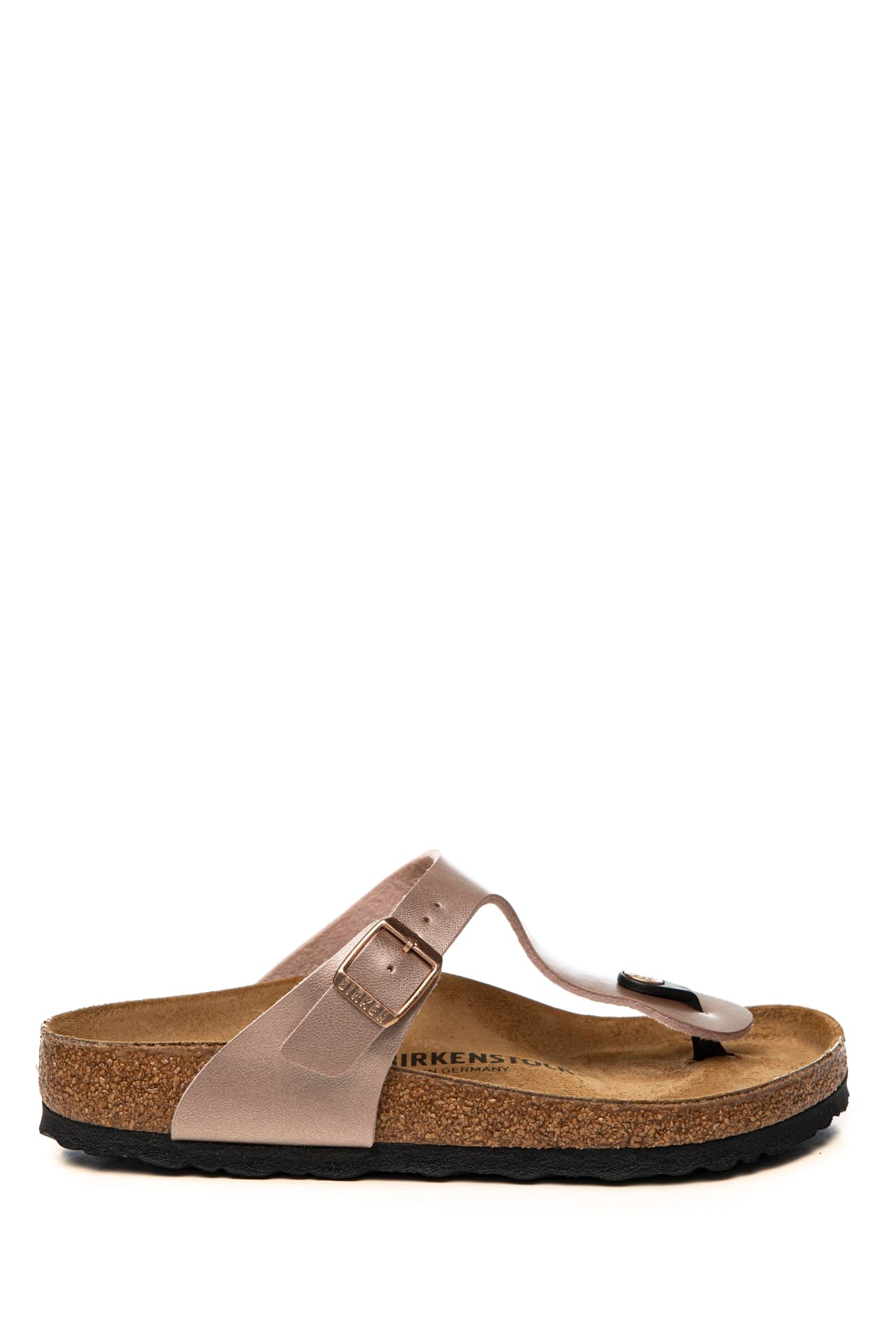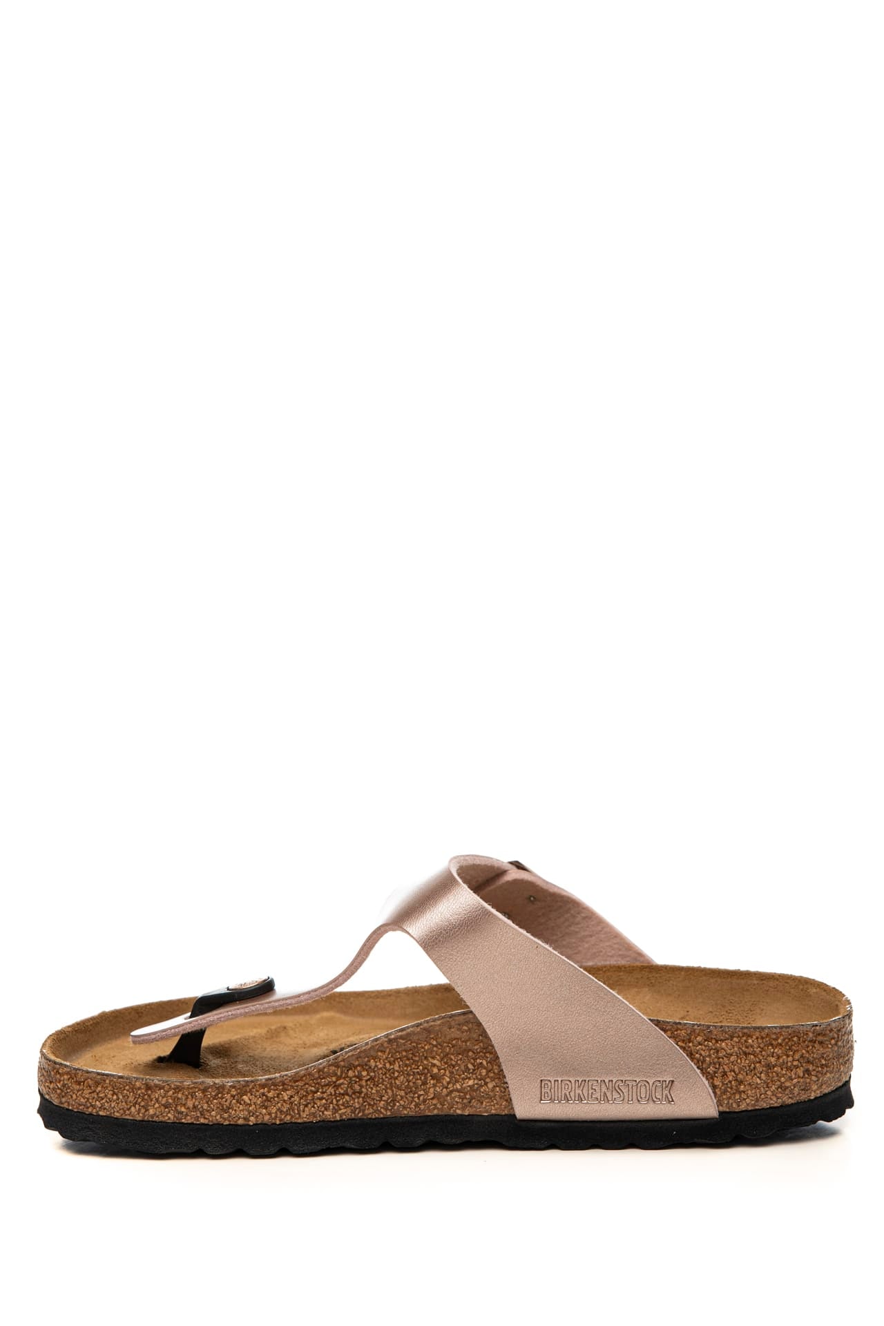 Infradito Birkenstock Gizeh Bs da donna in materiale sintetico Birko-Flor resistente all'usura dalla finitura metallizzata, modello leggendario dalla struttura minimal ispirata all'orma naturale del piede per un appoggio e una stabilità perfetta, regolabile mediante fibbia in metallo ramato, con logo laterale inciso, divaricatore e plantare in sughero e lattice anatonici, sottopiede pelle e suola in Eva a contrasto colore