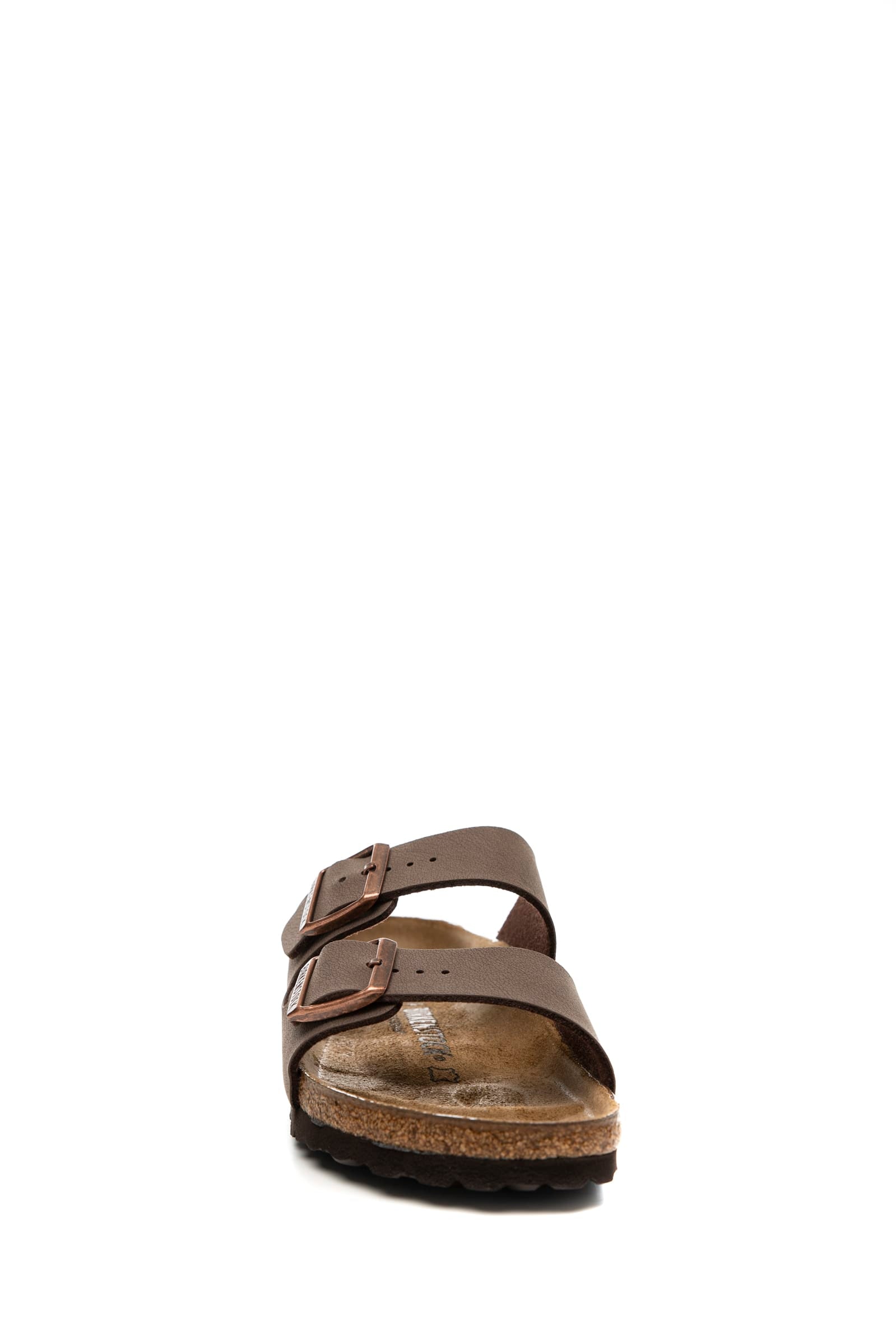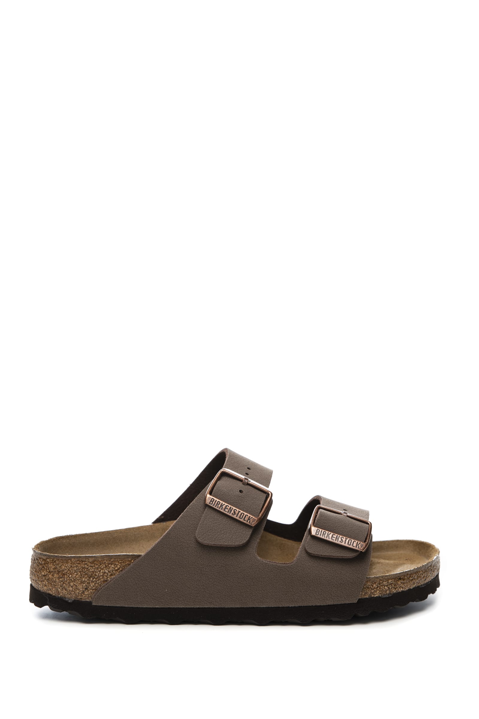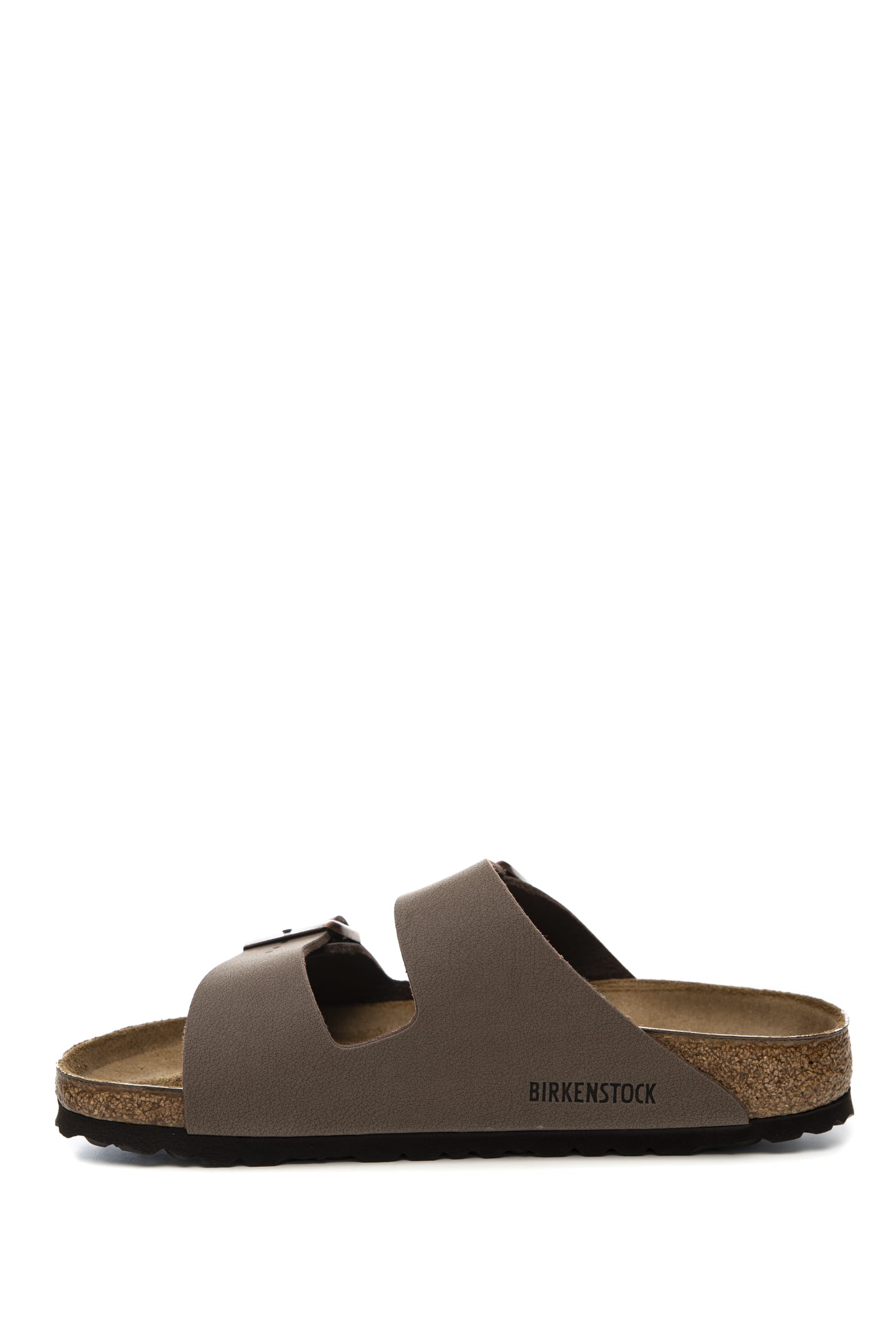 Sandalo Birkenstock Arizona Unisex in resistente materiale sintetico Birko Flor Dermoaffine simil nubuk, modello leggendario dalla struttura sobria ispirata all'orma naturale del piede per un appoggio e una stabilità perfetta, dalla linea compatta a due cinturini ampi sulla pianta regolabili mediante fibbie in metallo ramato, con logo laterale inciso, plantare anatonico in sughero e lattice, sottopiede in pelle scamosciata e suola in Eva a contrasto colore