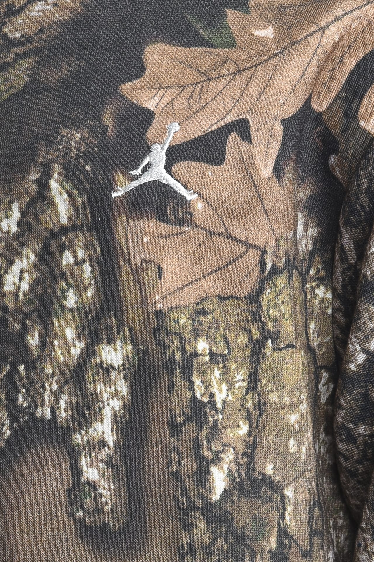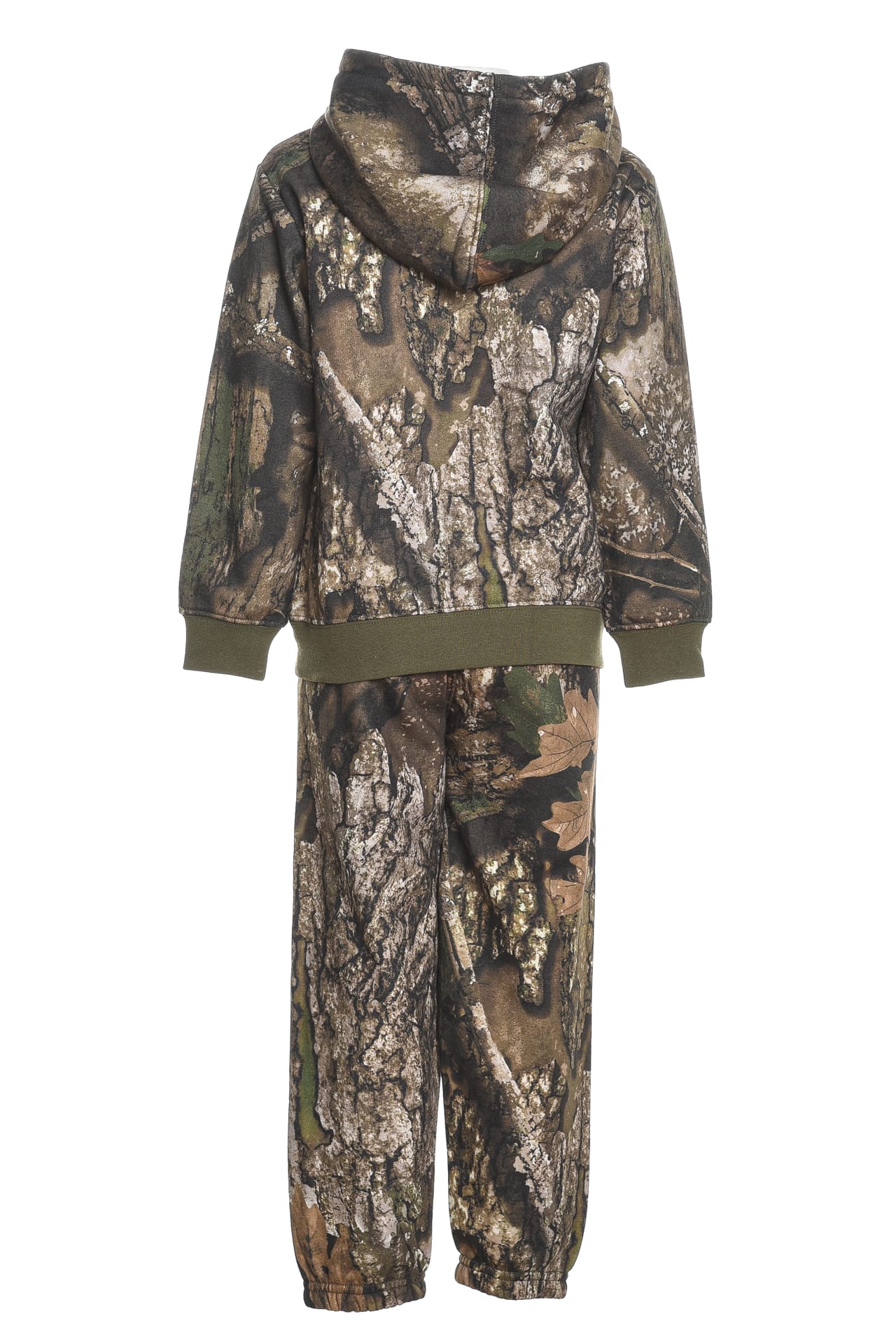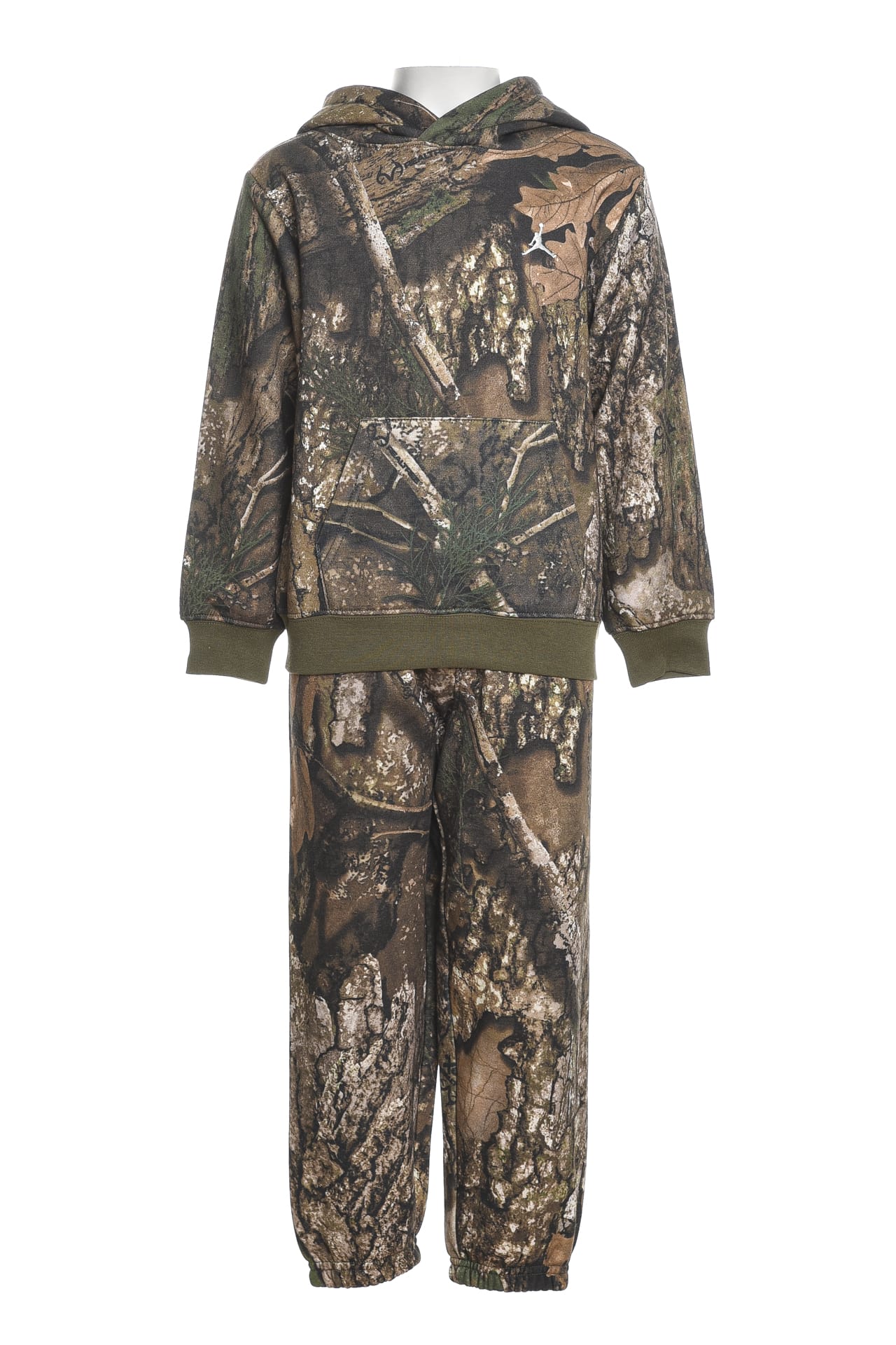 Tuta Jordan Leaves Camu da bambino in tessuto invernale di misto cotone e poliestere stampata a fantasia foliage camouflage composta da - felpa con cappuccio fisso, mini Jumpman ricamato sul petto, tascone a marsupio, polsini e cannolè in maglina - pantalone con elastico a tre bande in vita, piccolo monogramma Jd ricamato sulla gamba e polsini elasticizzati