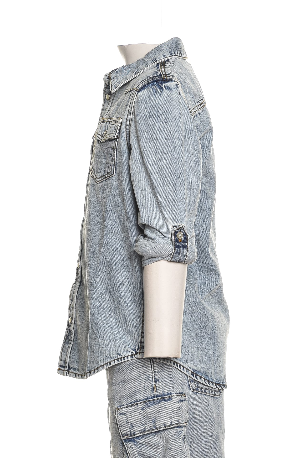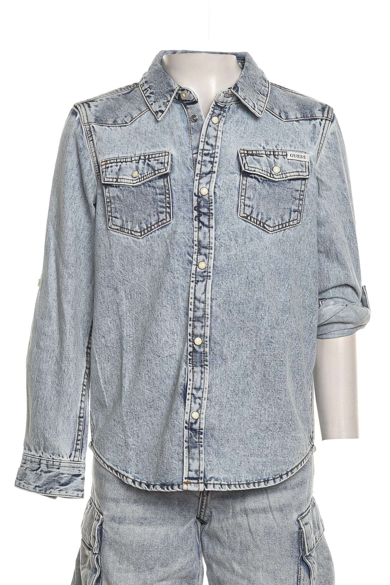 Camicia Jeans Guess Adj Ls Shirt da bambino in denim di cotone sottoposto a trattamento vintage per un aspetto vissuto, con collo italiano, bottoni a pressione in madreperla, tasche con patta e applicate sul petto, carrè sulla schiena, maniche lunghe regolabili da fascetta interna, polsini ad un bottone e fondo stondato
