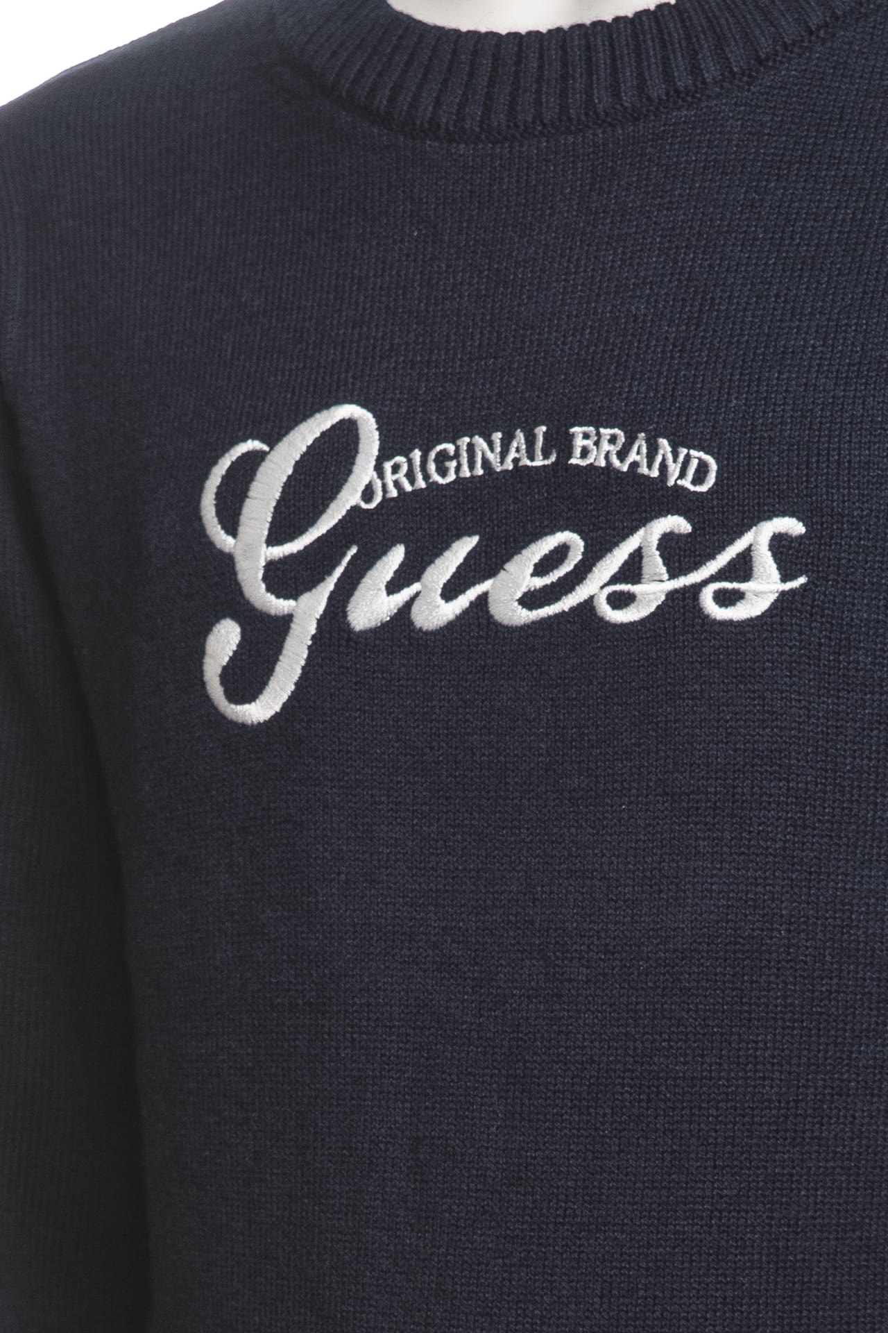 Maglia Guess Ls Sweat Ceremony da bambino in filato rasato di cotone modal e poliammide, con maxi ricamo firma logo sul petto, girocollo polsini e cannolè a costine