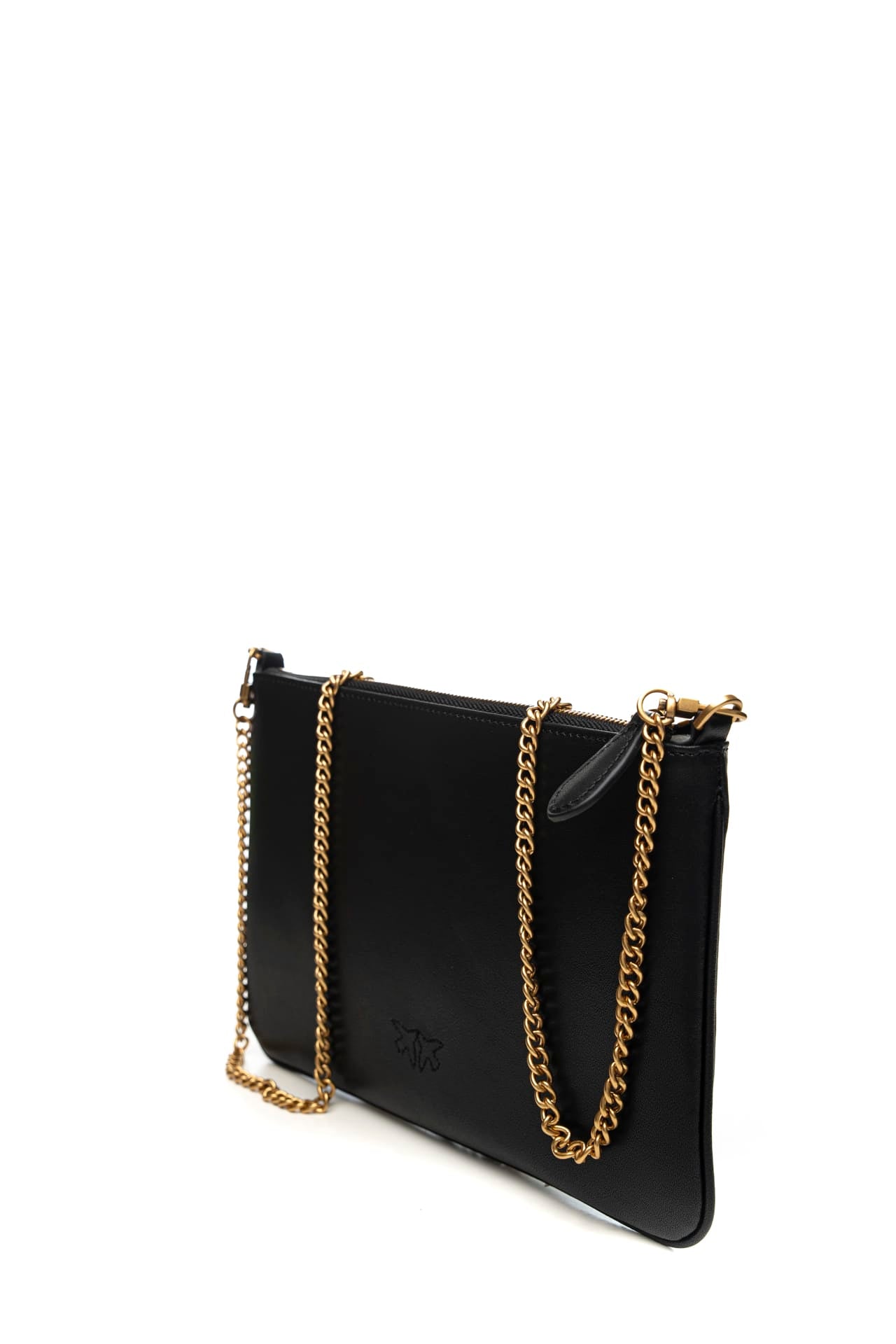 Borsa Pinko Classic Flat Love Bag Simply Gold da donna in pelle mano seta, a busta, con chiusura zip, fodera in polycotone, piccola iconica placchetta Love Birds Diamond Cut e tracolla rimovibile in catena di metallo oro anticato Misure: 25x2x16 cm