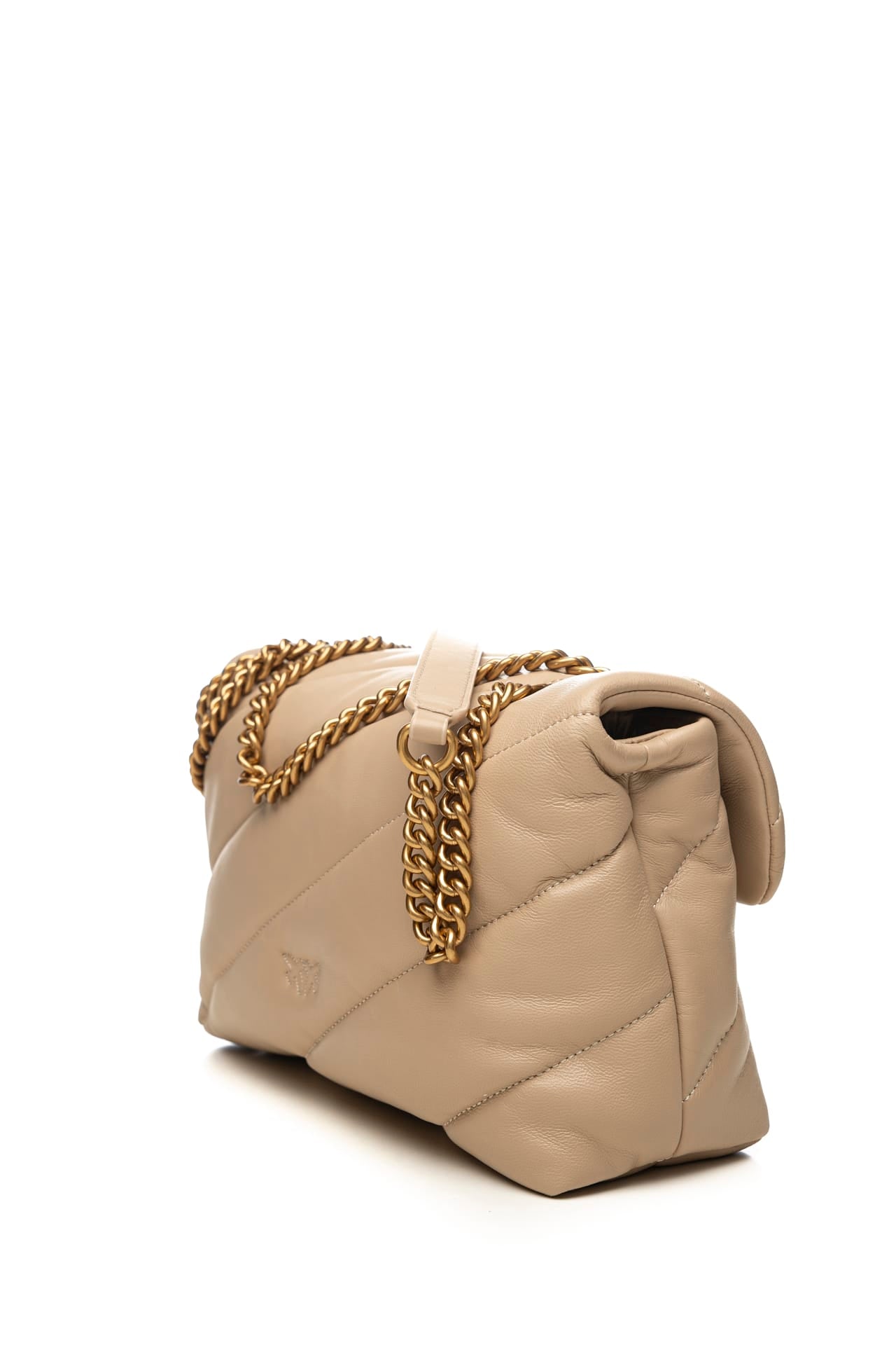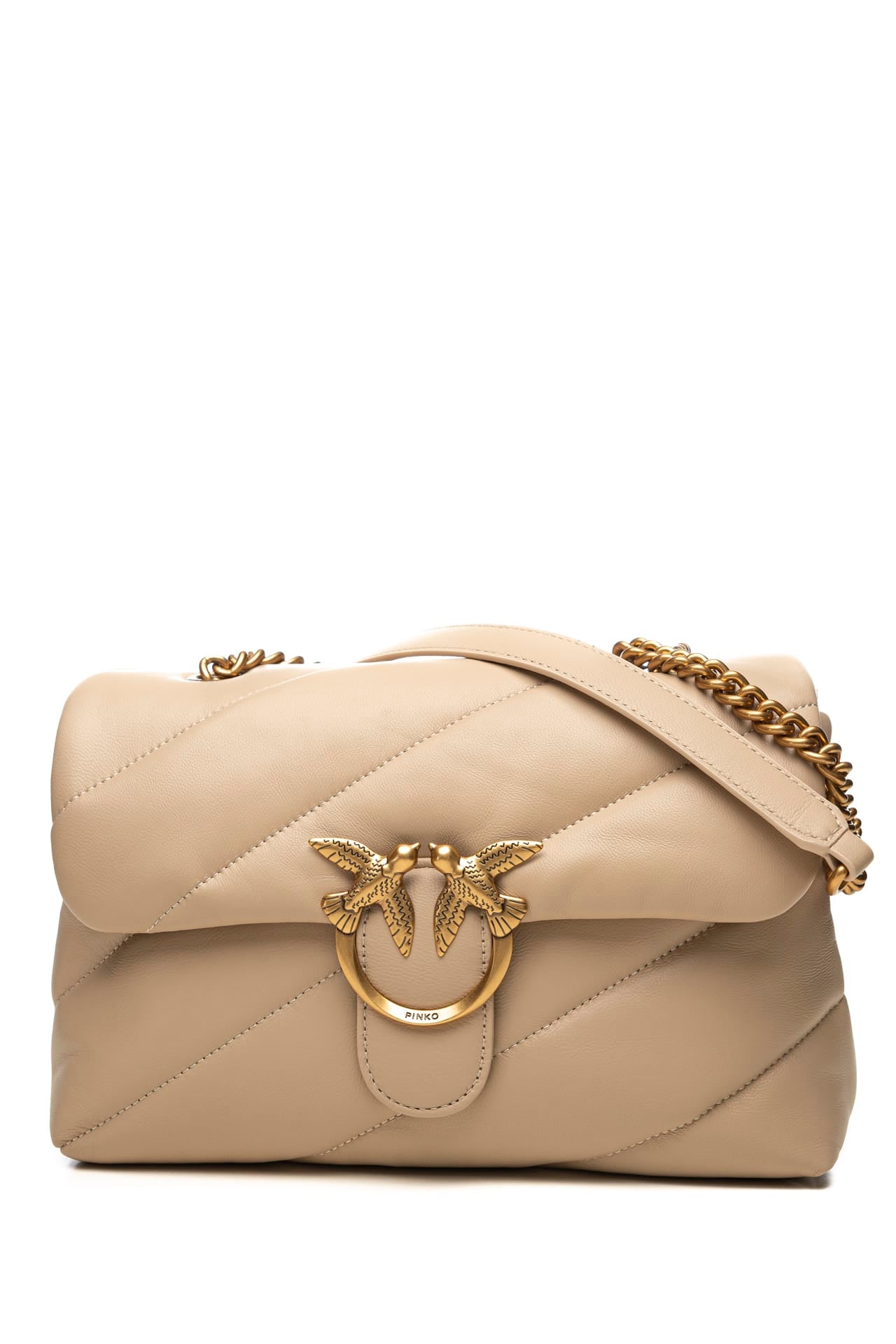 Borsa Pinko Love Puff Classic Sheep Gold da donna in pelle trapuntata diagonale, con fodera in microfibra ad effetto scamosciato,chiusura a incastro scorrevole, iconica fibbia Love Birds Diamond Cut sulla patta e tracolla regolabile in catena di metallo oro anticato Misure: 26x11x17 cm