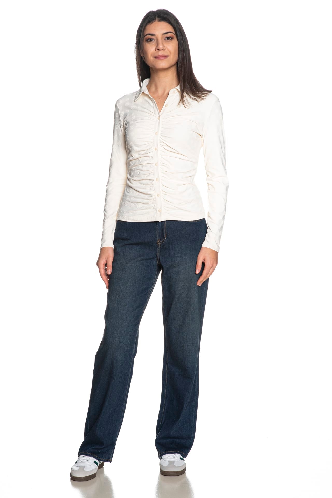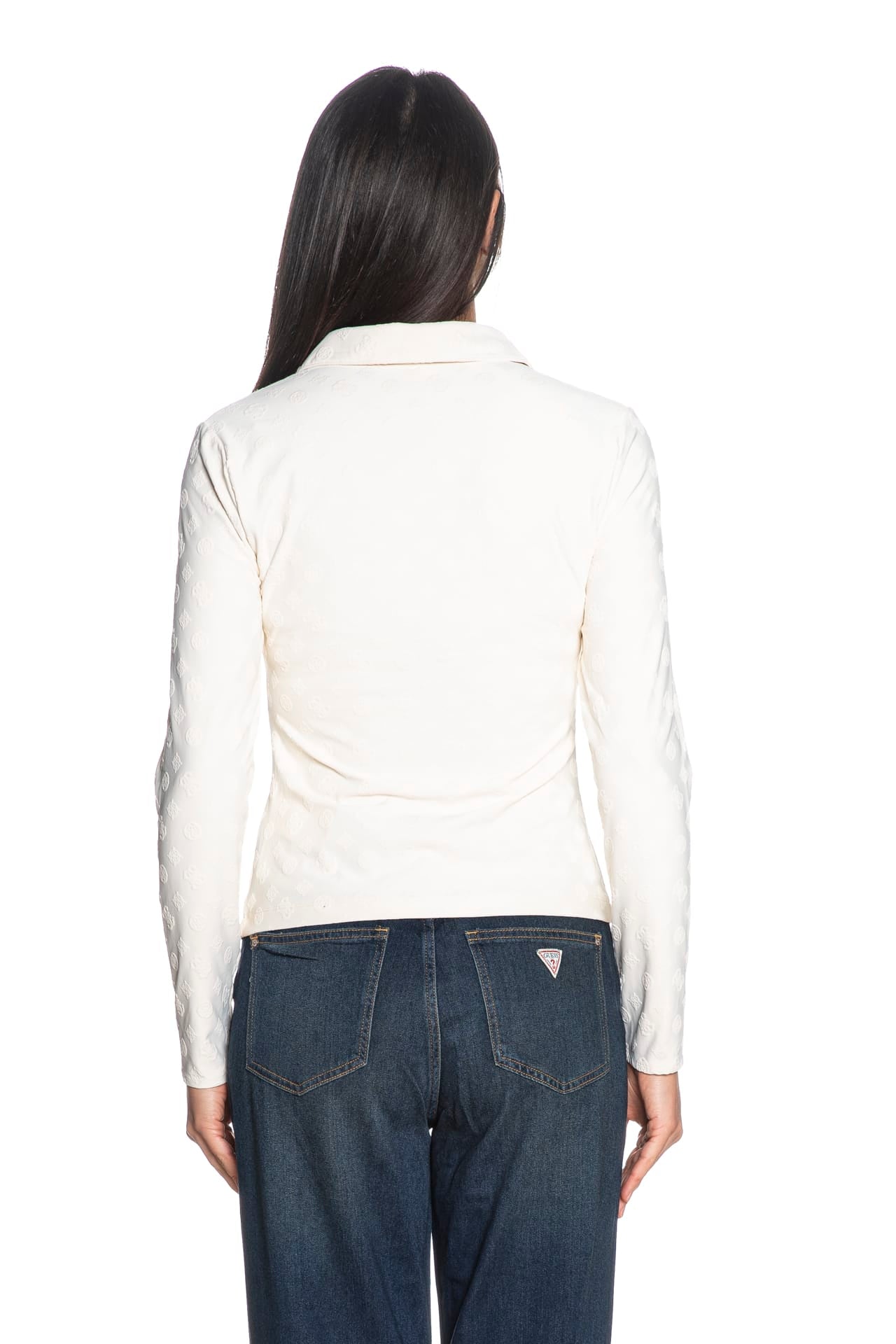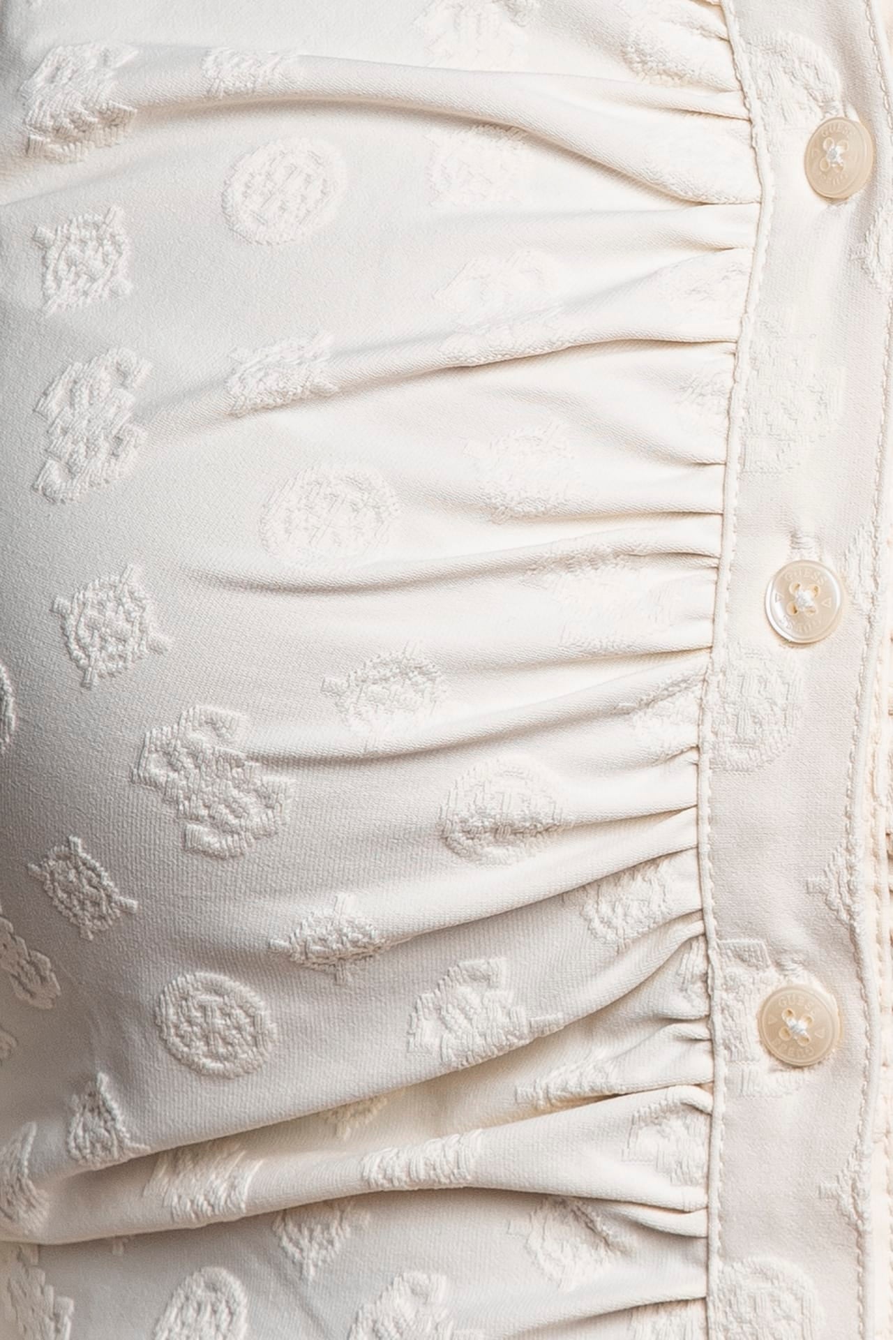Camicia Guess Shirring Nyna Top da donna in tessuto stretch di poliammide con loghi 4G allover jacquard tono su tono, a manica lunga, con collo italiano, arricciature lungo l'abbottonatura centrale e fondo dritto