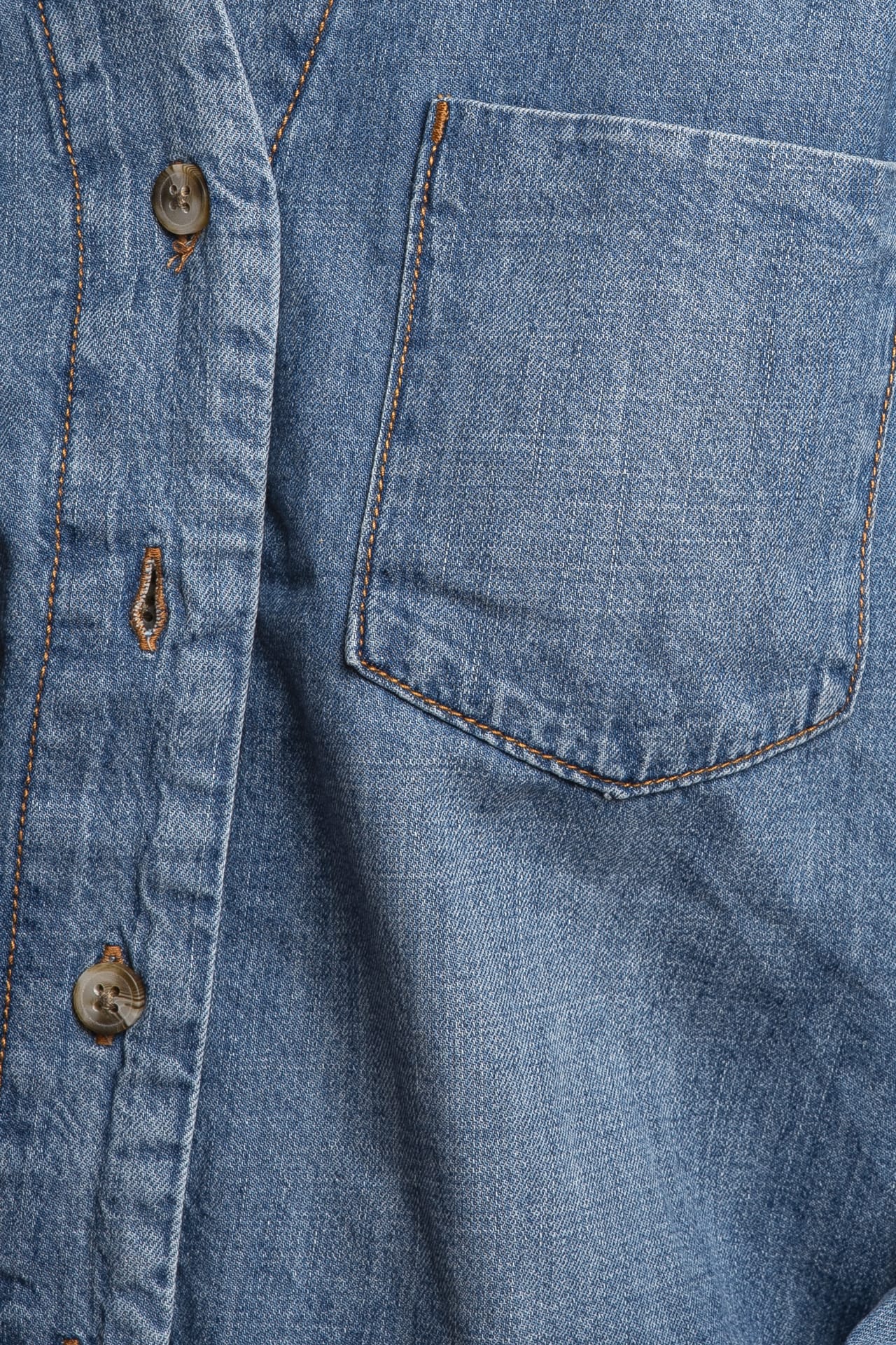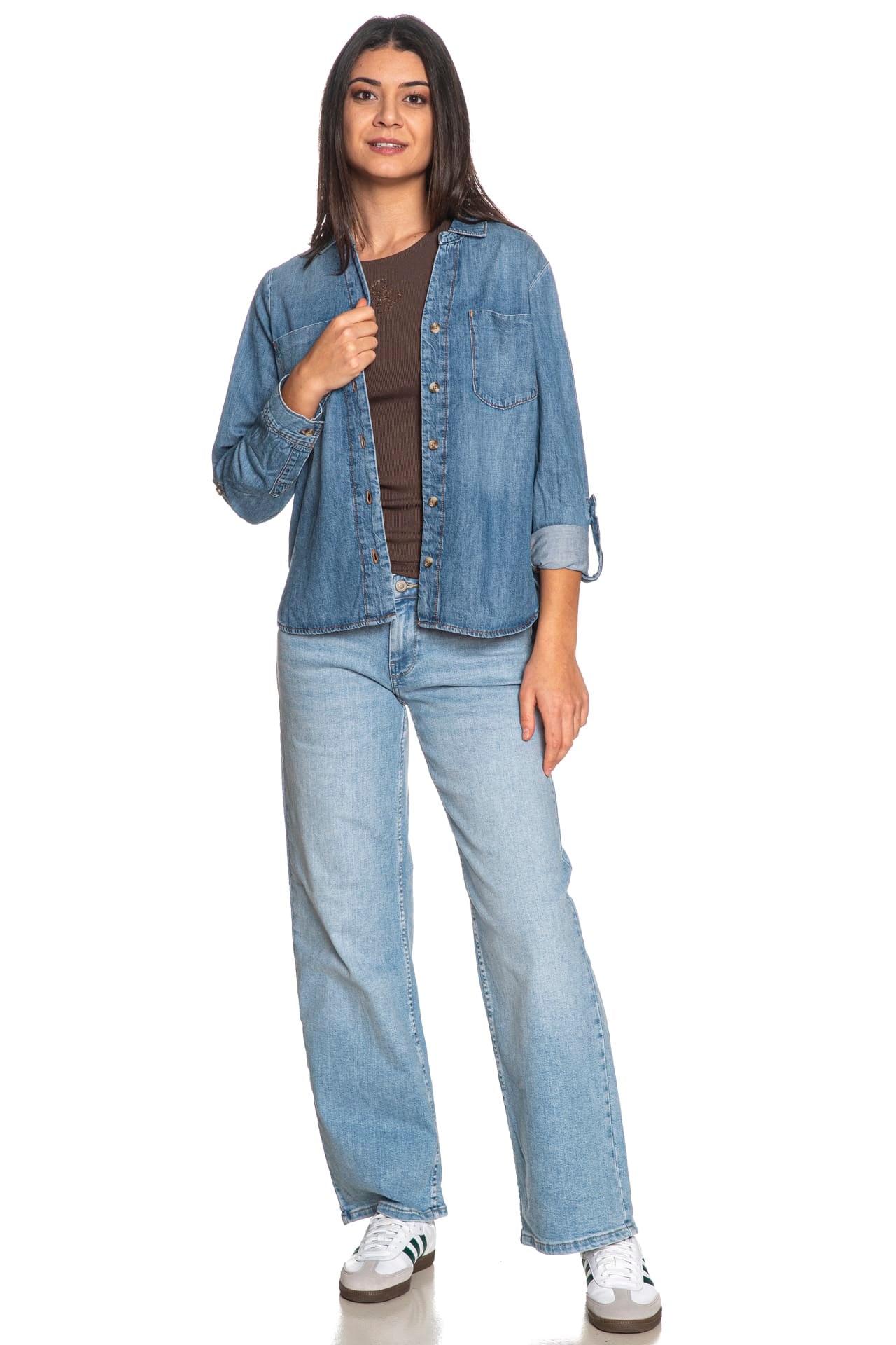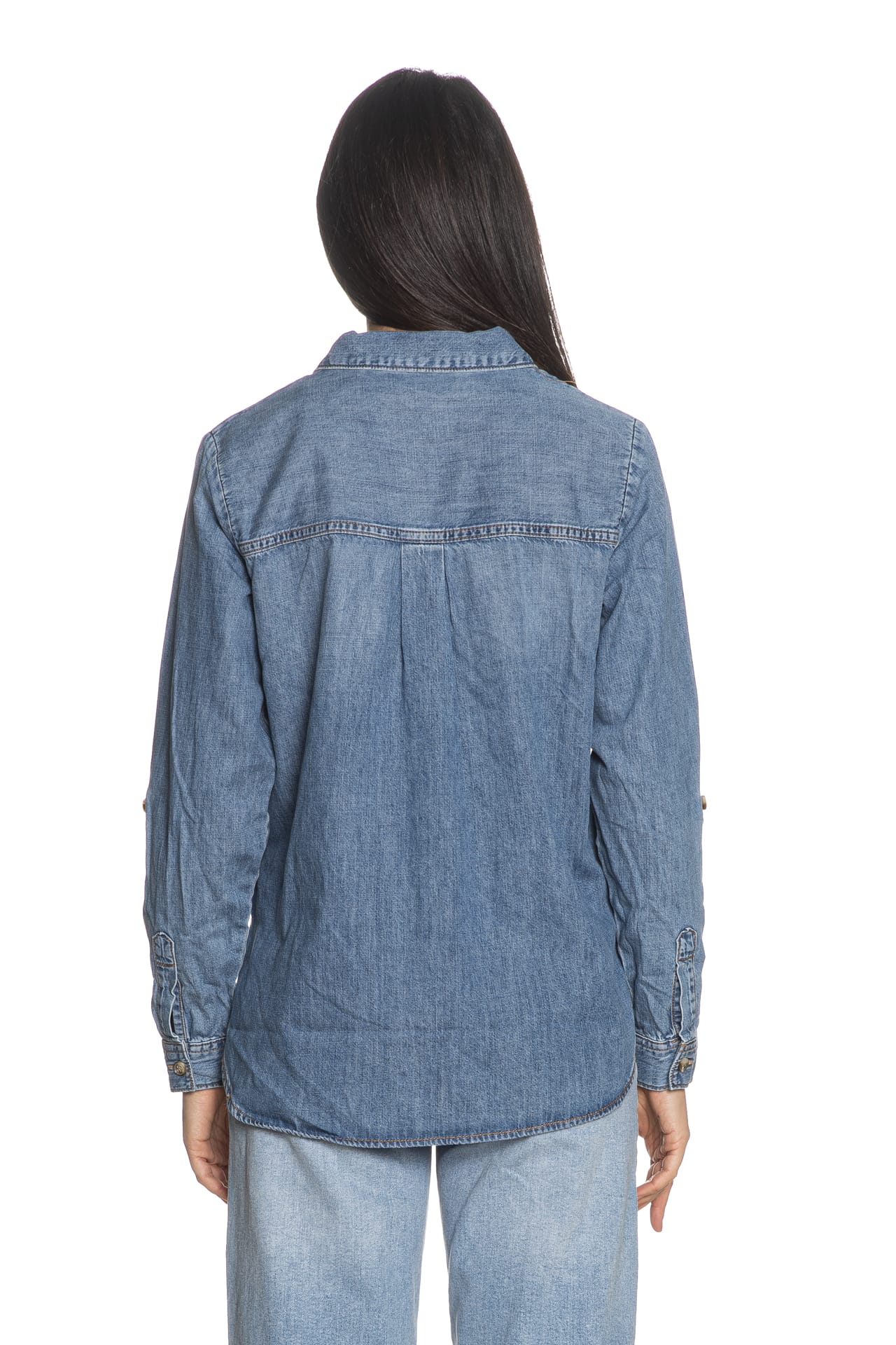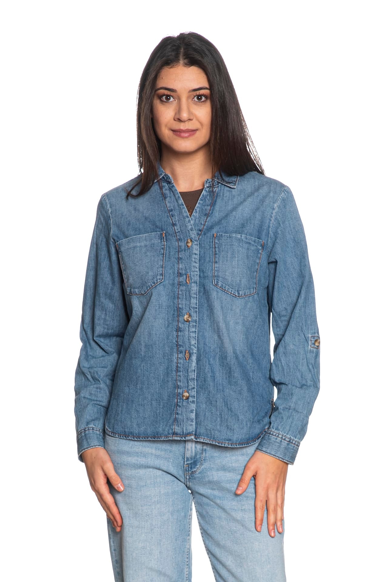 Camicia Jeans Only Yasmin Shirt Dnm da donna in denim di cotone sottoposto a trattamento per una finitura di colore used, con collo italiano aperto sullo scollo a V, tasche applicate sul petto, manica lunga accorciabile e fondo stondato più lungo sul retro