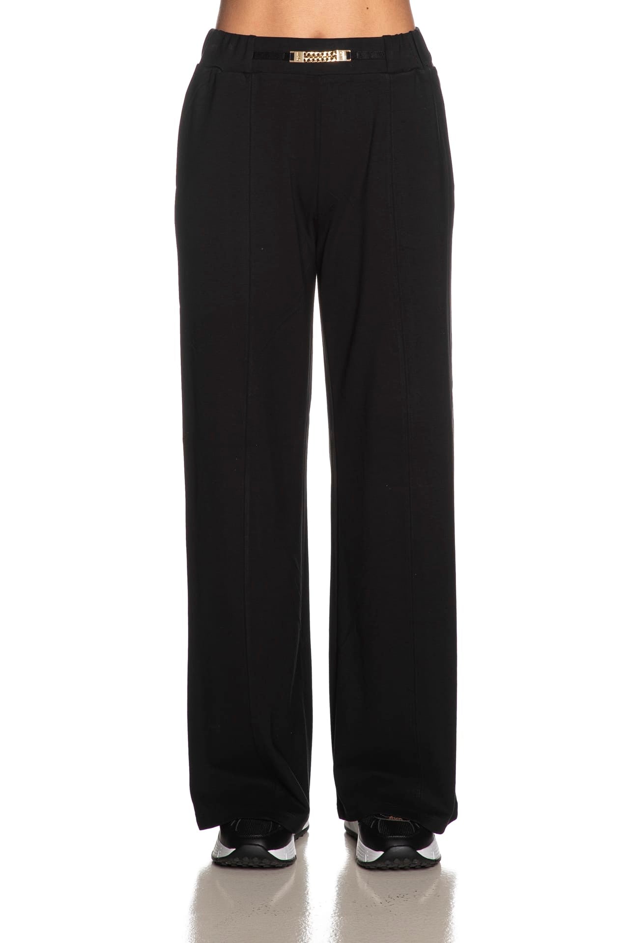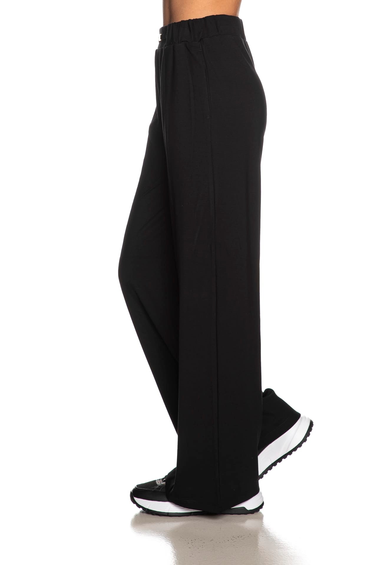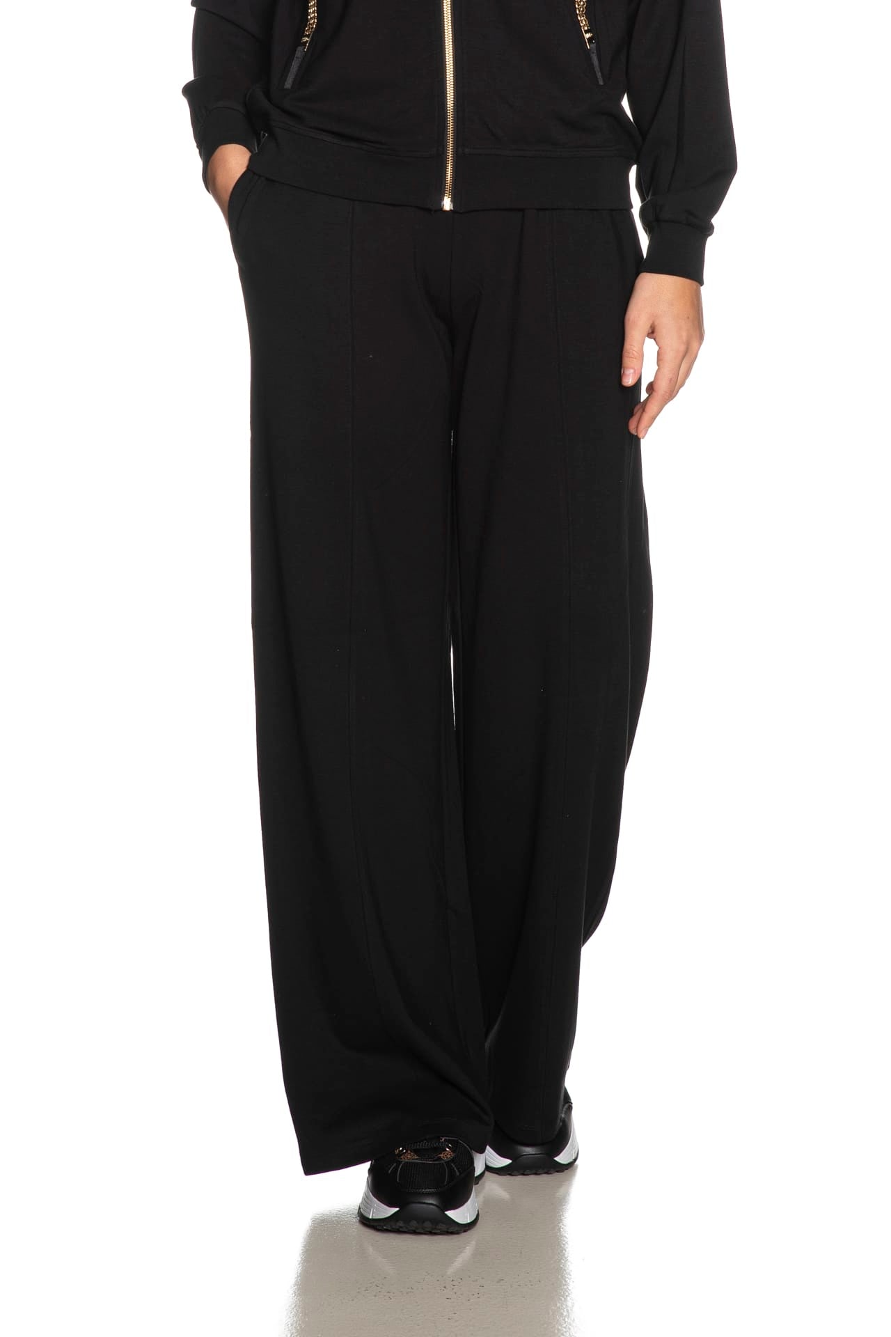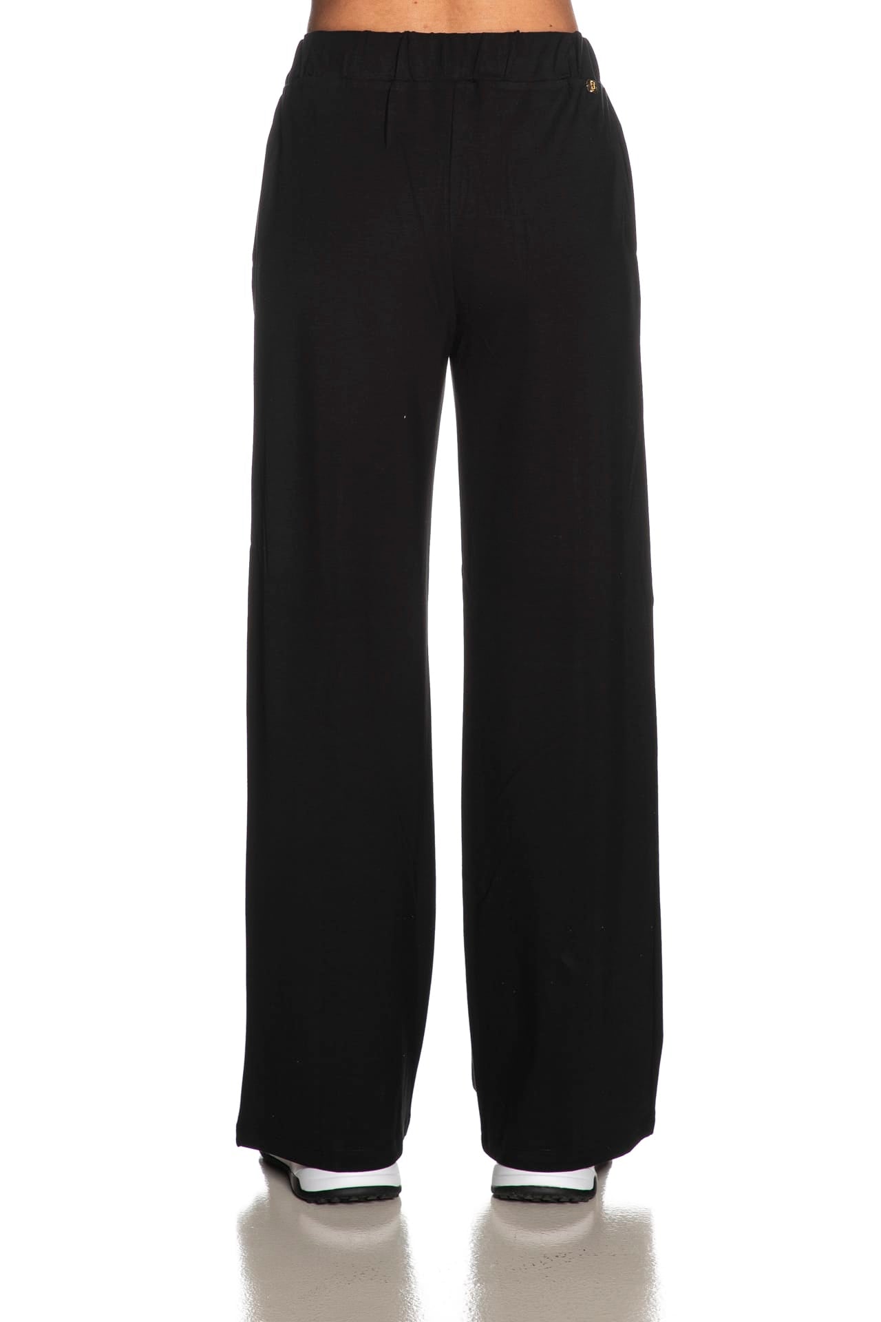 Pantalone Liu Jo Sport Mi Chain da donna in jersey punto milano stretch di viscosa e poliammide, wide fit, con dettaglio doppia catena logata sulla vita media elasticizzata, tasche a filo, mini tag logo metallico applicato posteriormente e cucitura nel centro della gamba ampia