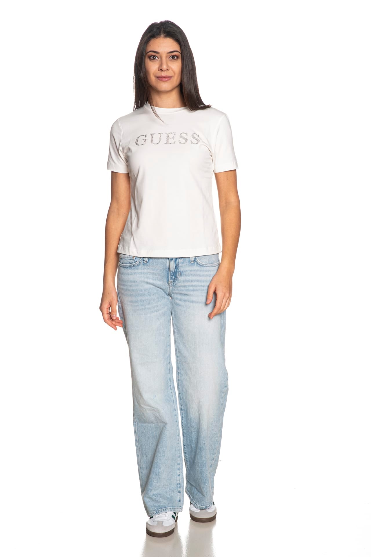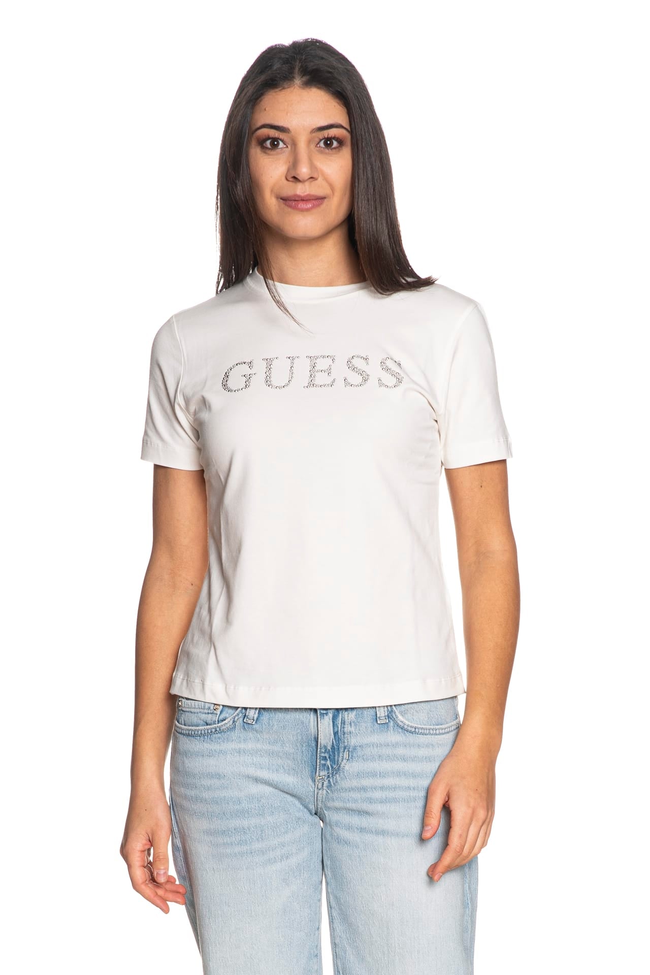 T shirt Guess Octavia Ss Tee da donna in jersey di cotone stretch, girocollo a manica corta, con logo lettering in micro borchie acciaio