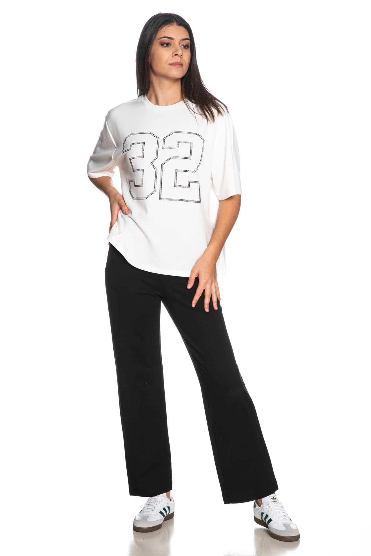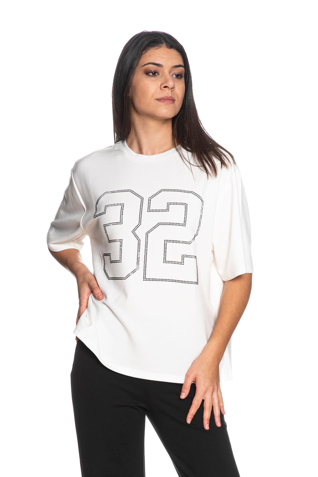 T shirt Jdy Nila Ss Tee da donna in tessuto stretch di misto poliestere e viscosa, oversize fit girocollo a manica corta, con macro numero outline in strass a contrasto colore