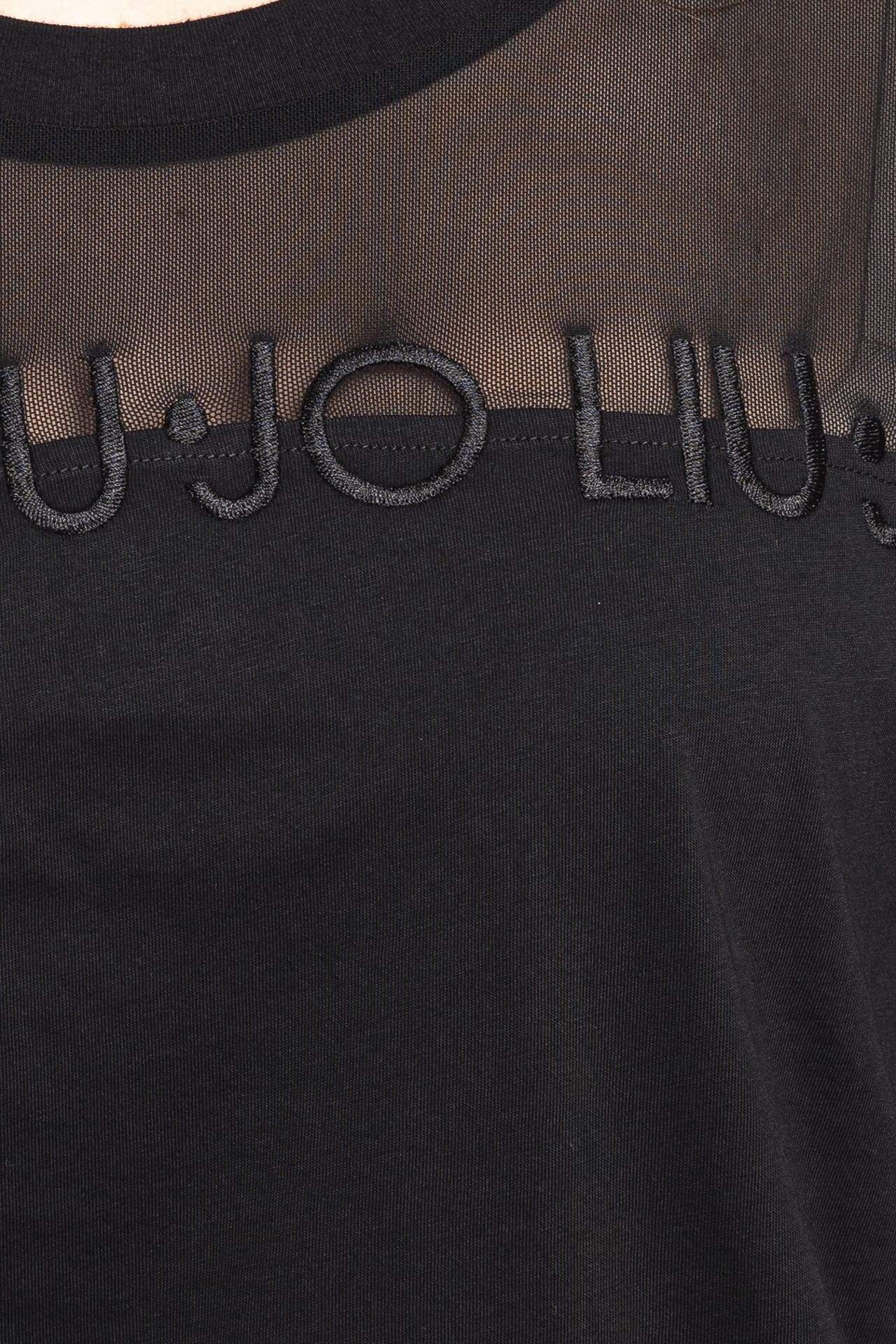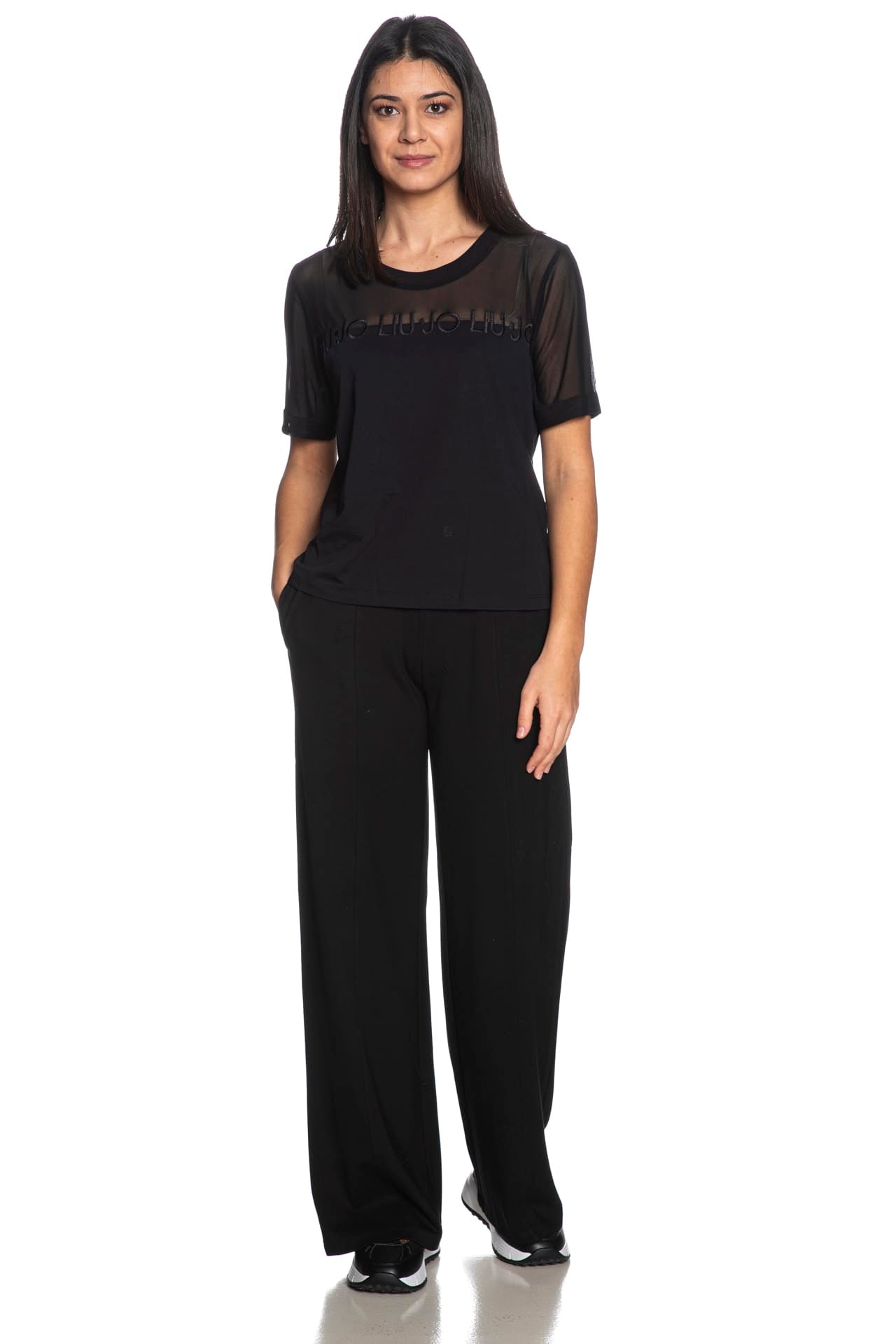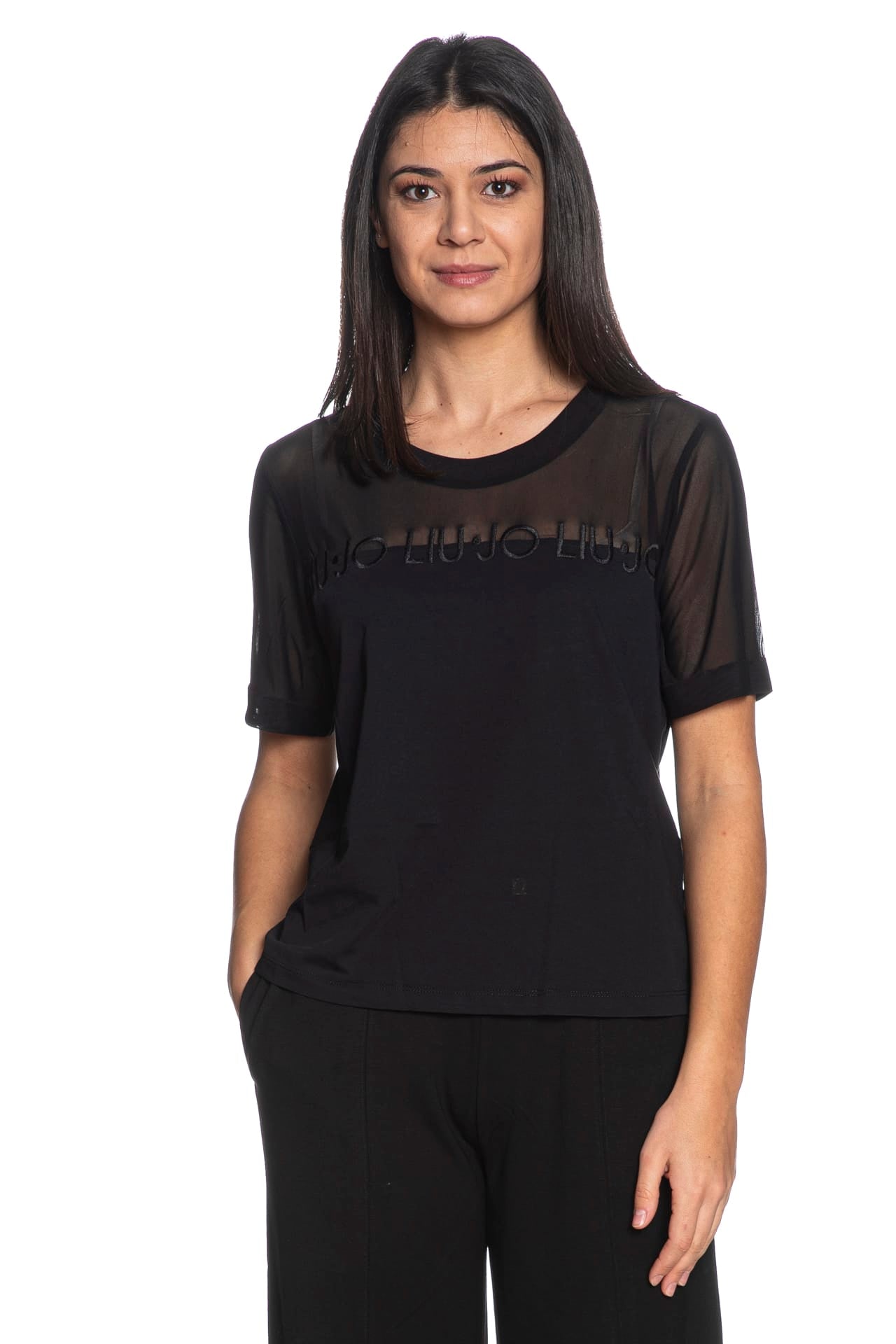 T-Shirt Liu Jo Sport Ssl J Mesh da donna in jersey di cotone e tulle stretch, relaxed fit a manica corta e spalla scesa, con lettering logo ricamato sul petto e girocollo in maglia a costine