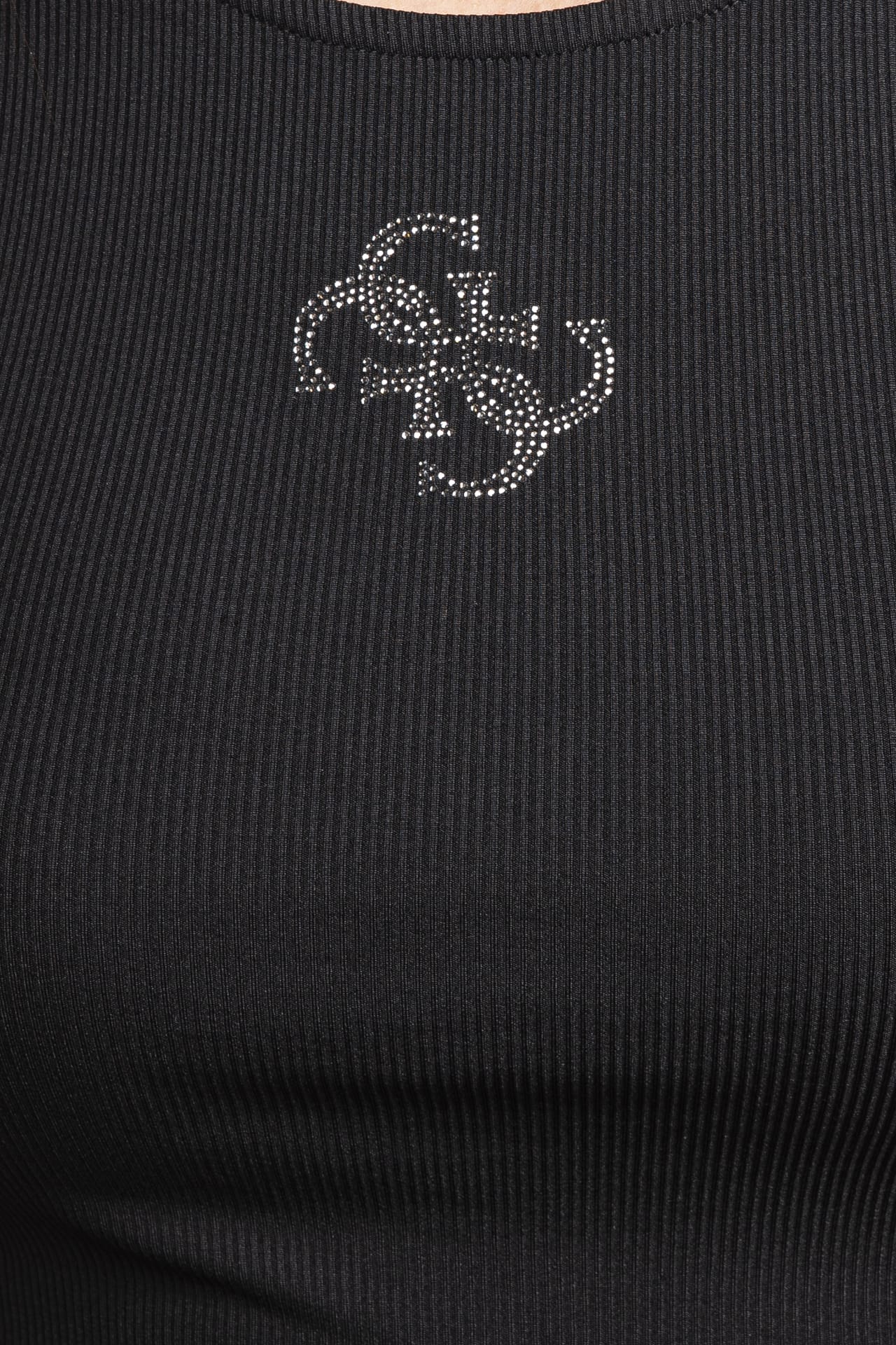 Top Canotta Guess Guendalina da donna in maglia a costine di poliestere stretch, con scollo all'americana tondo e piccolo logo 4G in micro strass a centro petto