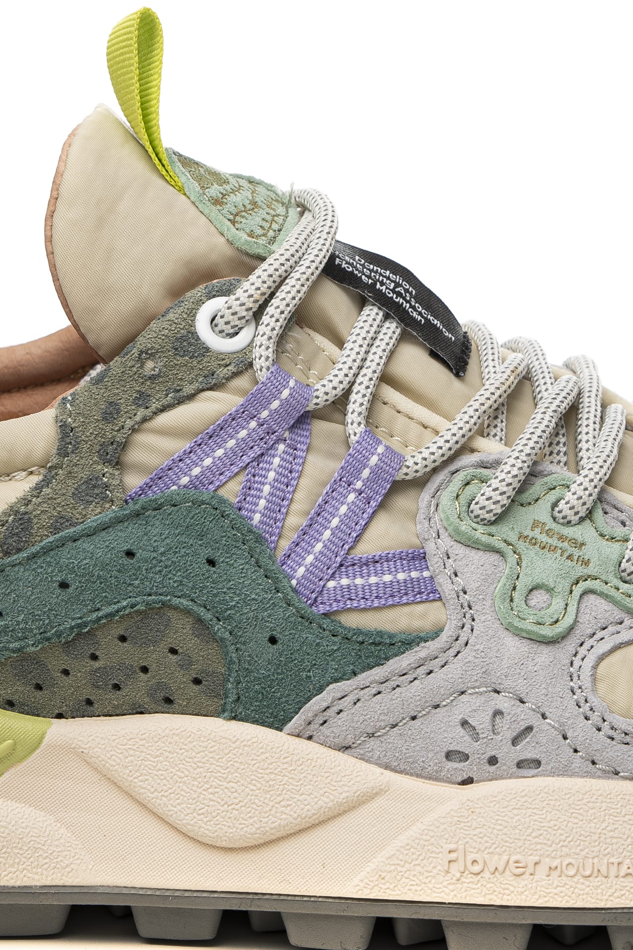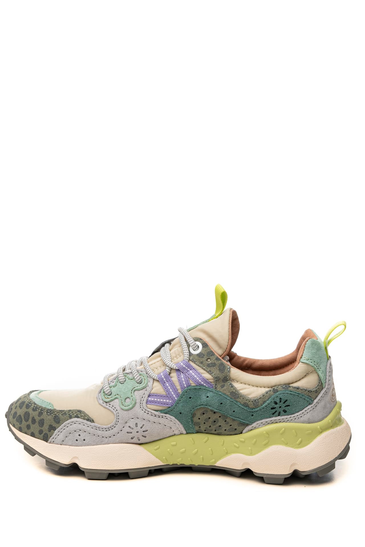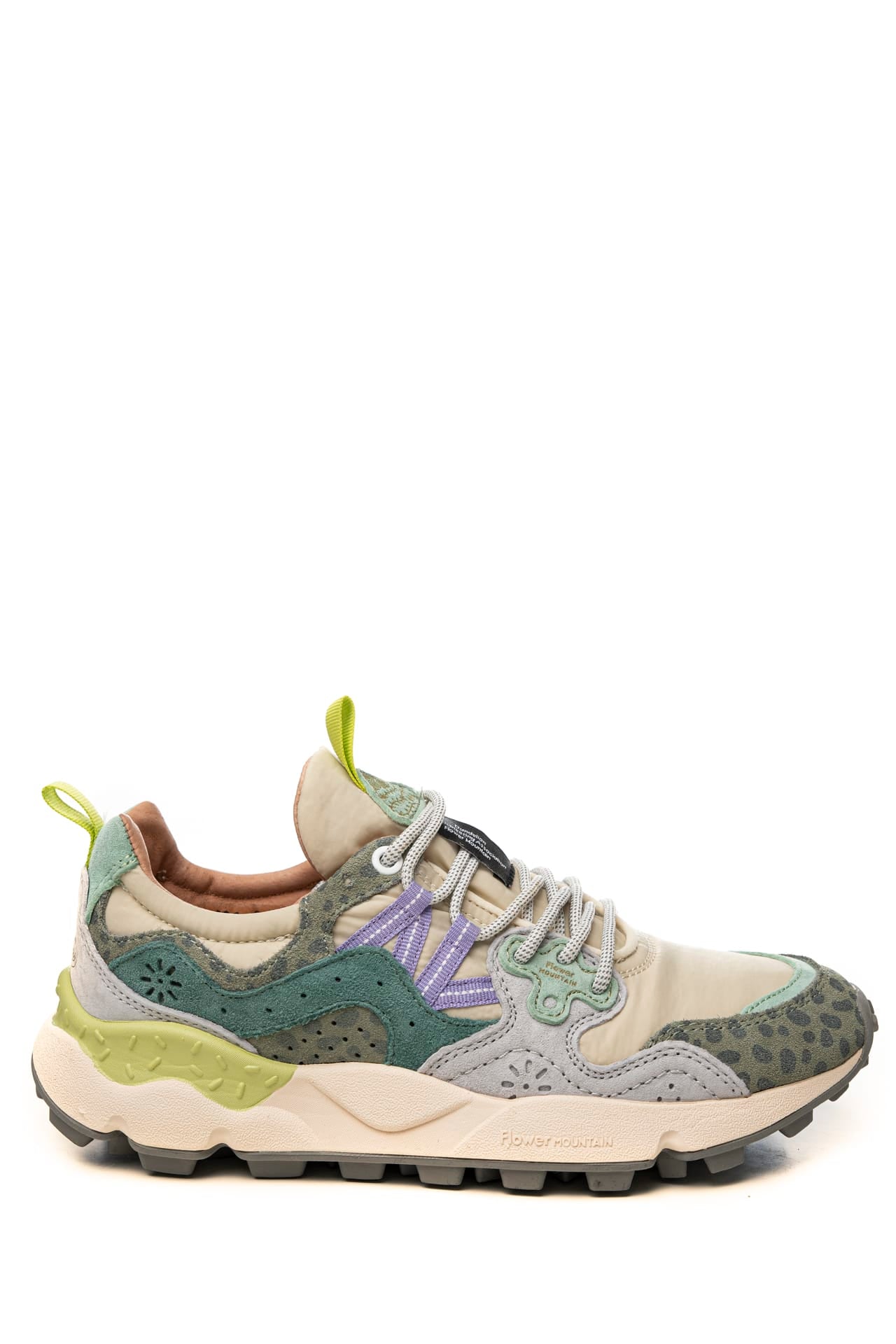 Scarpa Flower Mountain Yamano 3 W da donna dal design sportivo realizzata con tecnologia Microban che previene la formazione di muffe e allontana i batteri rendendo la calzatura durevole nel tempo, modello sneaker stile trekking con tomaia in nylon e dettagli in suede liscia e traforata scamosciata multicolor, allacciatura ghillie mediante passanti anzichè occhielli a lacci tubolari, occhielli rinforzati, fettuccia su linguetta e tallone per facilitare la calzata, soletta interna in sughero naturale antibatterico e fondo sagomato in gomma ultra leggera con battistrada dentellato