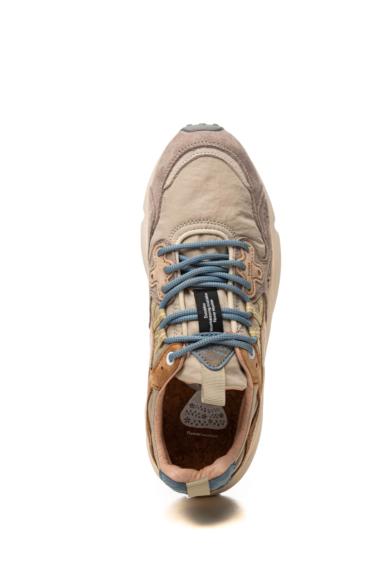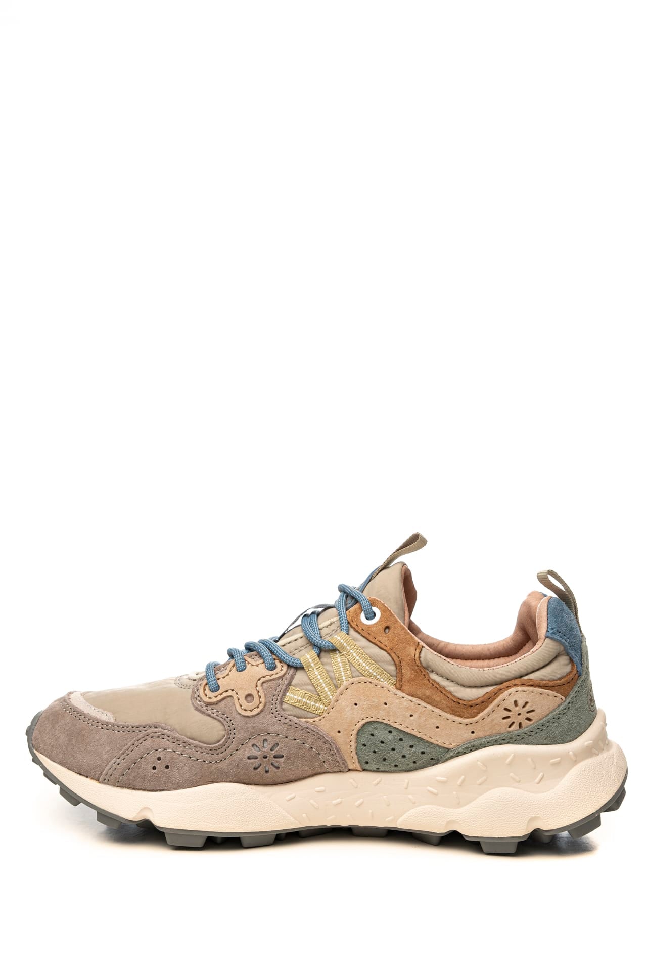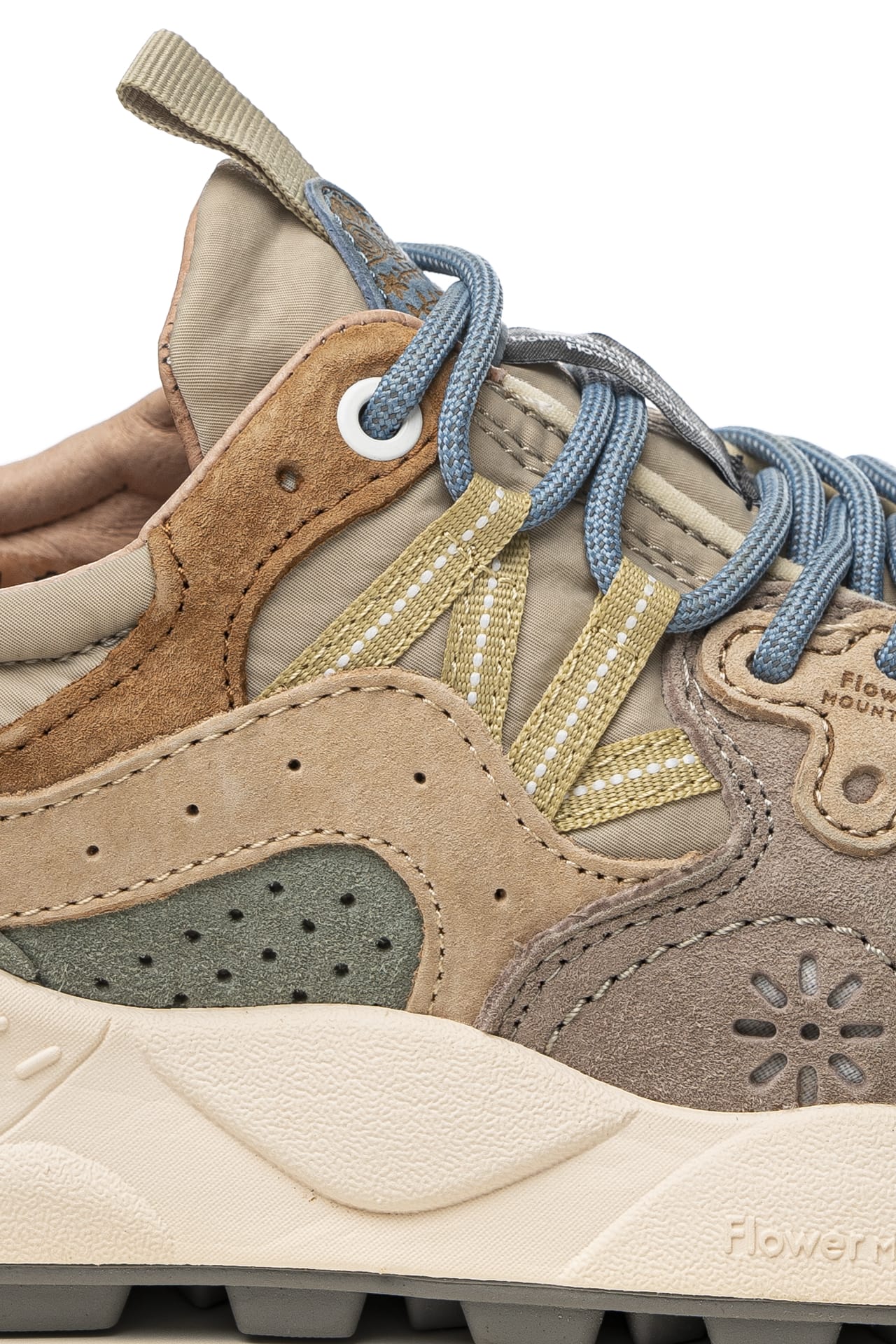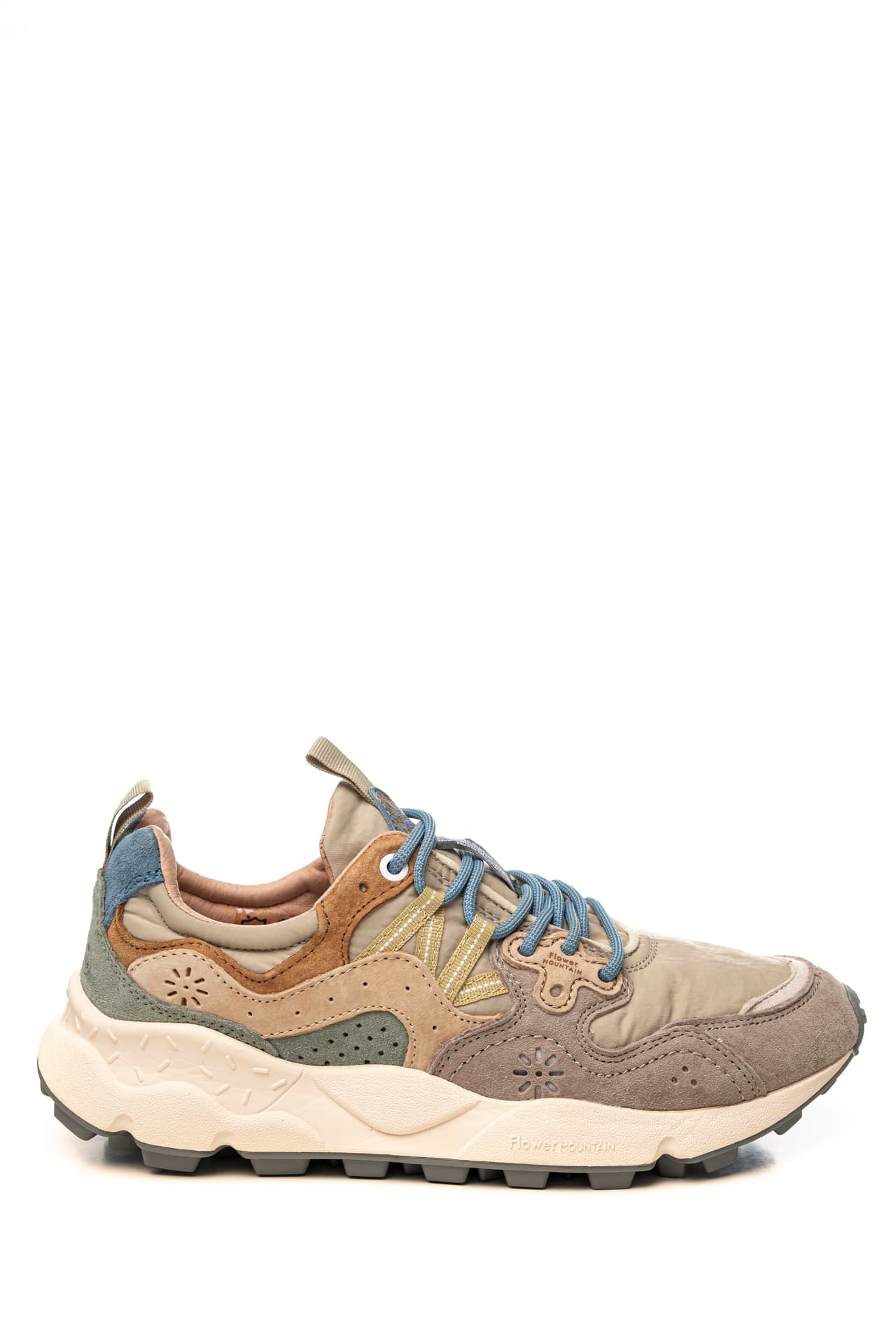 Scarpa Flower Mountain Yamano 3 Unisex dal design sportivo realizzata con tecnologia Microban che previene la formazione di muffe e allontana i batteri rendendo la calzatura durevole nel tempo, modello sneaker stile trekking con tomaia in nylon e dettagli in suede liscia e traforata scamosciata multicolor, allacciatura ghillie mediante passanti anzichè occhielli a lacci tubolari, occhielli rinforzati, fettuccia su linguetta e tallone per facilitare la calzata, soletta interna in sughero naturale antibatterico e fondo sagomato in gomma ultra leggera con battistrada dentellato