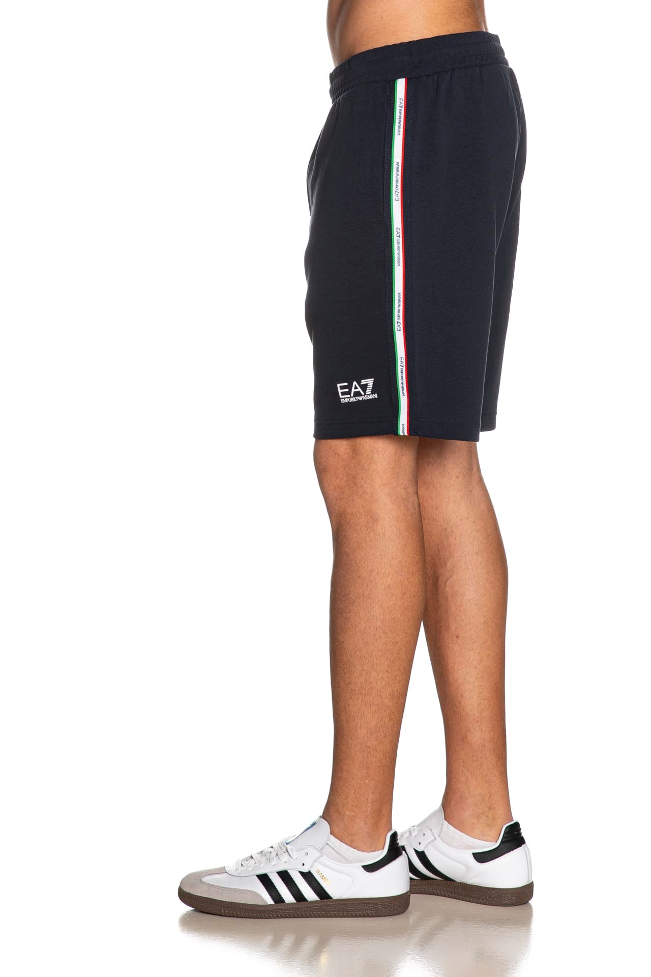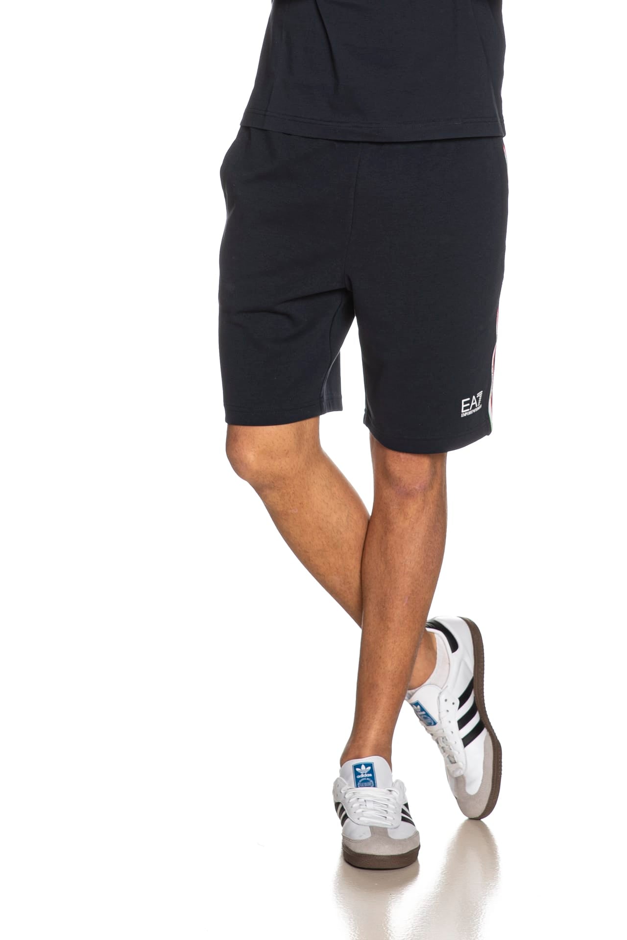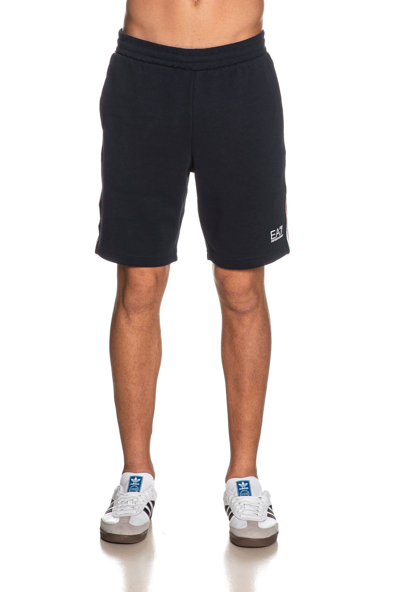 Bermuda Ea7 Italian Spirit da uomo in interlock di cotone e poliestere, con elastico e coulisse foderata in maglina in vita regolabile da cordino interno, tape tricolore logato laterale, tasche a filo e monogramma stampato gommato lucido a contrasto su una gamba