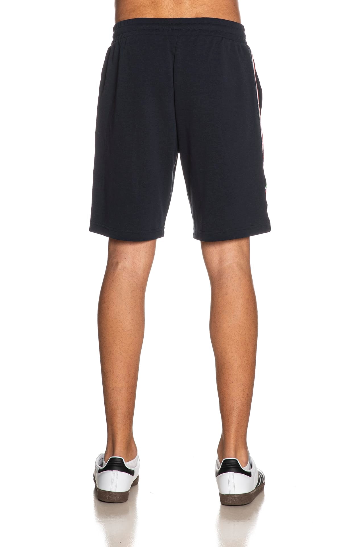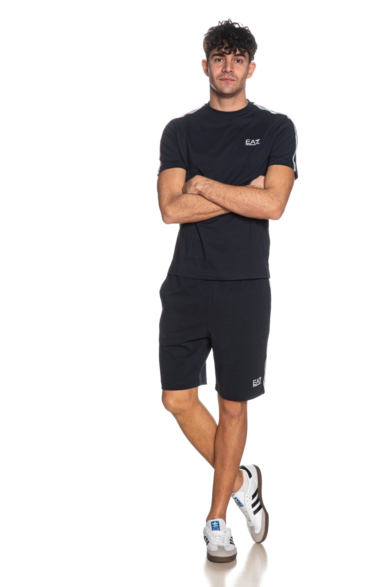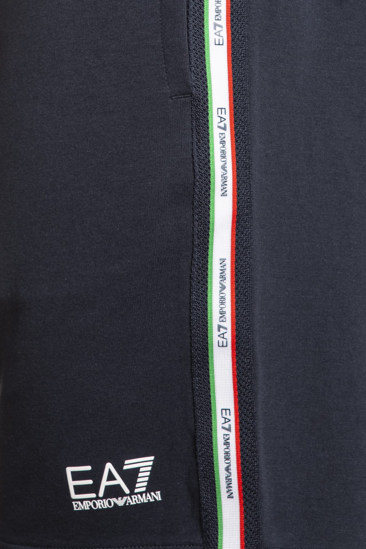 Bermuda Ea7 Italian Spirit da uomo in interlock di cotone e poliestere, con elastico e coulisse foderata in maglina in vita regolabile da cordino interno, tape tricolore logato laterale, tasche a filo e monogramma stampato gommato lucido a contrasto su una gamba
