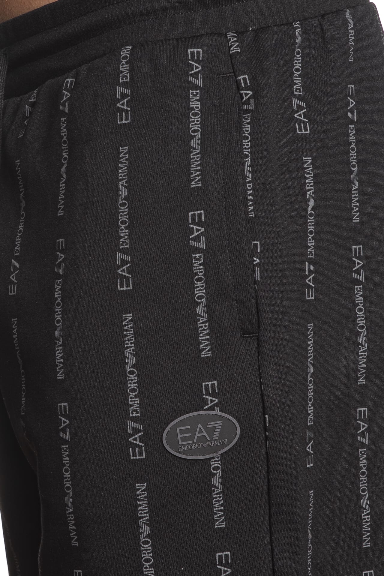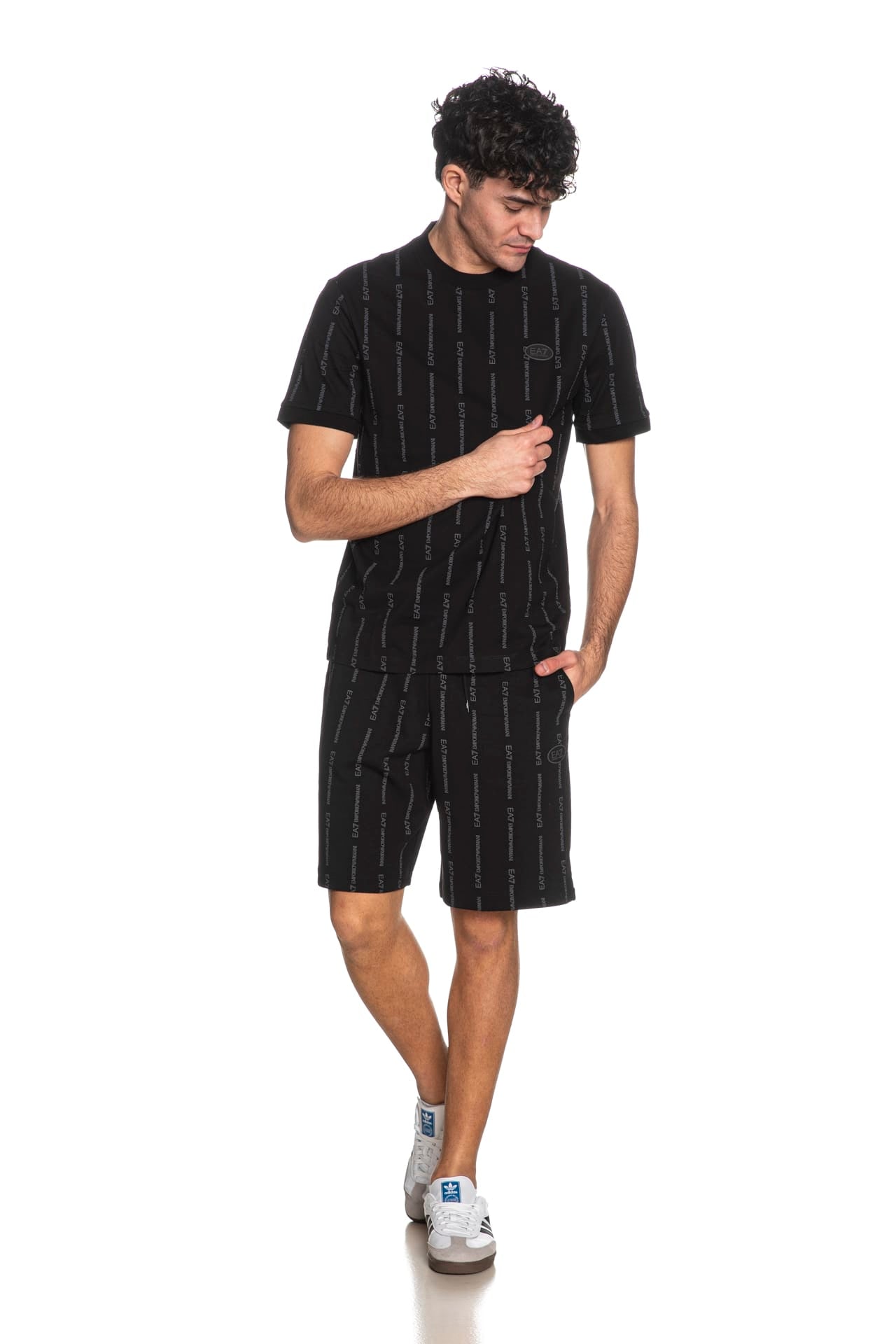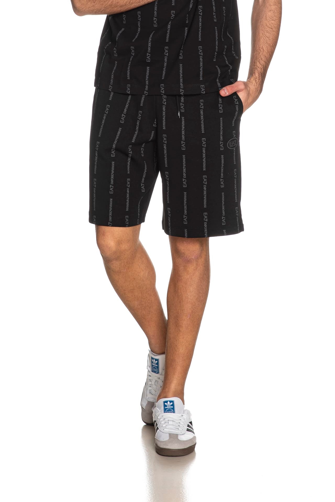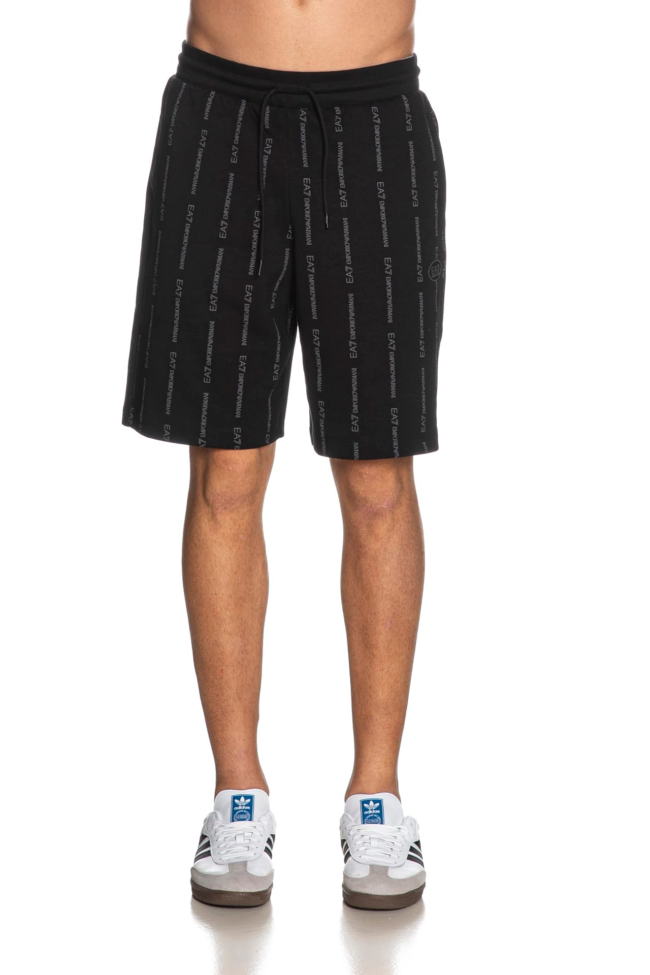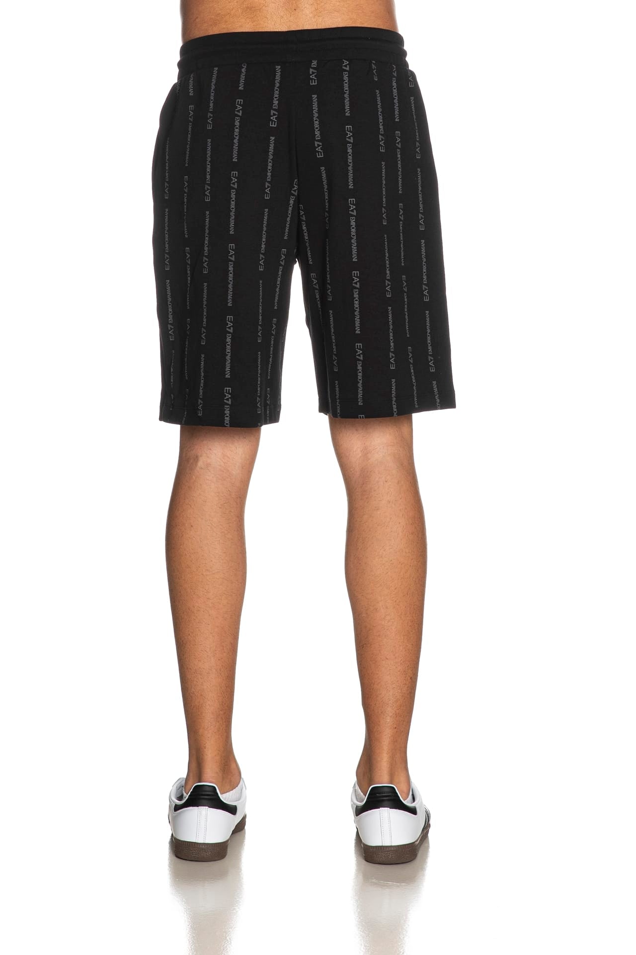 Bermuda Ea7 Train Graphic Series Lg Sh da uomo in interlock di cotone stampato allover con lettering logo a contrasto colore effetto rigato, con elastico e coulisse regolabile da cordino foderata in vita, tasche a filo e patch logo gommato su una gamba