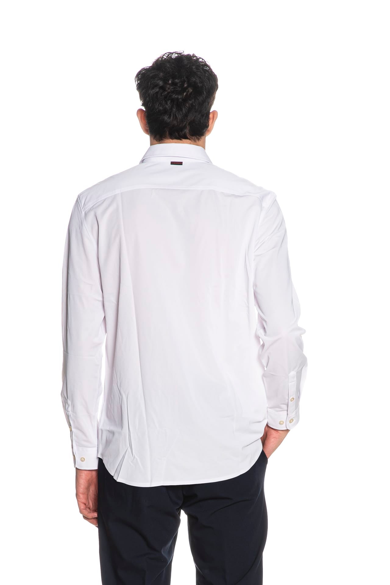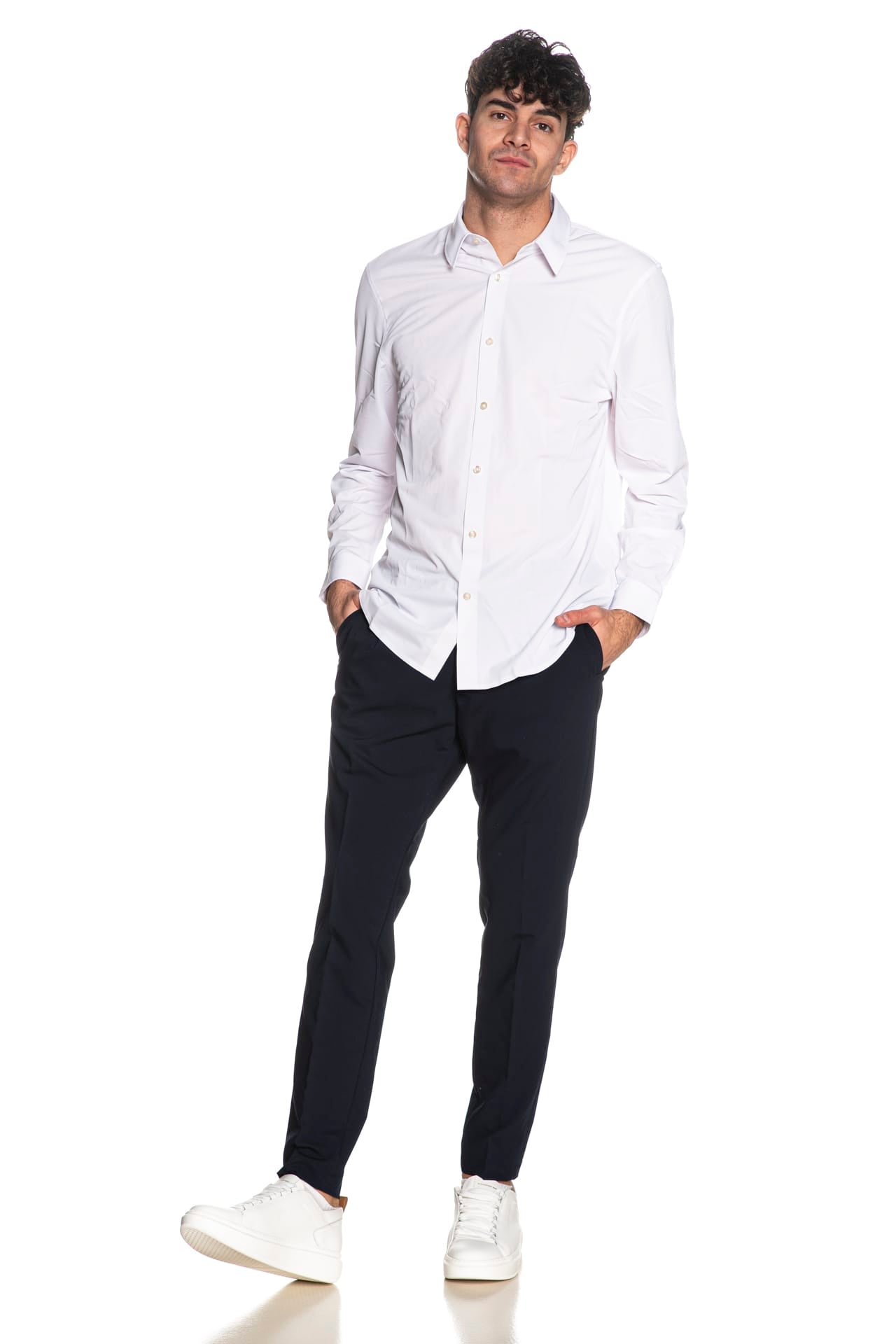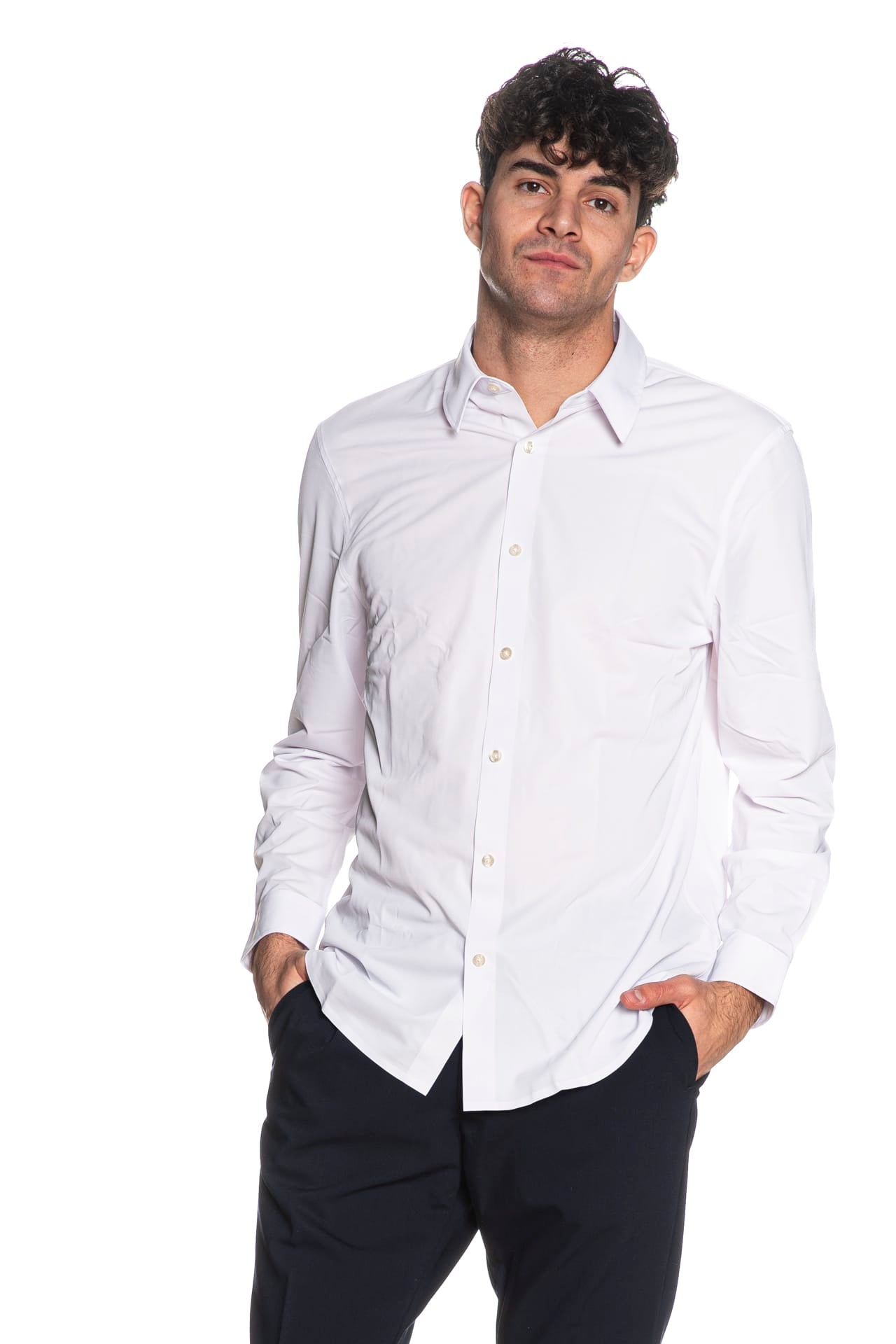Camicia Guess Ls Tech Solid Shirt da uomo in tessuto di poliestere parzialmente riciclato realizzato tramite tecniche innovative e fibre estensibili in ogni direzione che riprendono velocemente forma per un comfort ottimale, modello regular fit, con colletto italiano, abbottonatura full centrale senza cuciture, manica lunga, polsino a due bottoni con fessino abbottonabile e piega, fondo stondato e mini etichetta logo nel retro