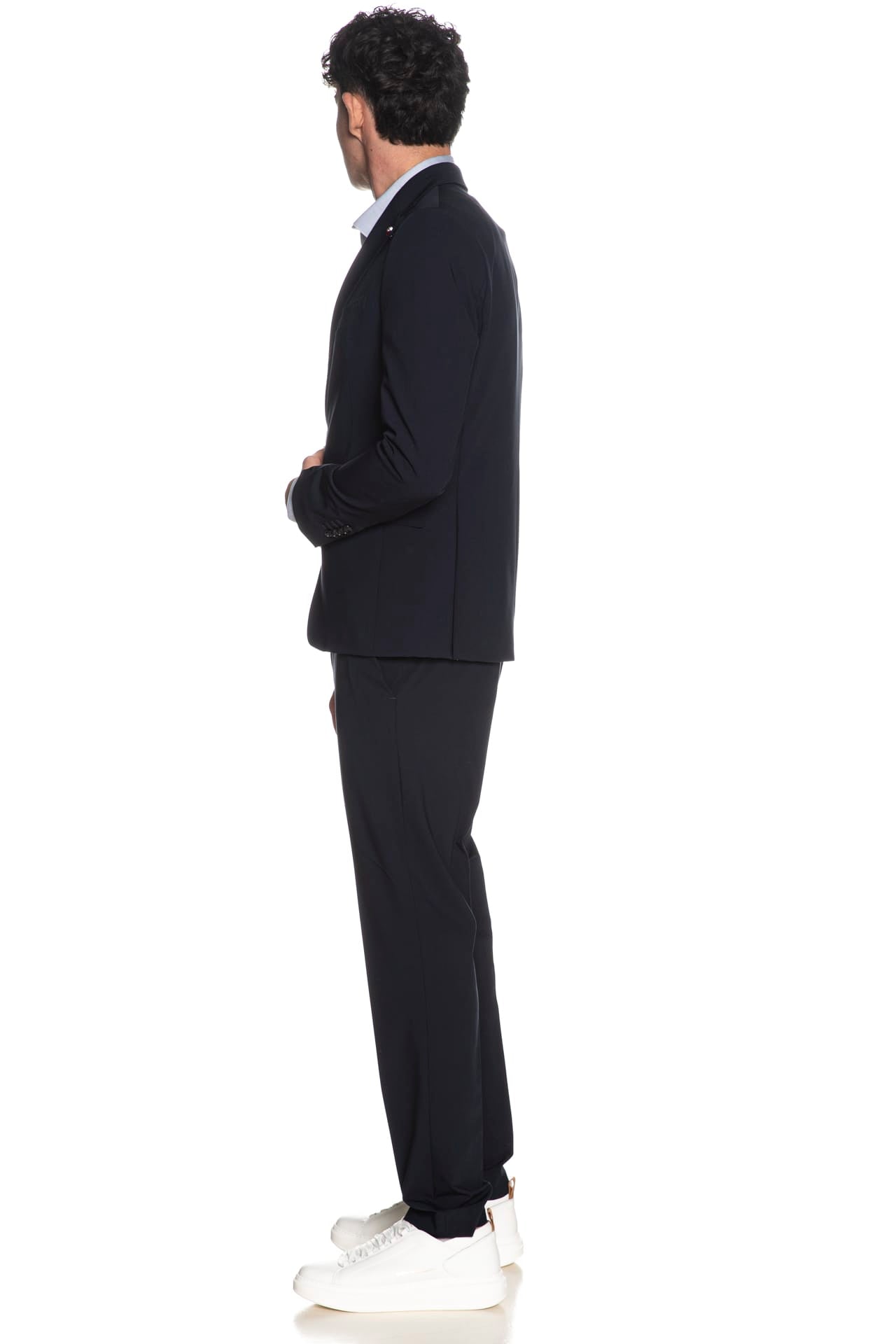 Completo Mulish Monet Ab72 da uomo in polyviscosa stretch drop 7 slim composto da: - Giacca modello blazer monopetto a due bottoni interamente foderata, con revers classici impunturati tono su tono, tasca sul petto a barchetta e tasche anteriori a filo con patta, spilla real smaltata con chiusura a farfalla all'asola e spacchetti posteriori - Pantalone modello chino con chiusura zip e gancetto a slitta coperti, tasche laterali america e tasche posteriori a filo