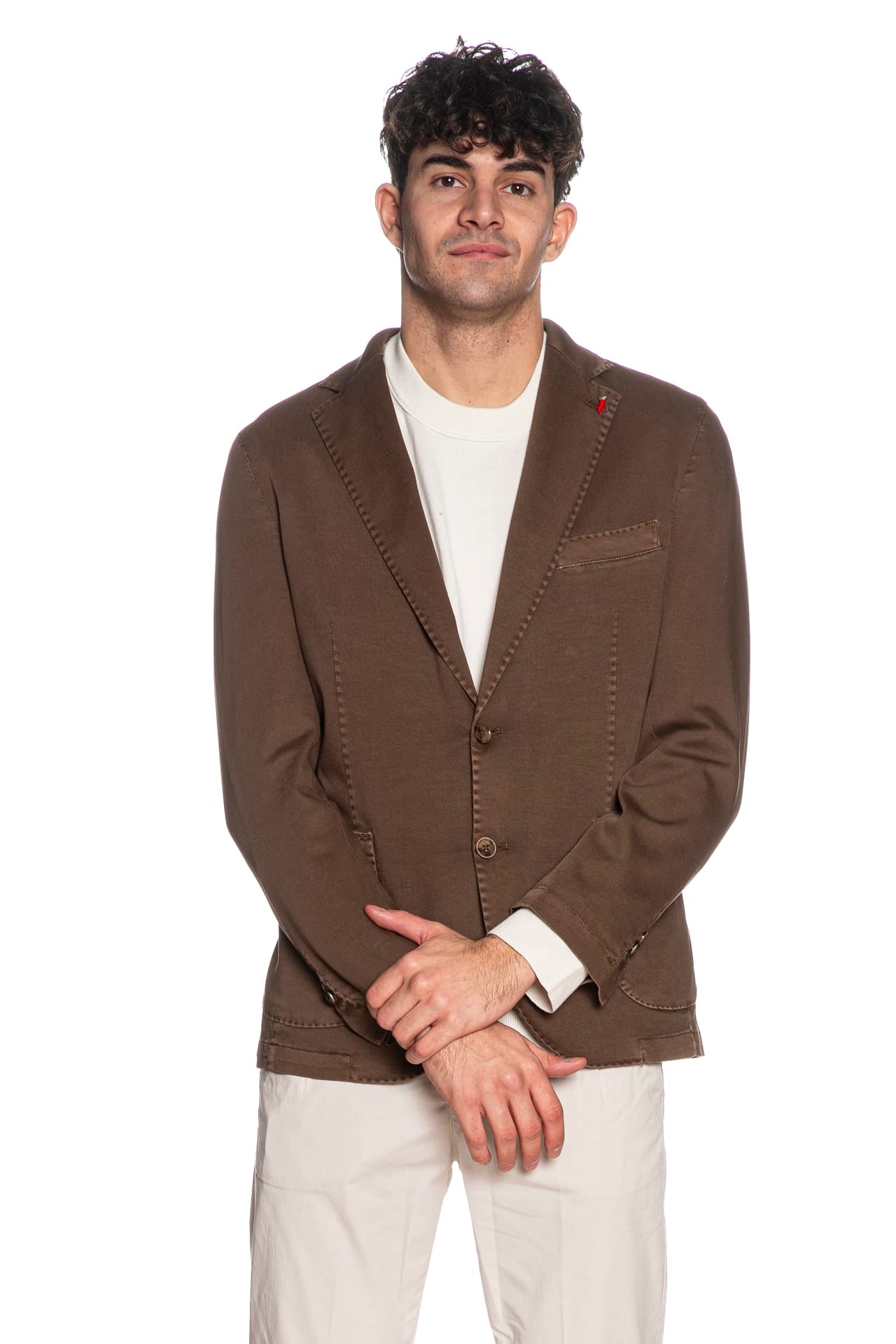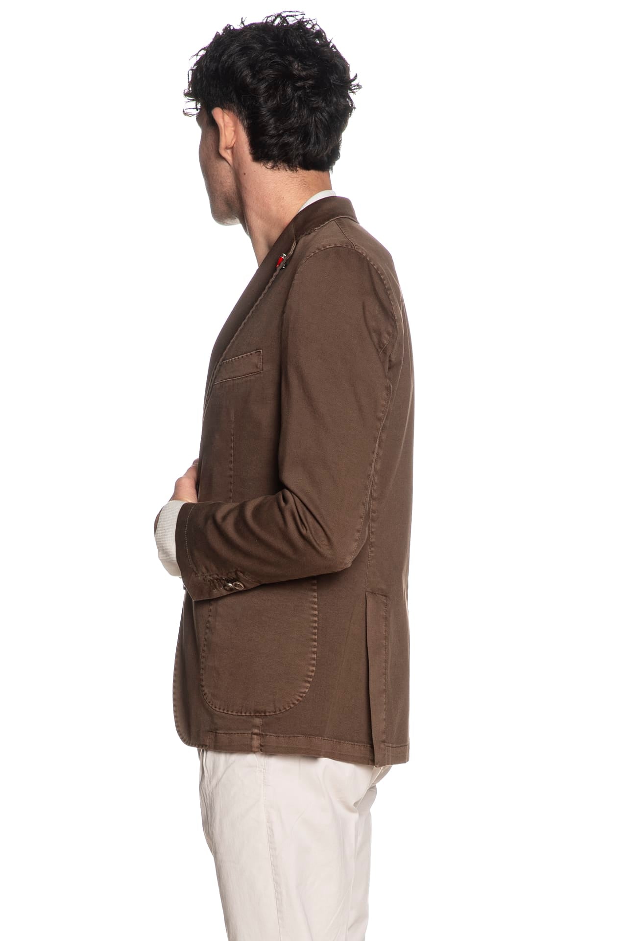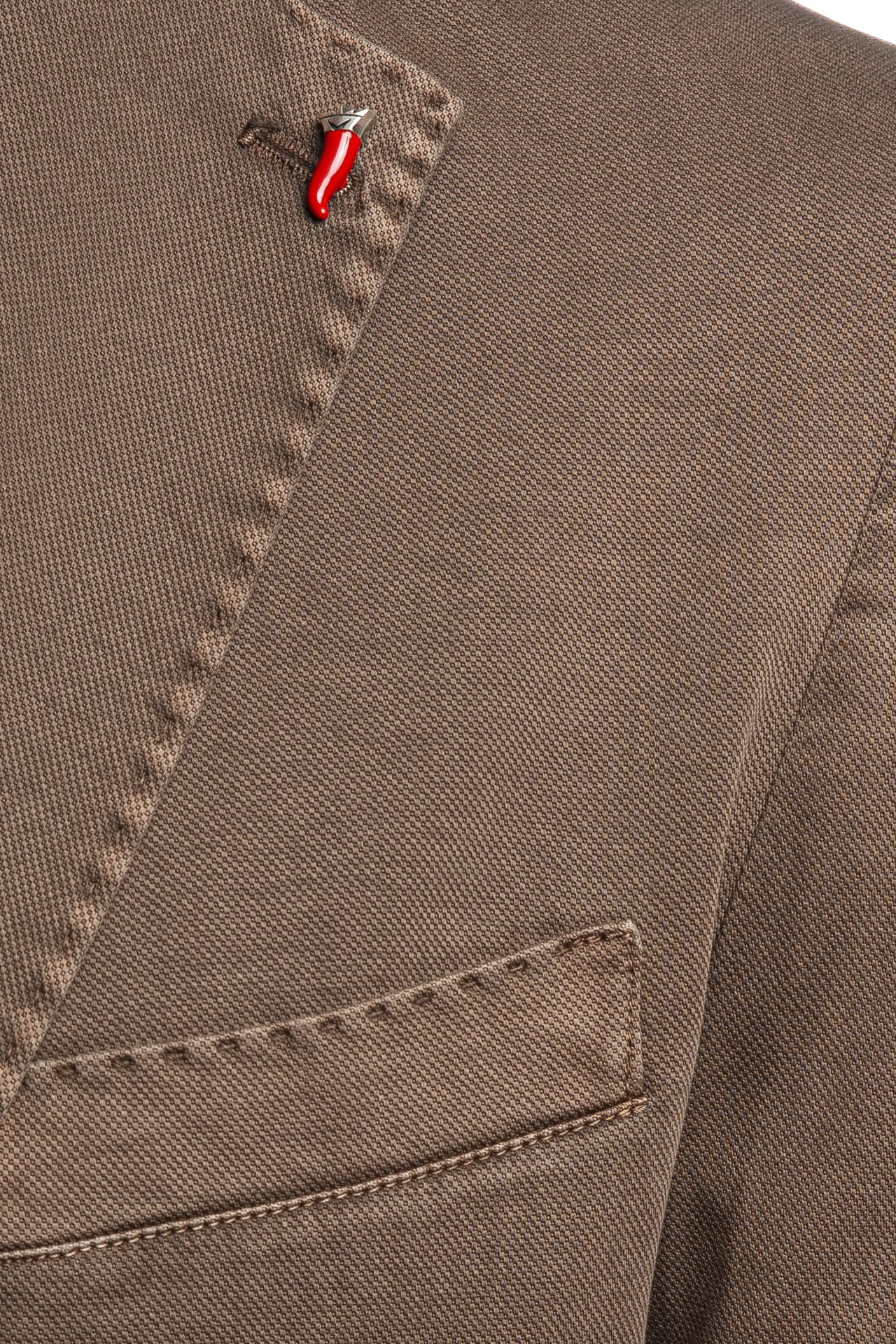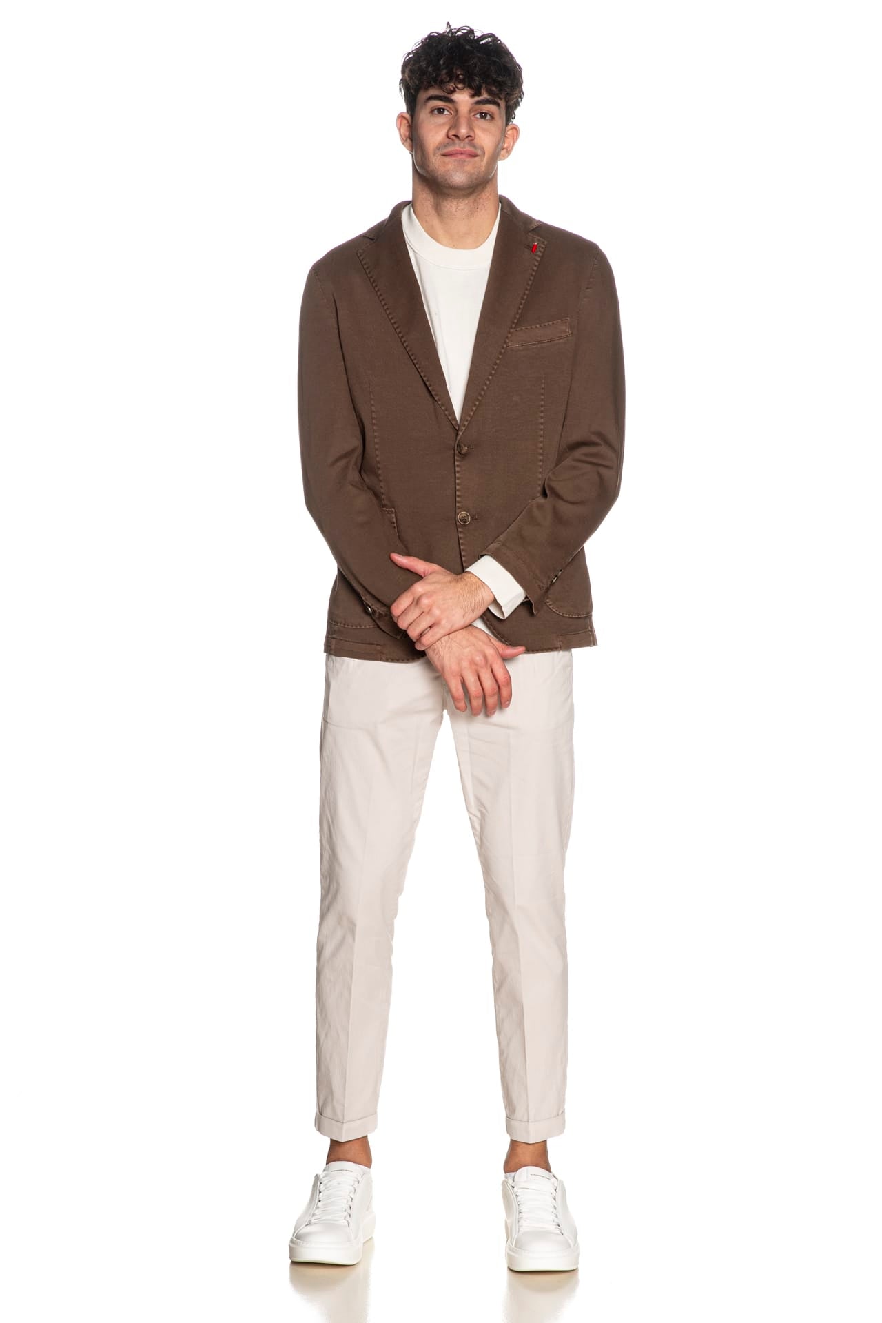 Giacca Mulish Giotto Old D7 da uomo in tessuto armaturato effetto piquet di cotone stretch tinto capo per un aspetto vintage, modello blazer drop 7 slim monopetto a due bottoni sfoderato, con revers classici, profili con impunture a vista, tasche anteriori a toppa e taschino a filo sul petto, spilla real smaltata sull'asola, dettaglio bottone logato ai polsi e spacchetti posteriori