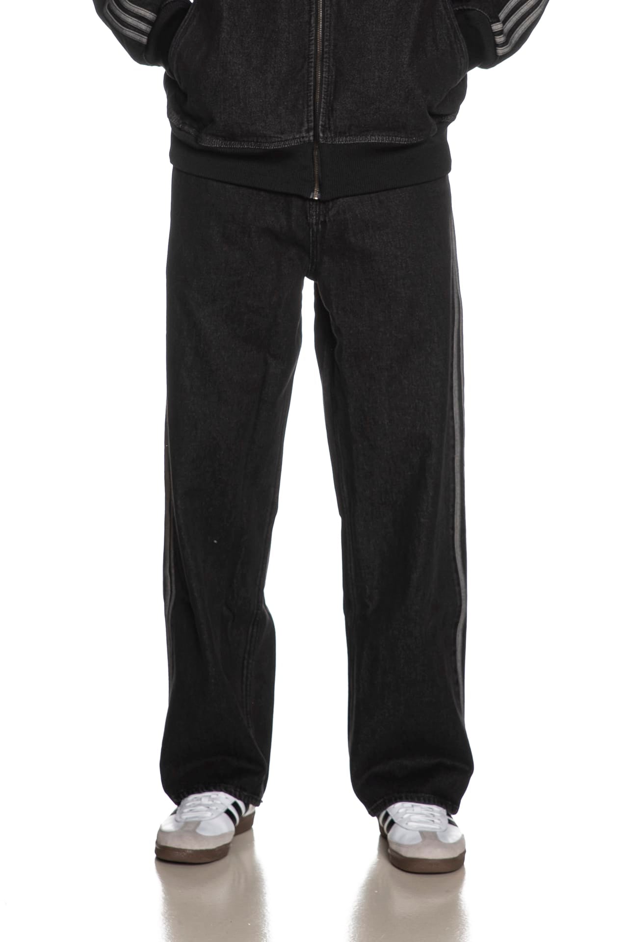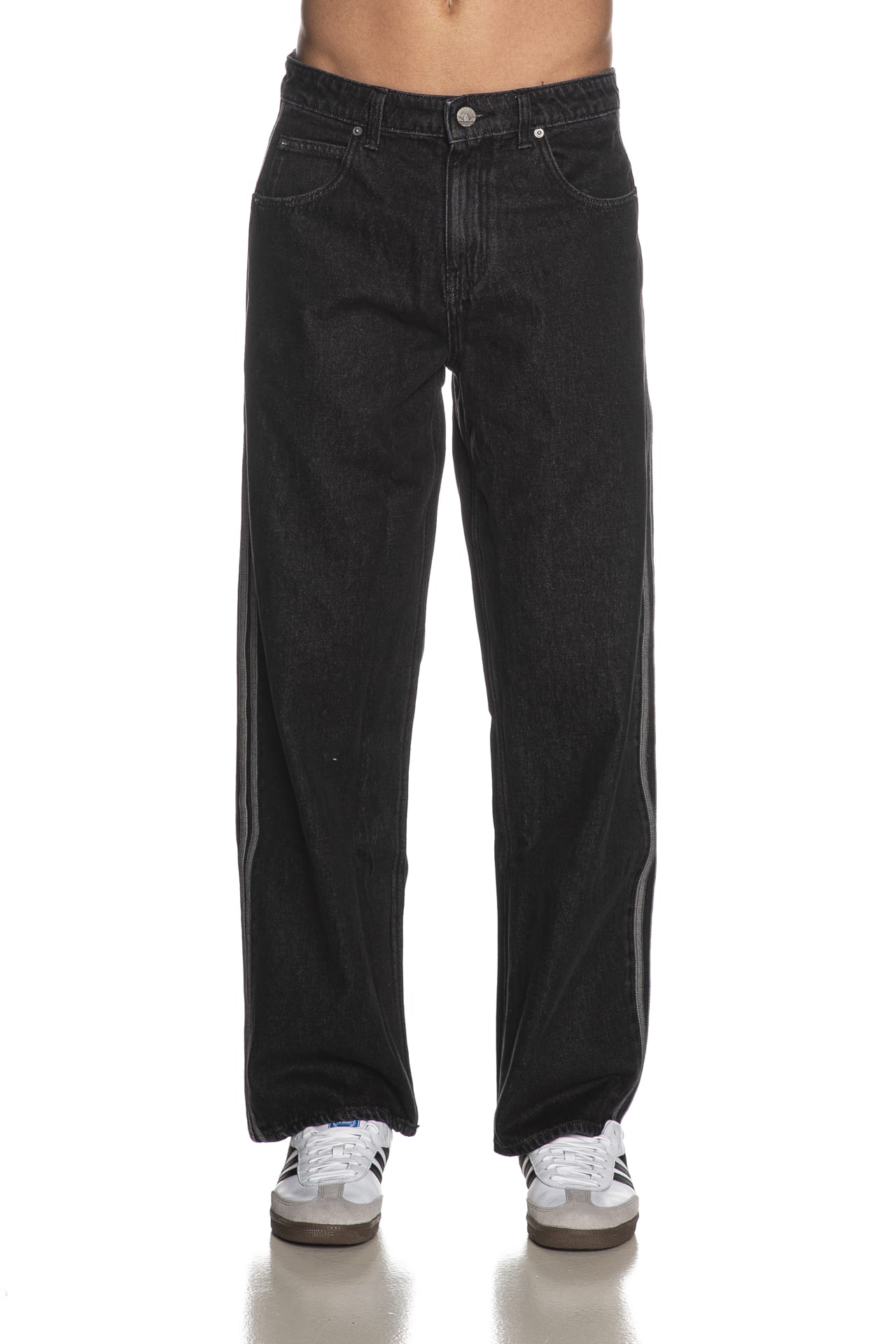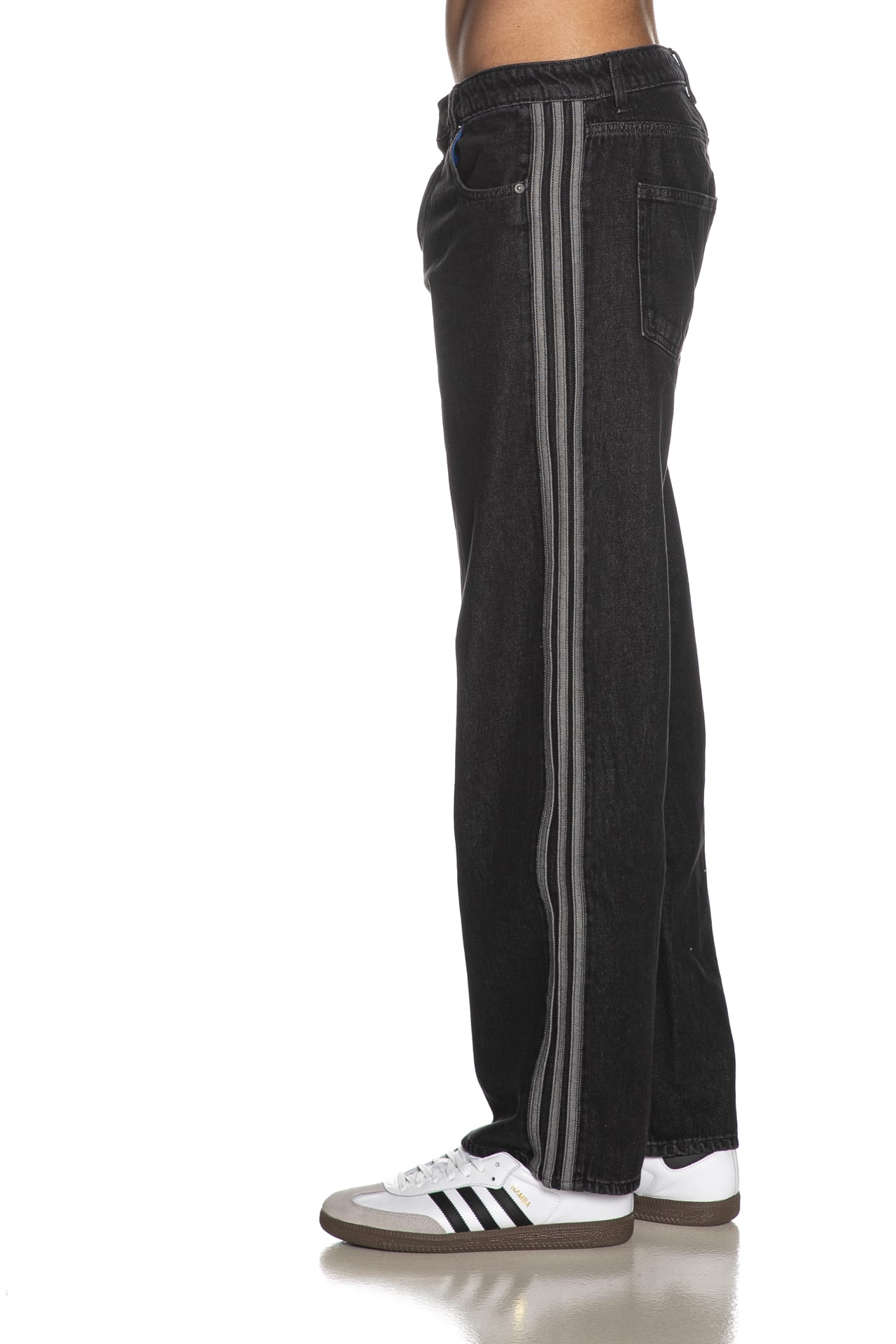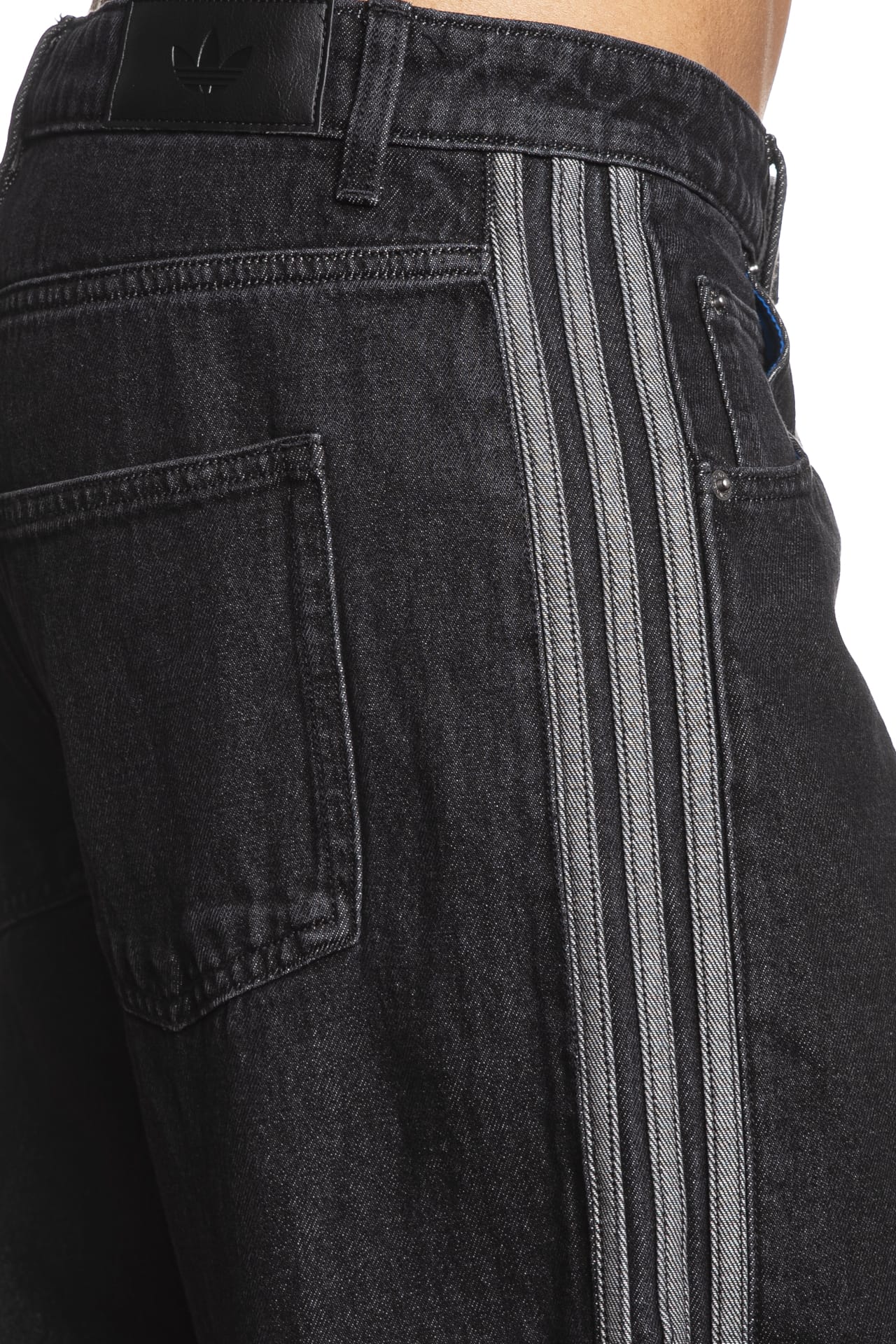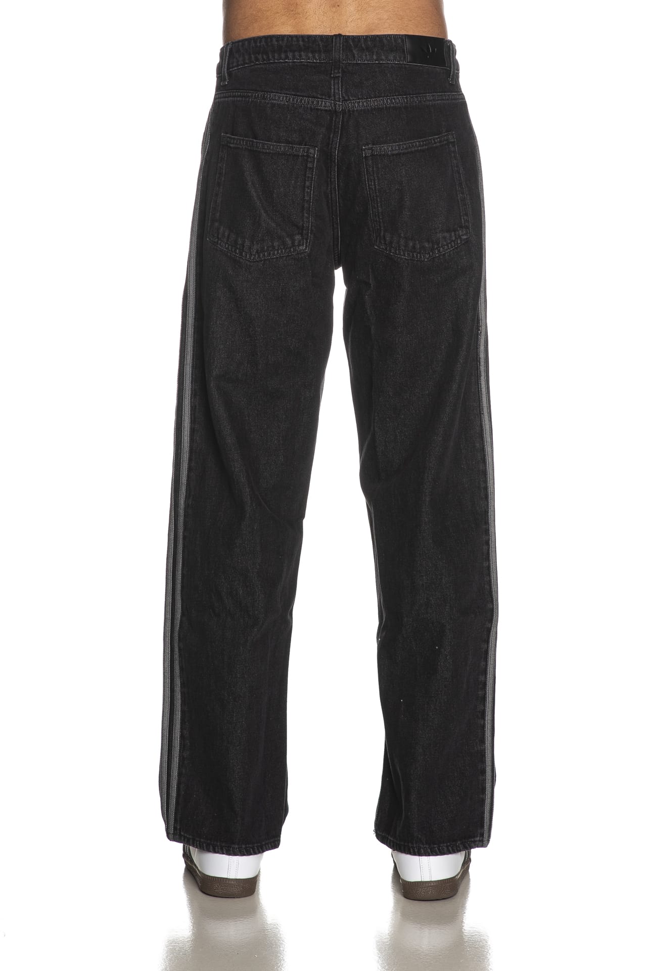 Jeans Adidas Original Firebird Bk Dnm da uomo in denim di cotone sottoposto a trattamento per un aspetto vintage, modello cinque tasche, relaxed fit a vita media, con bande laterali in tessuto a contrasto, chiusura con bottone e zip nascosta e tasche a toppa posteriori