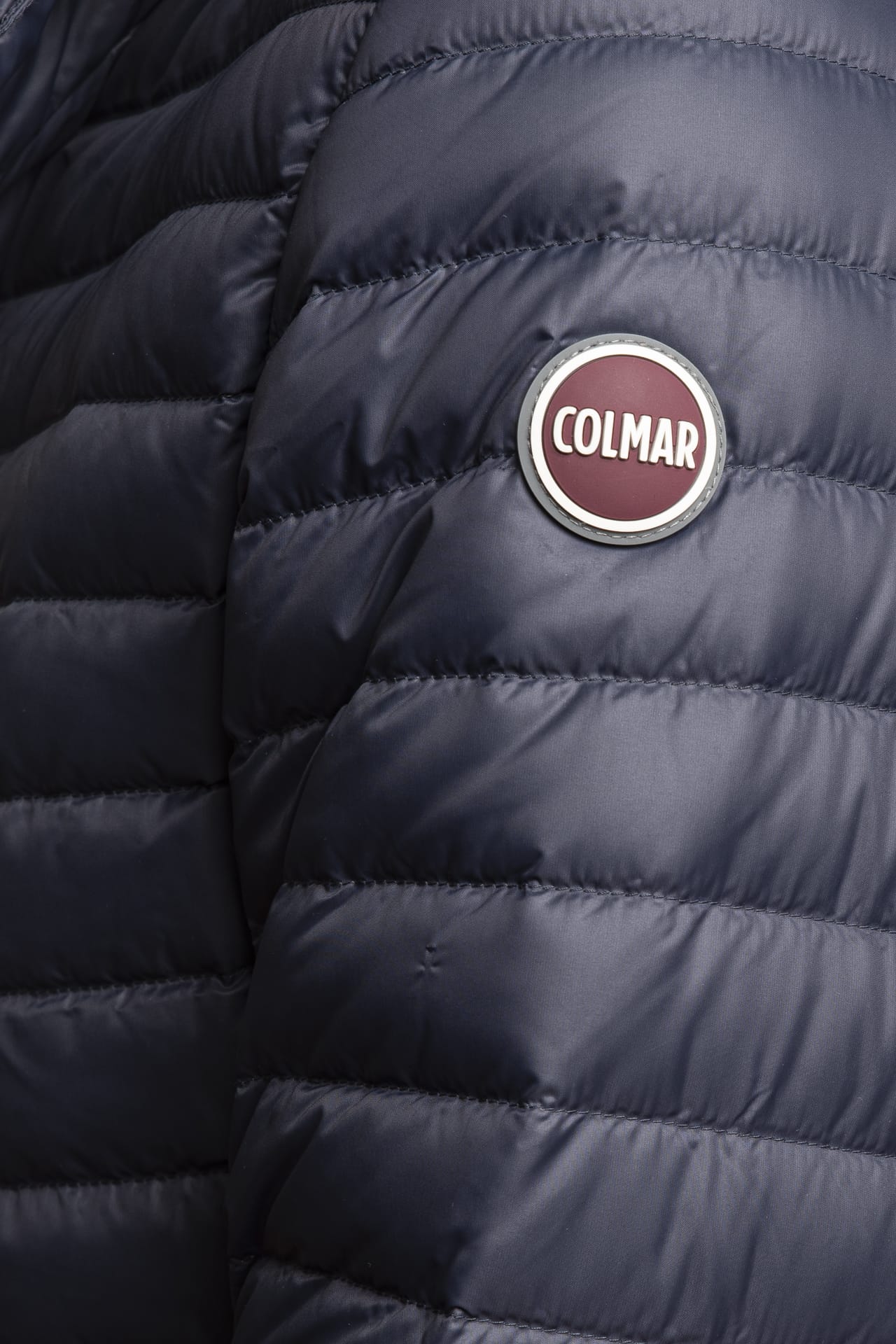 Piumino Colmar Originals Repunk da uomo in tessuto trapuntato di poliammide, corto dalla finitura morbida e opaca, con fodera a contrasto colore e imbottitura leggera in piuma naturale certificata, cappuccio fisso, mentoniera chiudibile da automatico, fondo e polsino in elastico nastrato, chiusura centrale e tasche a filo con zip a scomparsa, logo gommato a rilievo patch sulla manica lunga e sul retro bordo