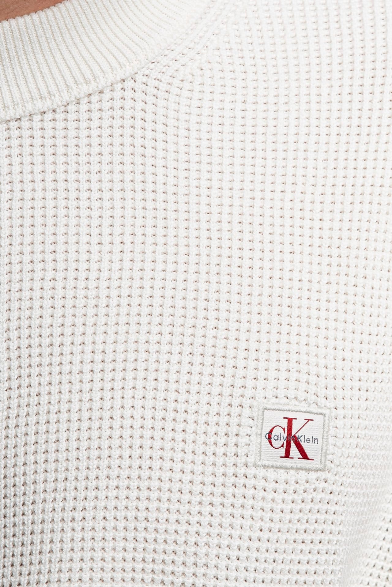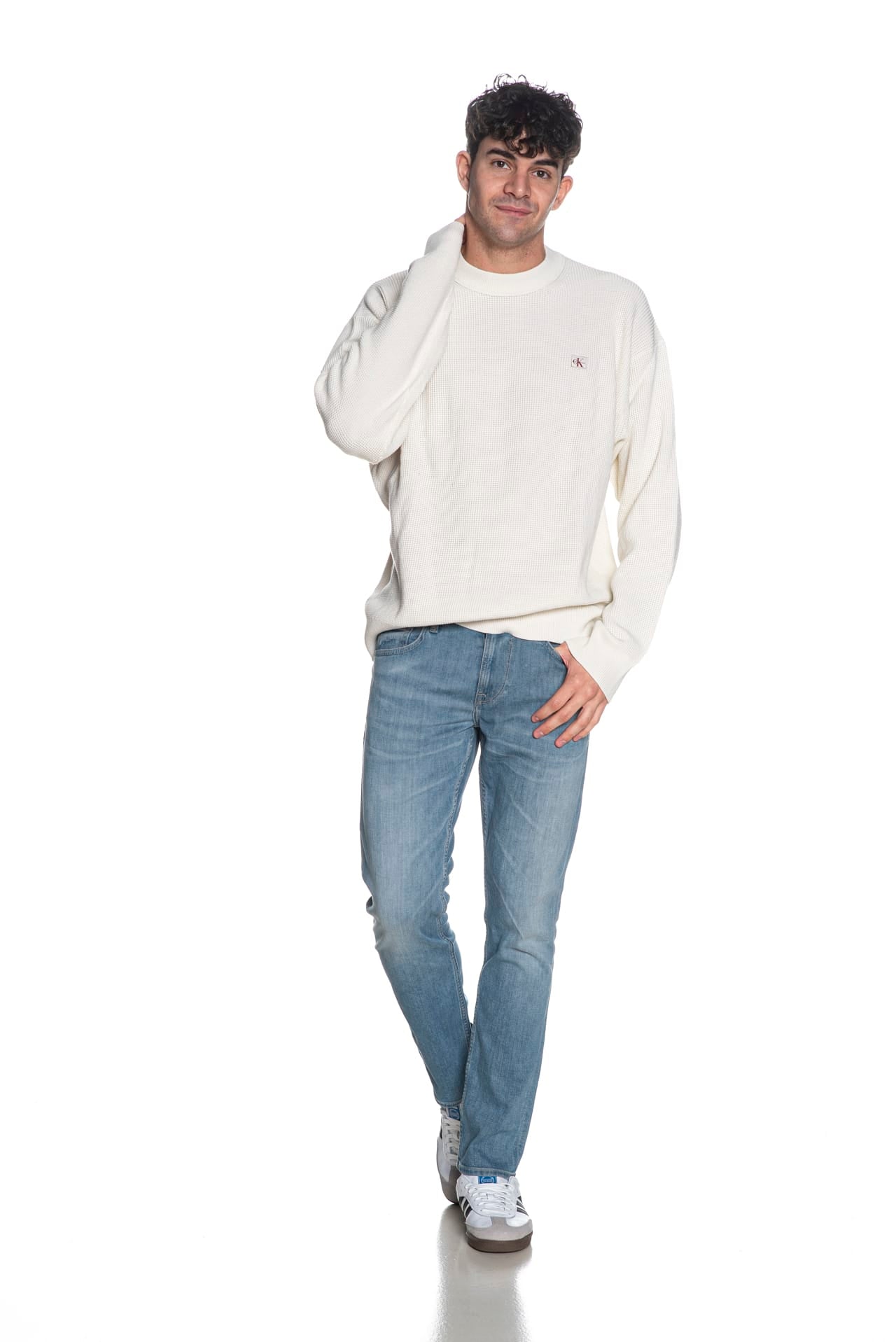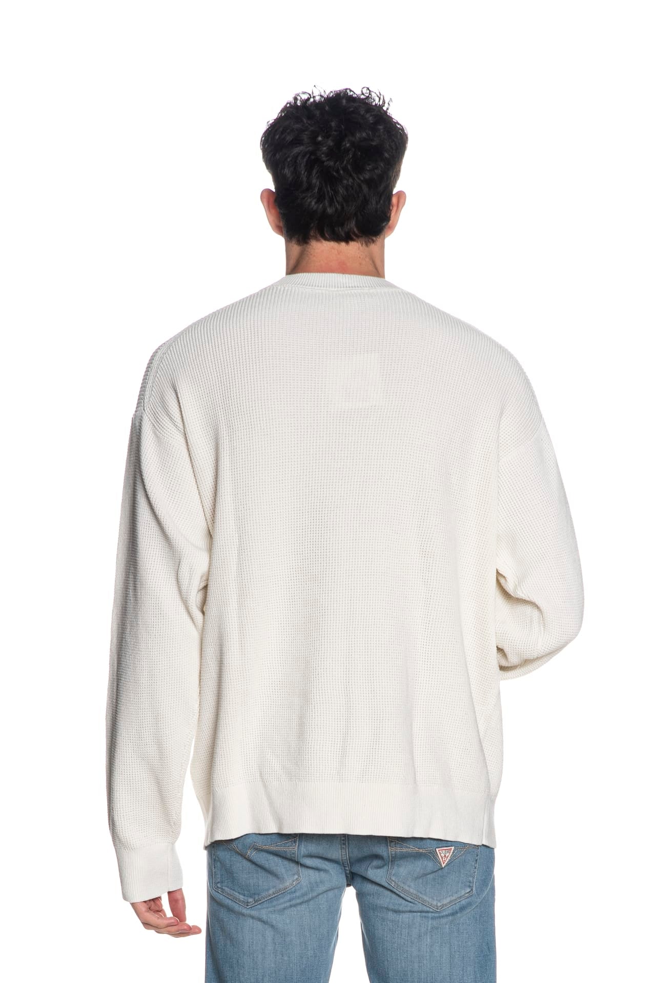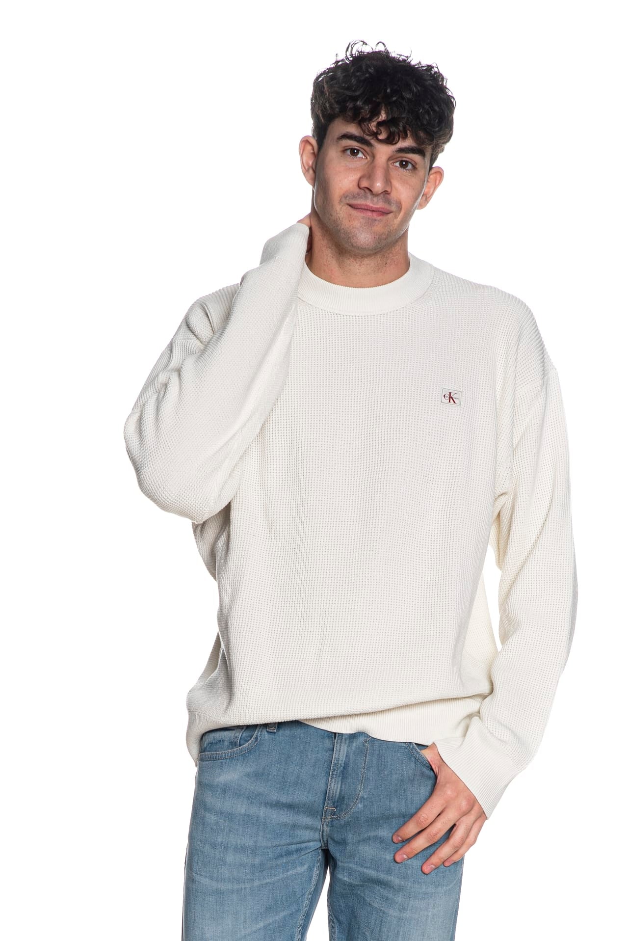 Pullover Calvin Klein Wa Crwnk Swt da uomo in filato testurizzato effetto waffle di cotone, relaxed fit, a manica lunga, con girocollo polsini e cannolè in maglia a costine e patch logo ricamato a contrasto sul petto
