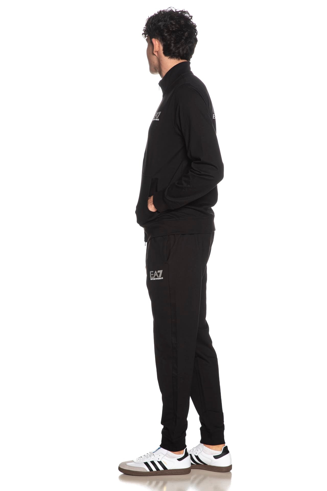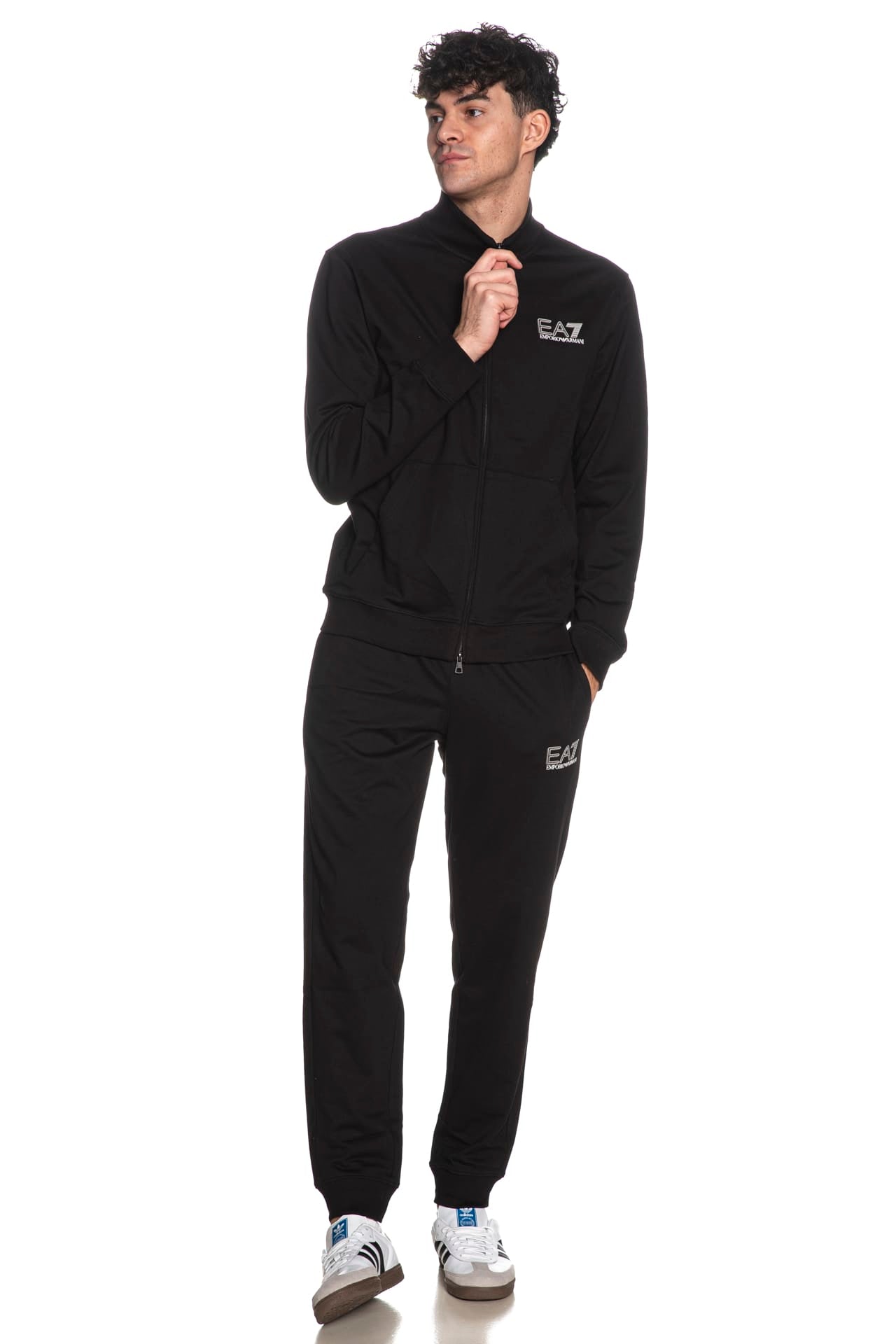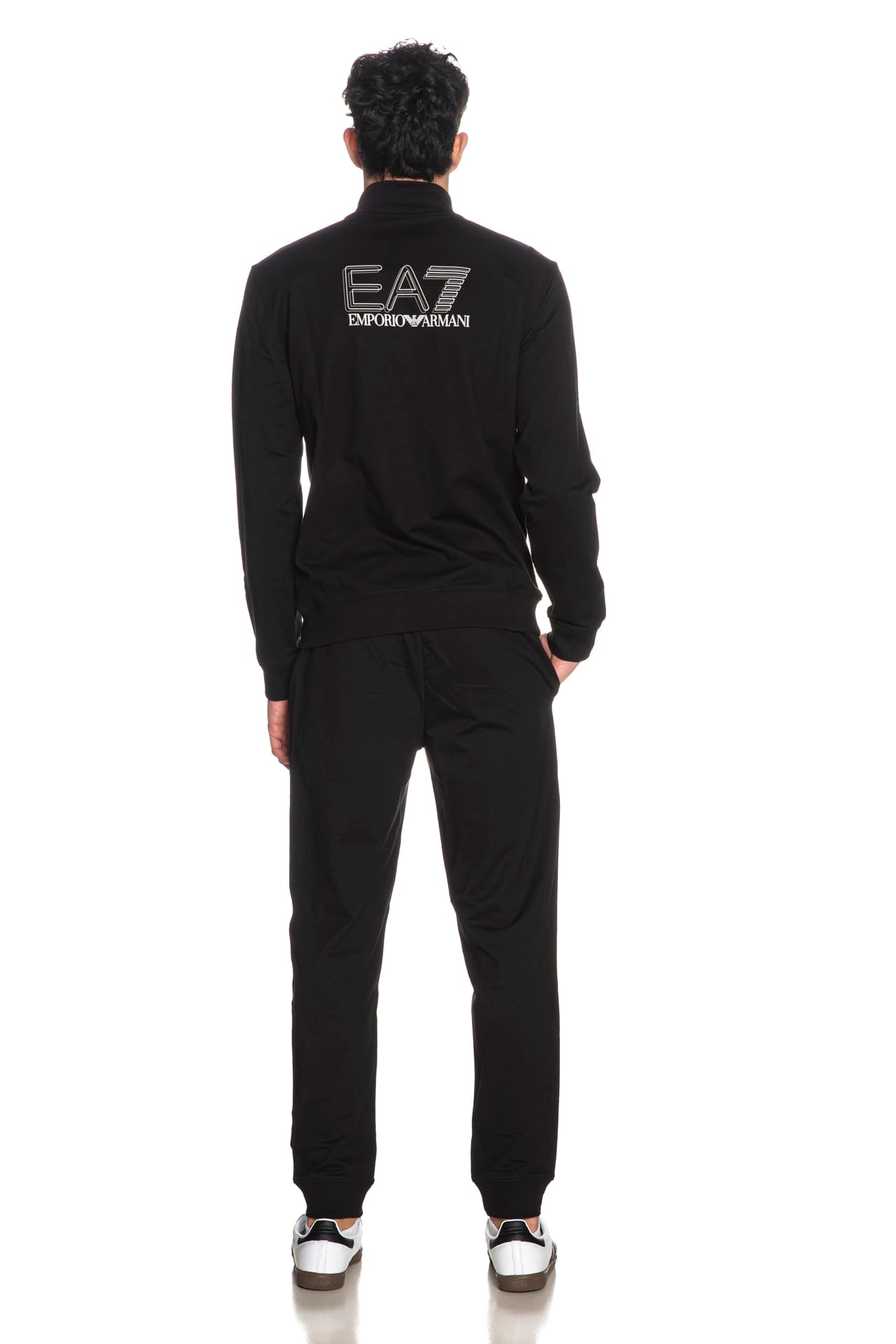 Tuta EA7 Train Visibility VI da uomo in tessuto garzato stretch di cotone, regular fit, composta da: - Giacca a manica lunga, con collo a imbuto, polsini e cannolè in maglia, monogramma in stampa gommata mini sul petto e maxi sulla schiena, tascone a marsupio e chiusura full zip a doppio cursore nascosta- Pantalone con elastico e coulisse regolabile da cordino in vita, piccolo logo stampato gommato a contrasto, tasche a filo e polsino in maglia