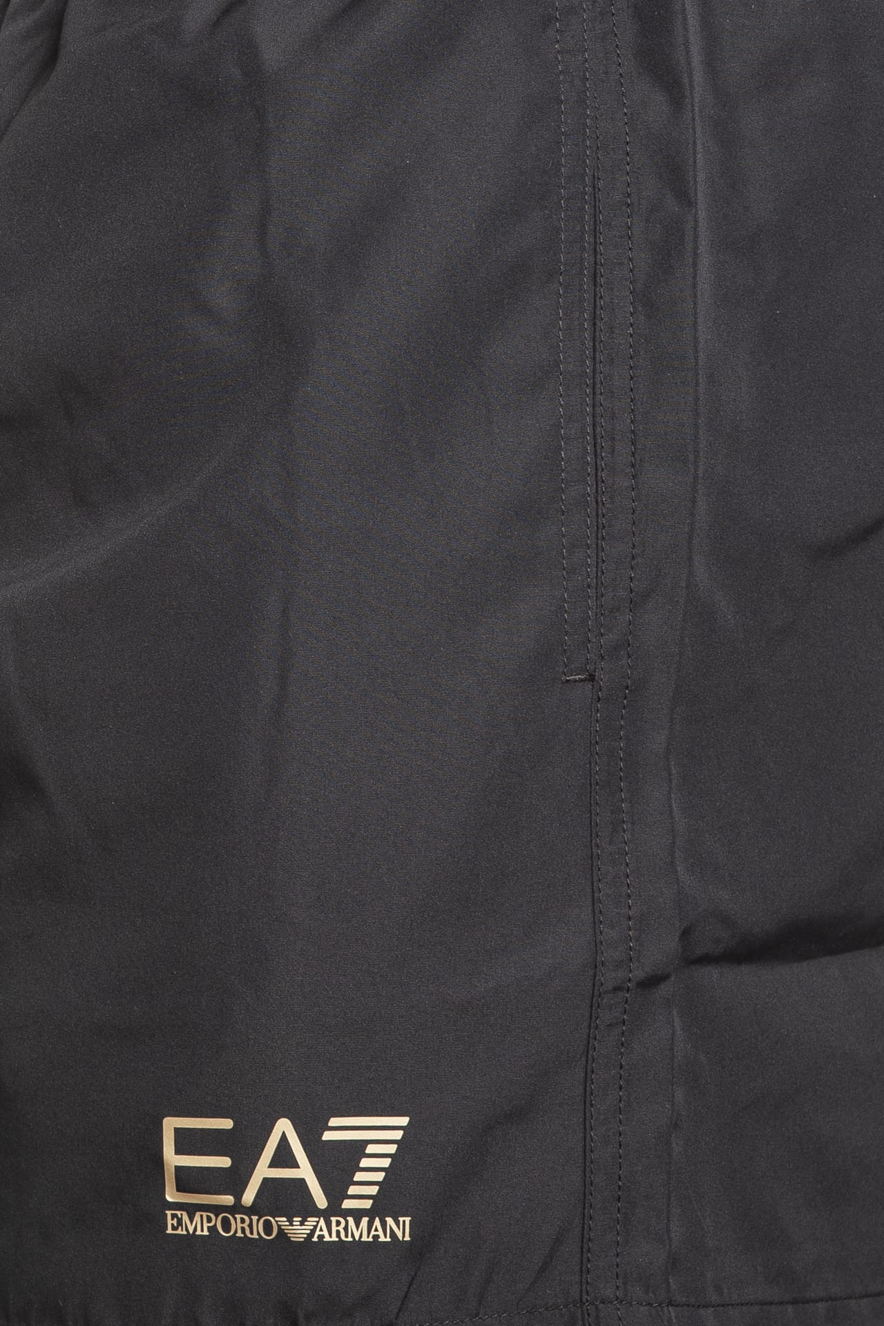 Costume EA7 Water Sport Bw M Gold Core da uomo in tessuto di poliestere, modello boxer da mare midi, con mutandina interna in rete, elastico e coulisse in vita, tasche laterali a filo e piccolo logo in stampa laminata oro mat a bordo gamba