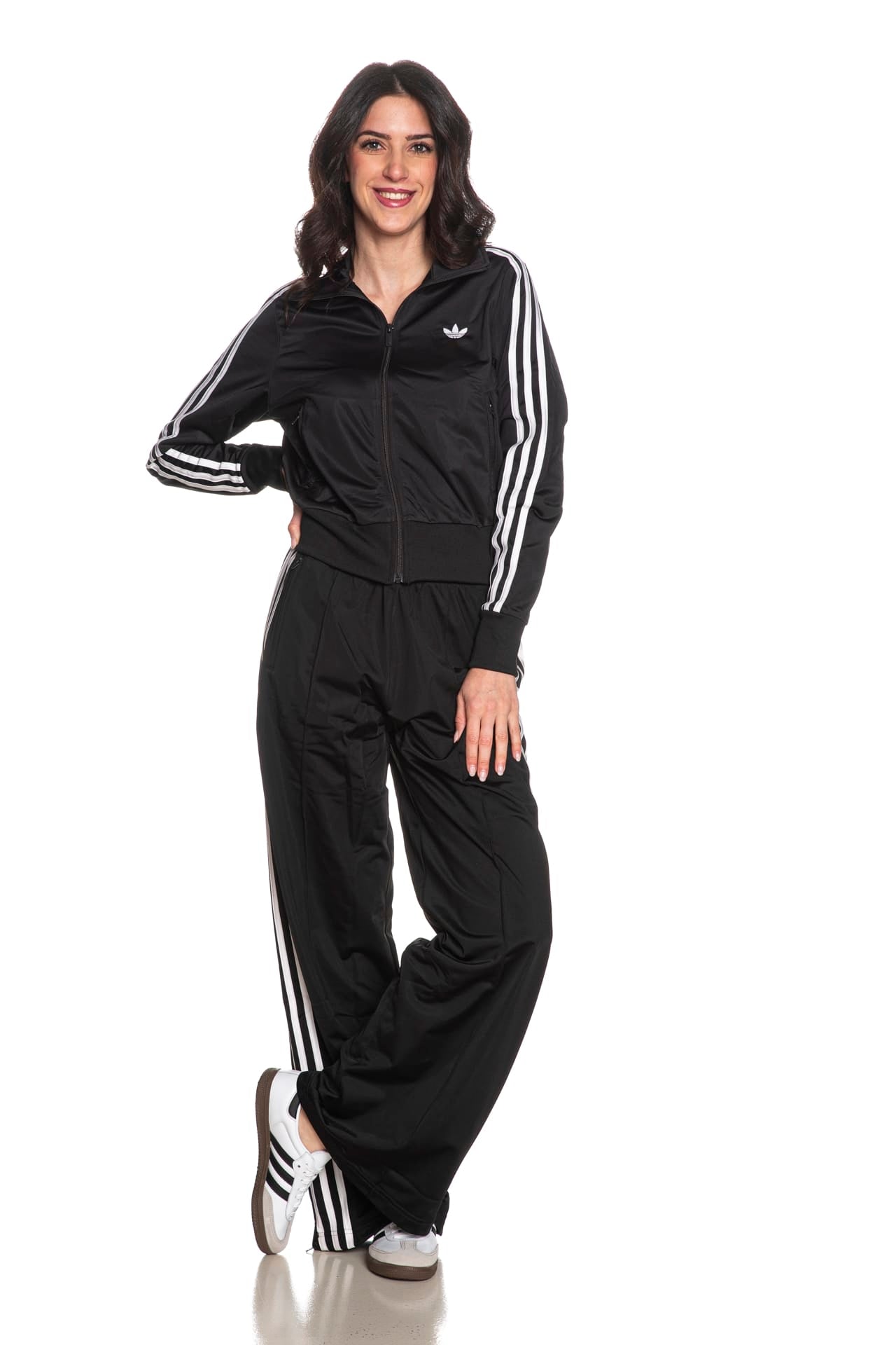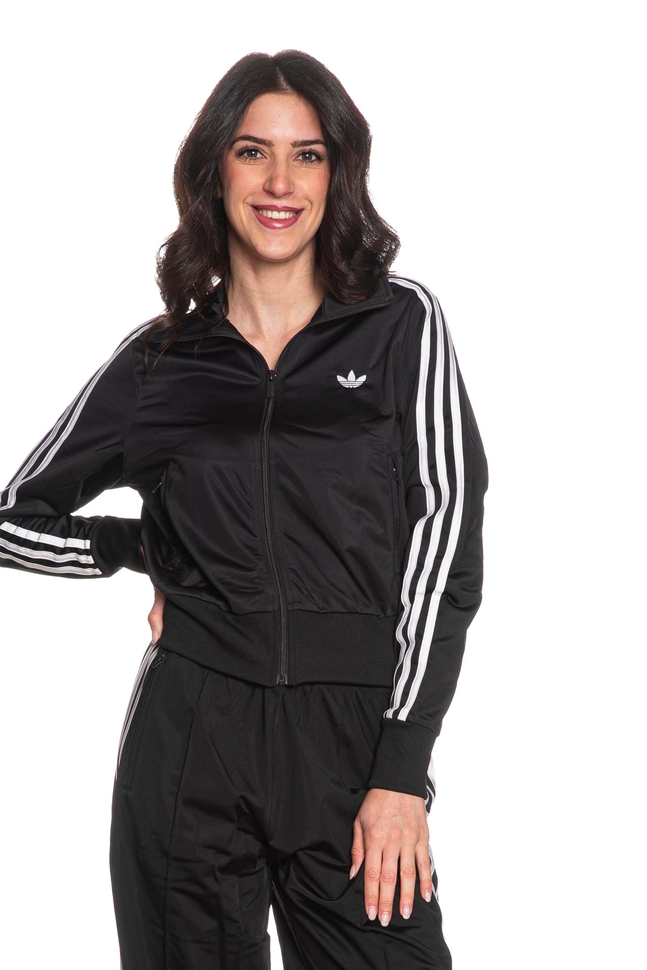 Felpa Adidas Originals Firebird Classic Track da donna in tricot di poliestere riciclato, modello iconico dalla vestibilità regolare, leggermente corta, con collo a imbuto, abbottonatura full zip centrale, trifoglio istituzionale ricamato sul petto, tasche a filo con chiusura lampo a scomparsa, bande a contrasto sulle maniche lunghe, polsini e cannolè a costine
