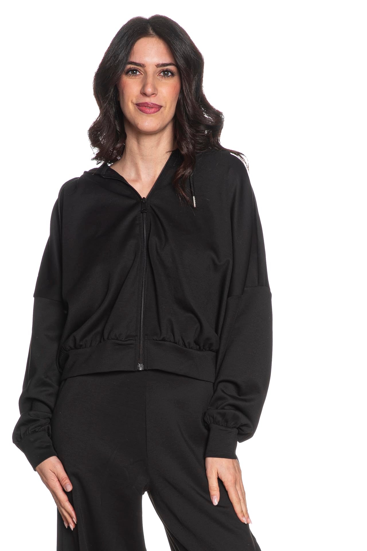 Felpa Only Alina Life Z Hood da donna in interlock stretch di poliestere parzialmente riciclato, con cappuccio fisso regolabile da stringa, spalla scesa e manica lunga, chiusura full zip, polsini e cannolè