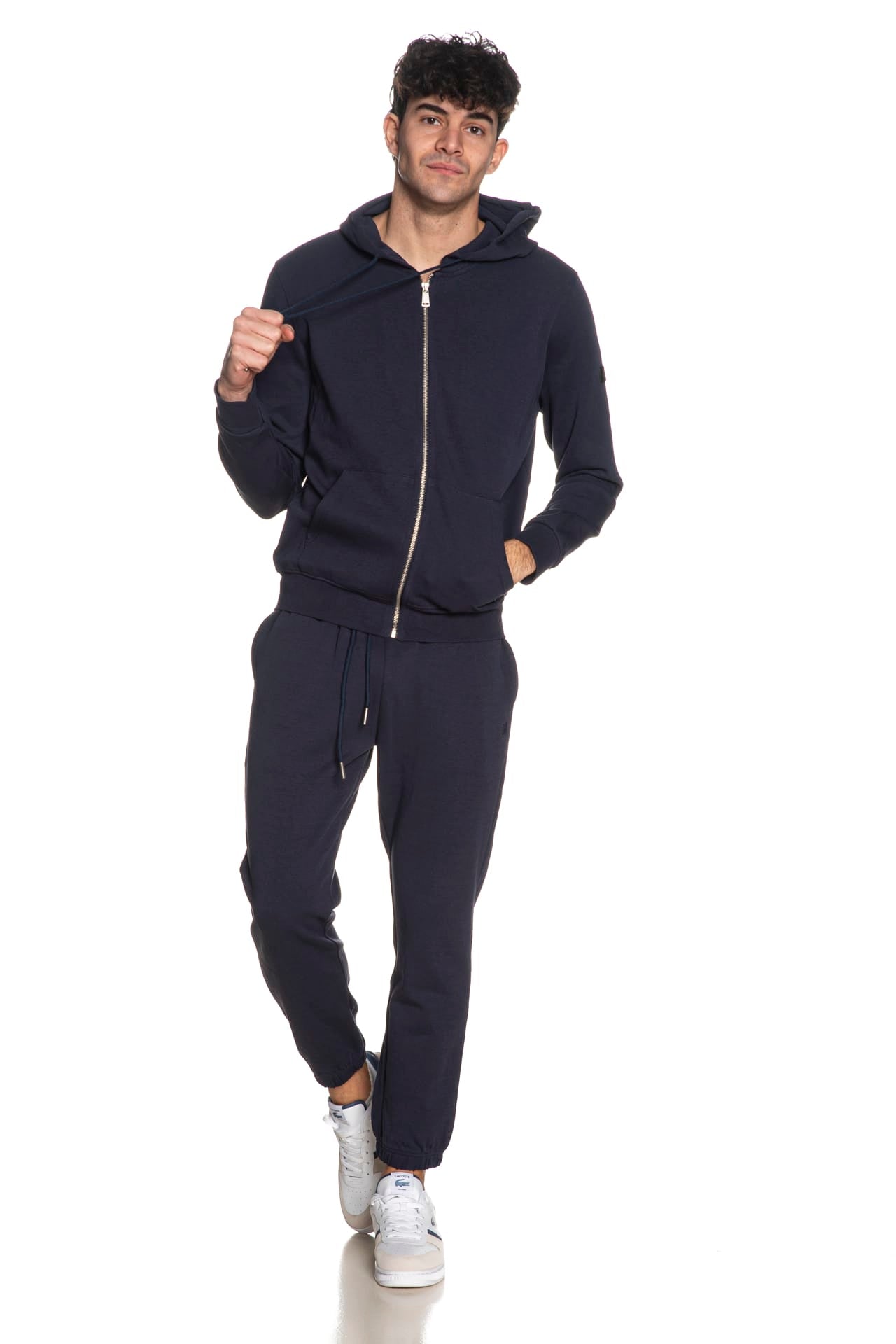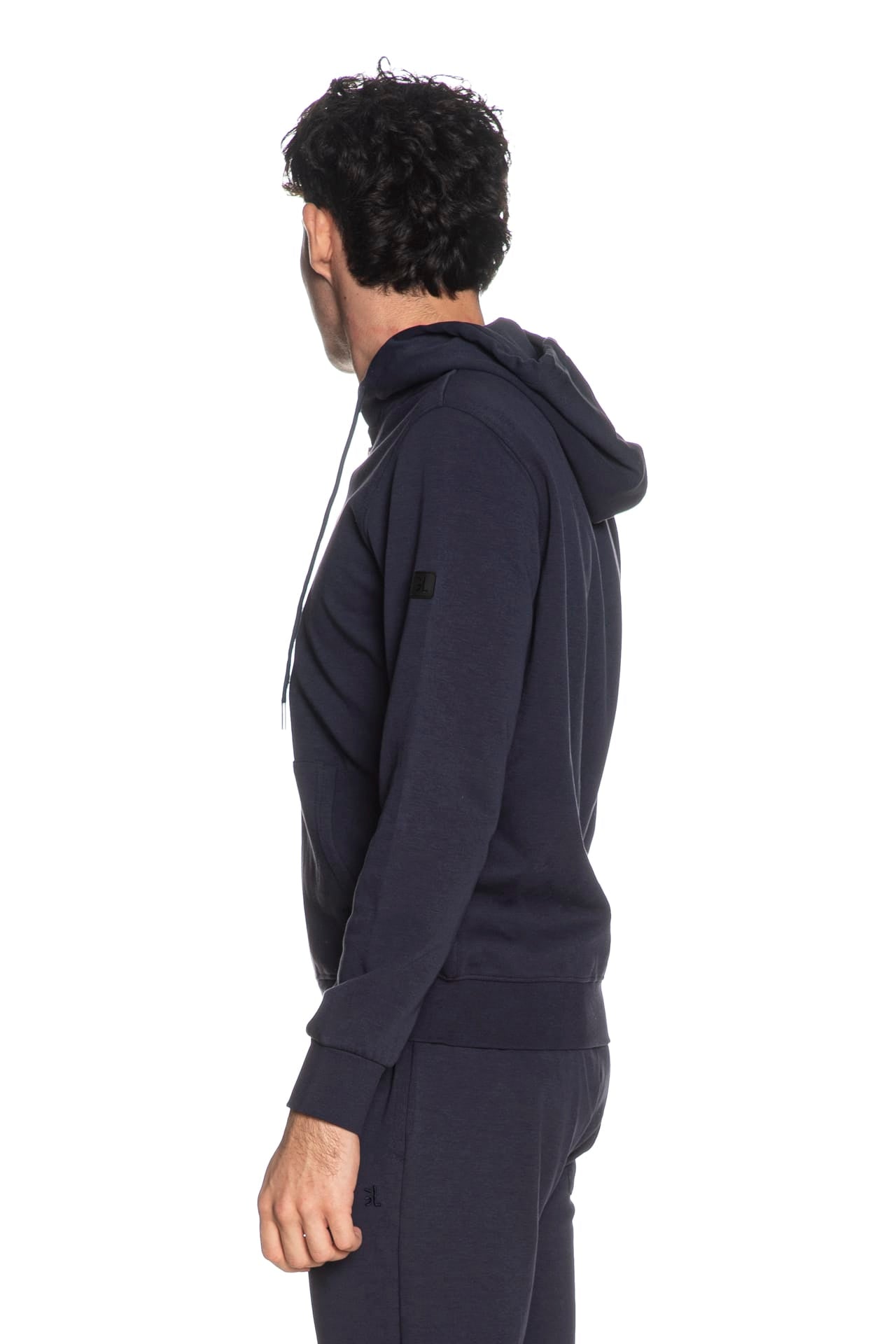 Felpa Gianni Lupo Int Hood da uomo in interlock di cotone e poliestere, con cappuccio fisso regolabile da cordino, chiusura full zip centrale a vista, tascone a marsupio con monogramma ricamato a filo tono su tono, tag gommato sulla manica lunga, polsini e cannolè in maglina