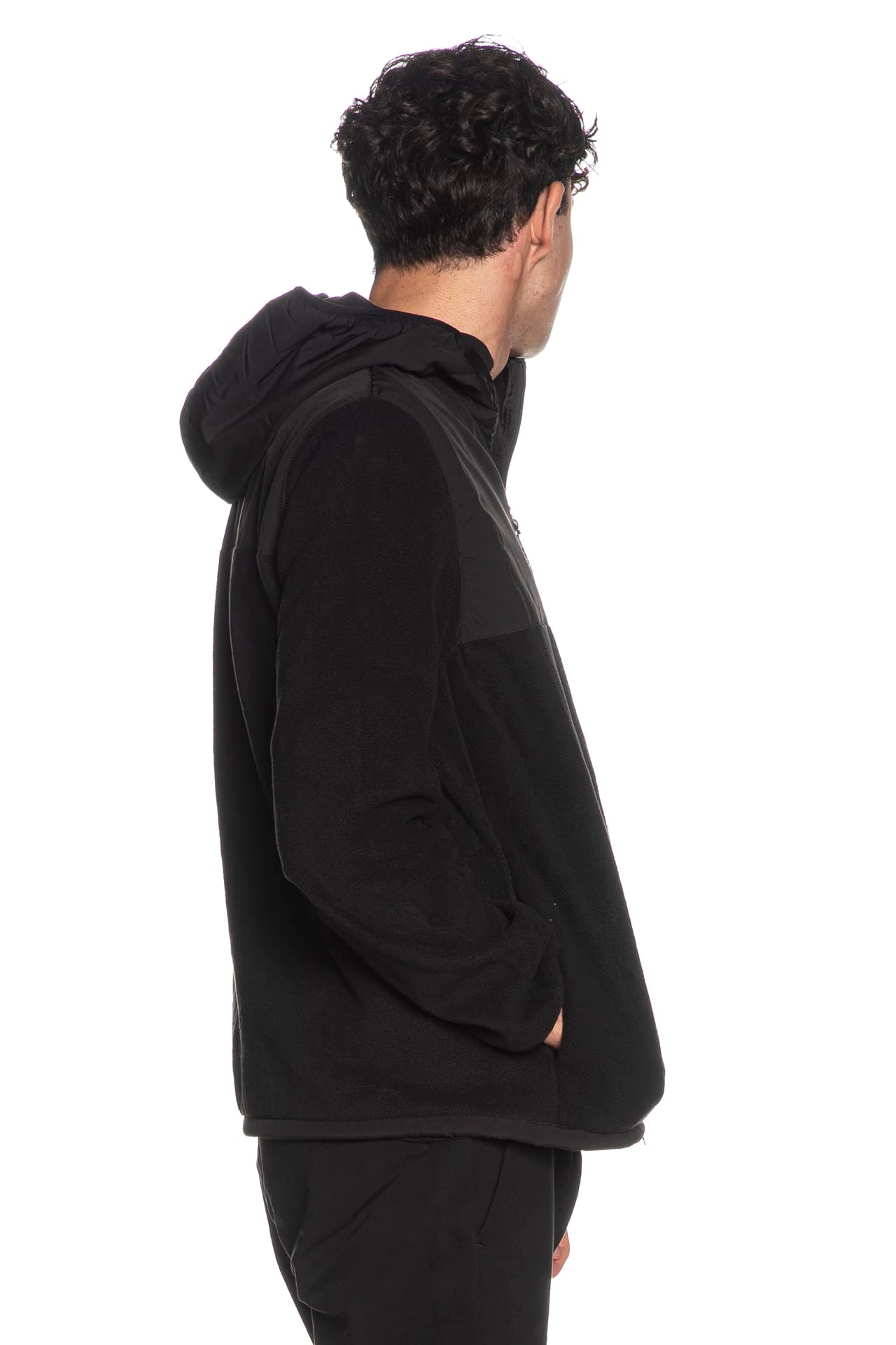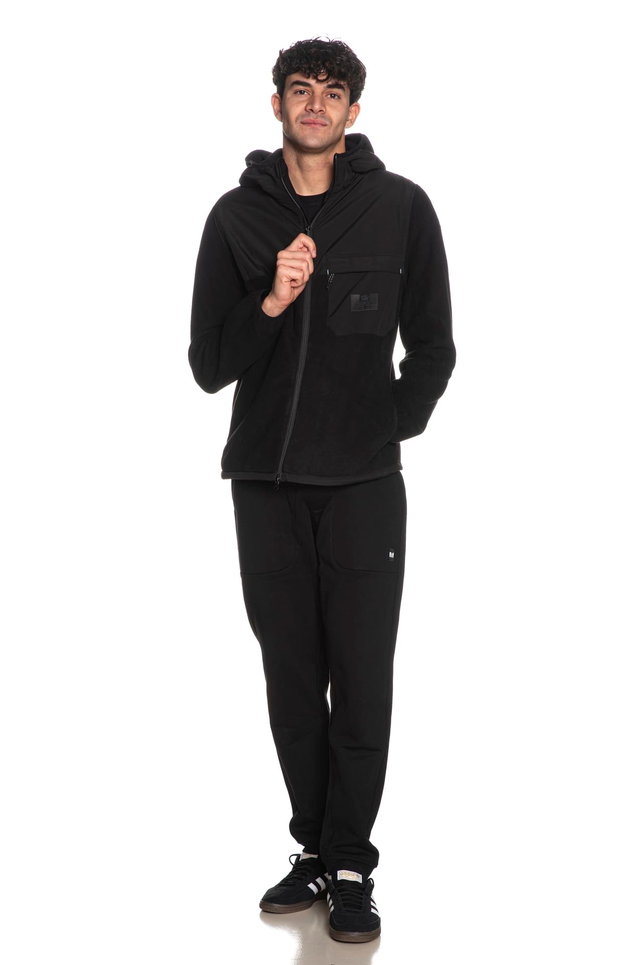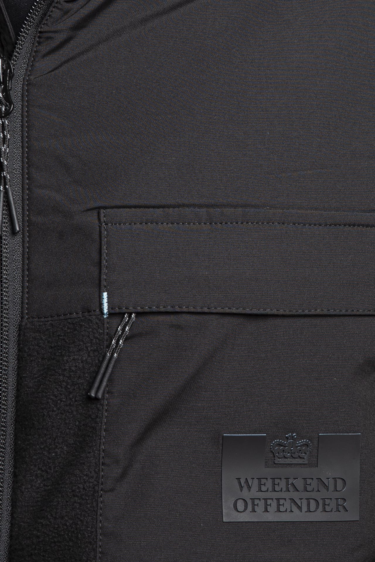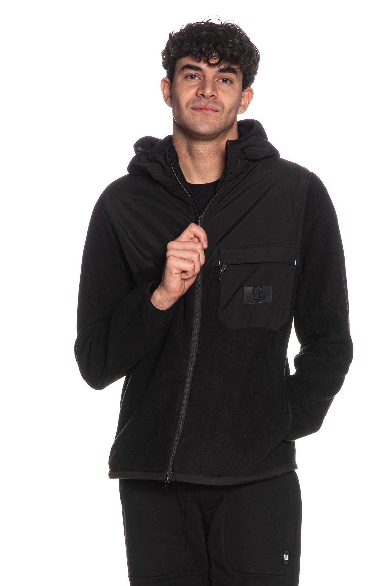 Felpa Weekend Offender Frusciante da uomo in pile di poliestere, a manica lunga, con cappuccio tasca con logo gommato e zip coperta da patta sul petto fronte retro sulle spalle in tessuto di nylon tono su tono, chiusura centrale full zip, tasche laterali a filo, fondo regolabile da stopper laterali interni e polsini nastrati