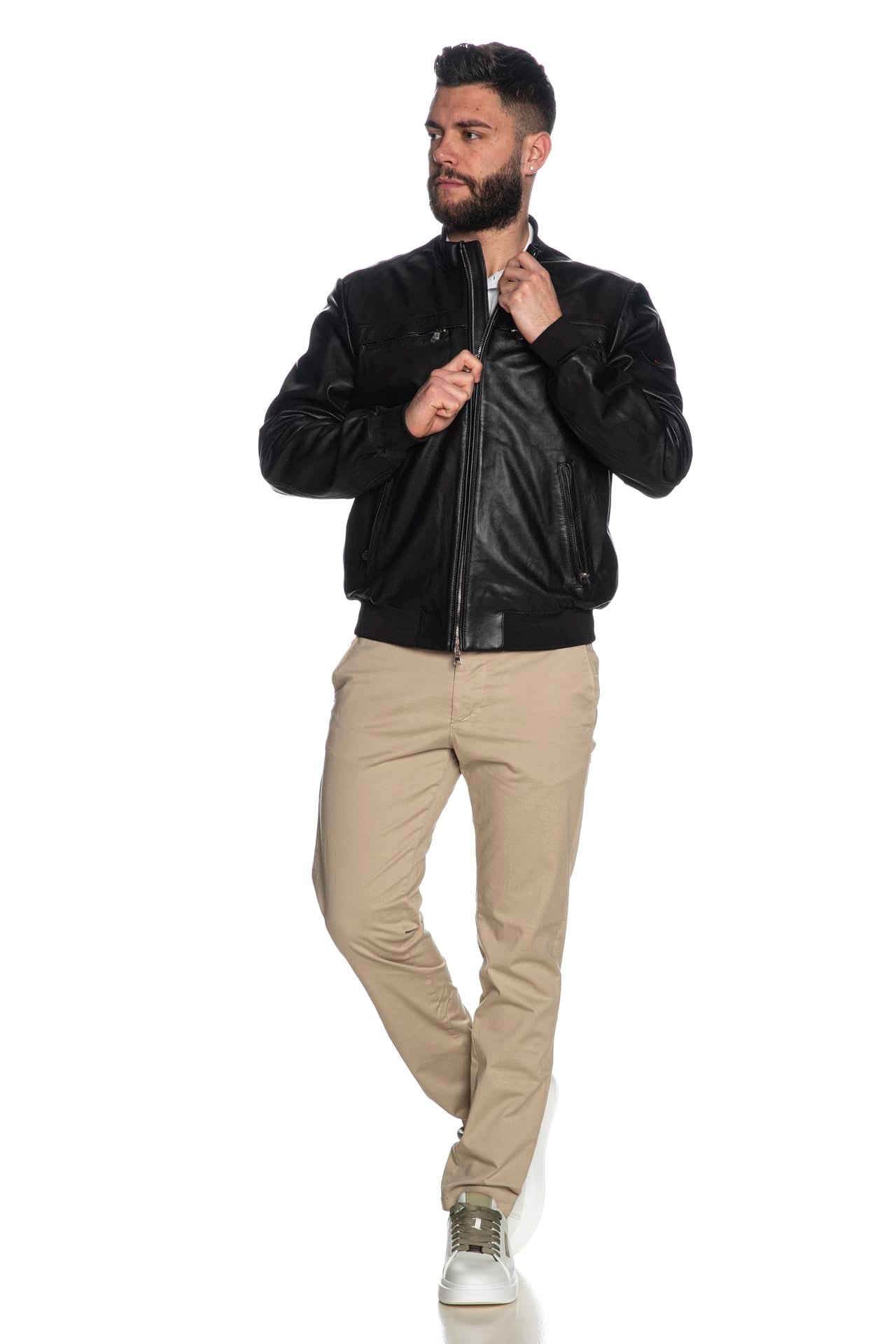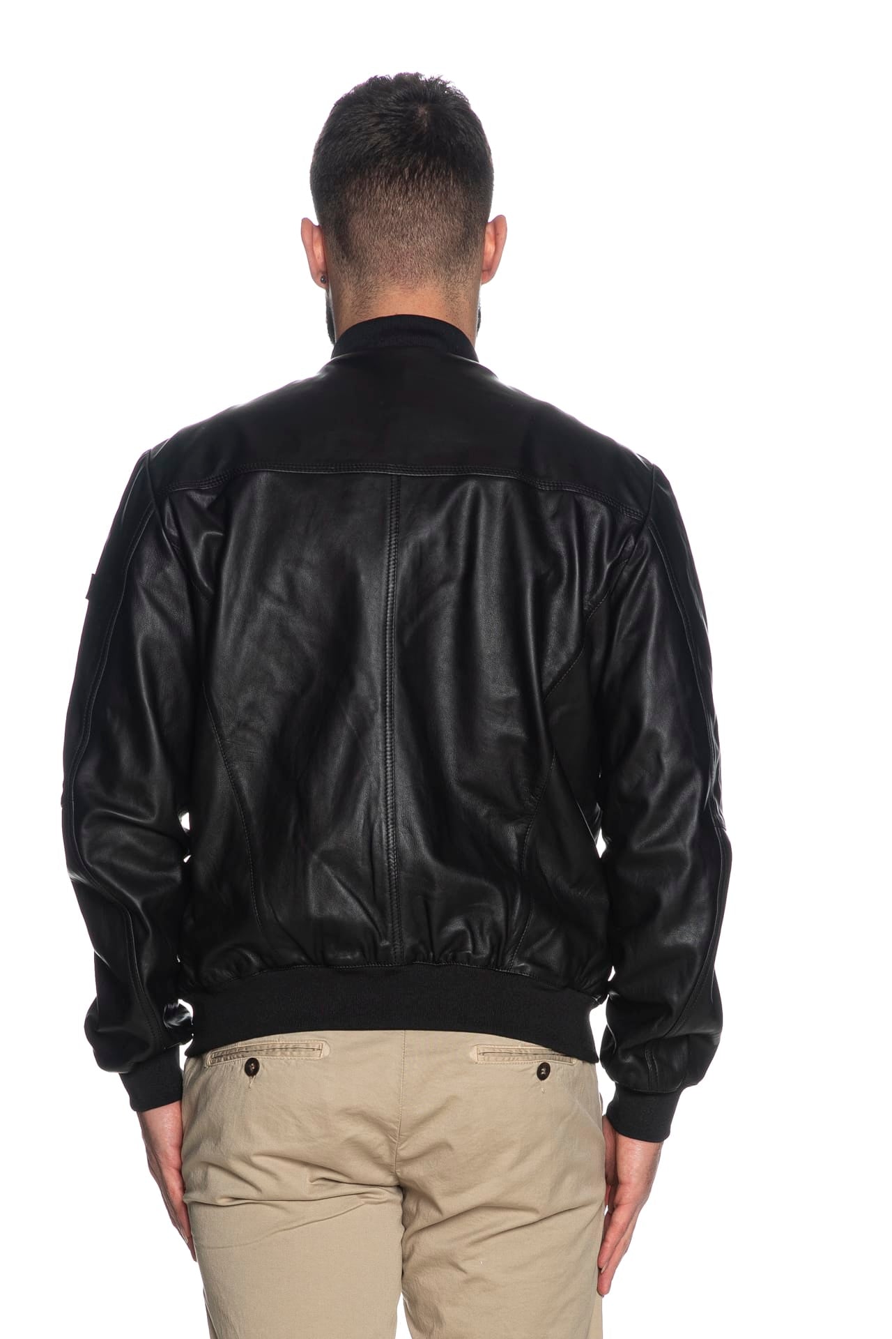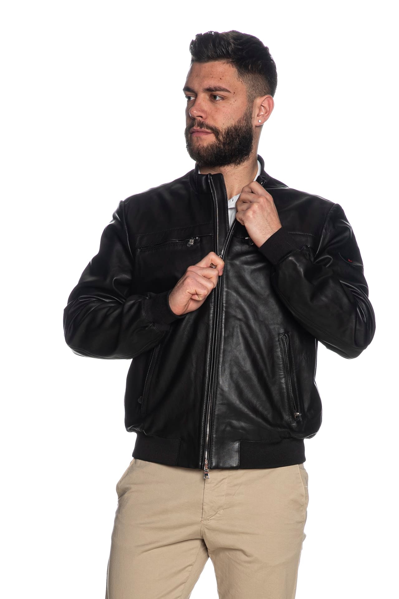 Giubbino Peuterey Sand Lth da uomo in pelle, modello bomber con collo alla coreana polsini e cannolè in maglia a costine, chiusura centrale con zip a doppio cursore a vista, tasche sul petto con zip coperte e tasche laterali con zip a scomparsa, carrè sulla schiena e manica lunga con tag logo cucito
