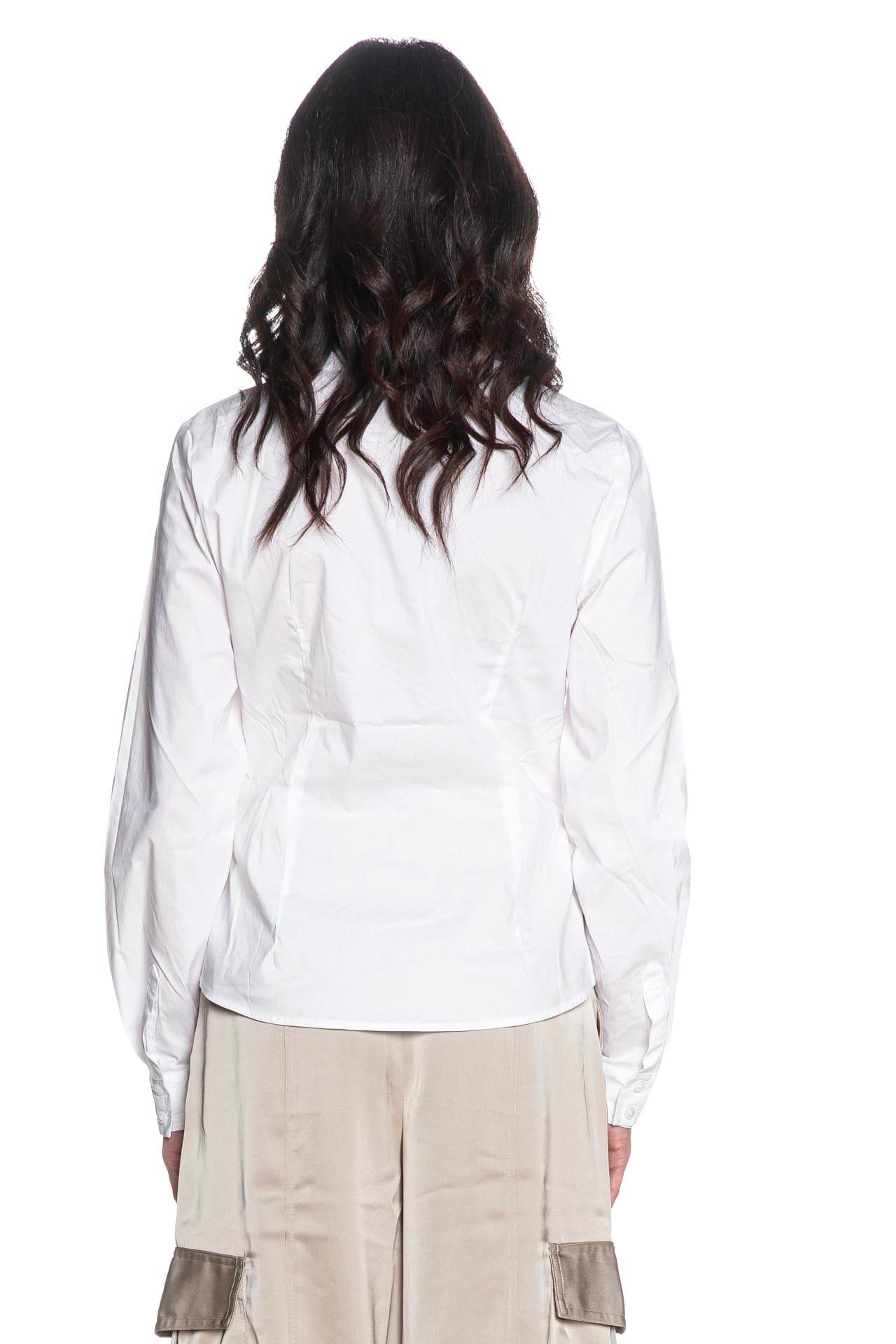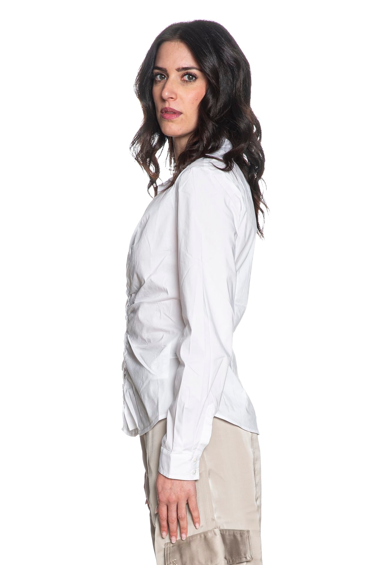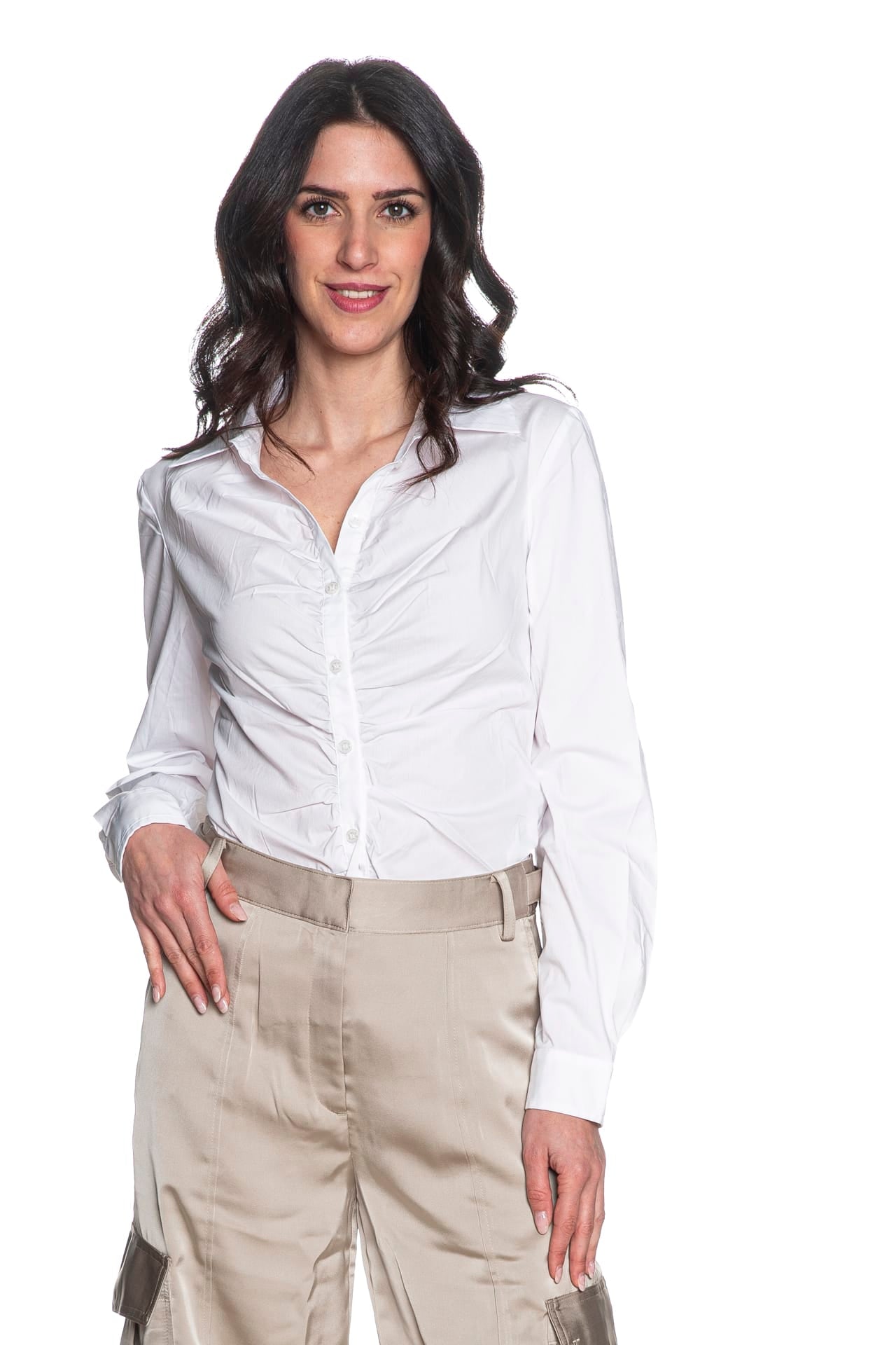 Camicia Guess Emily Shirred Pop da donna in popeline stretch di cotone e poliammide, a manica lunga slim fit, con collo italiano, arricciature lungo l'abbottonatura centrale, polsini a due bottoni con doppia piega e fondo stondato
