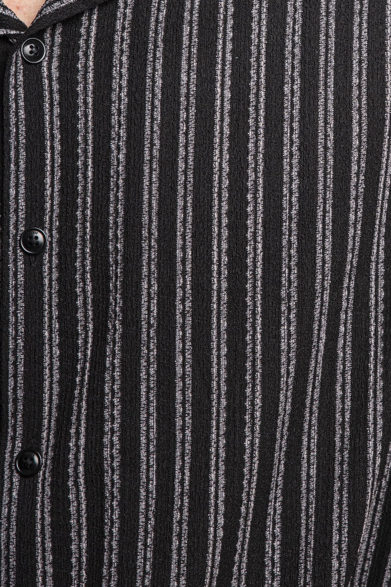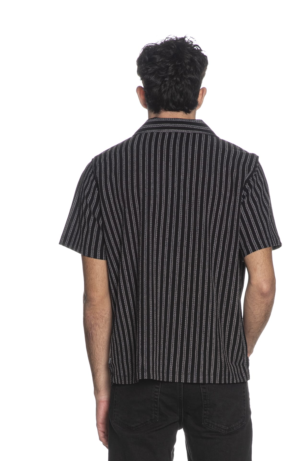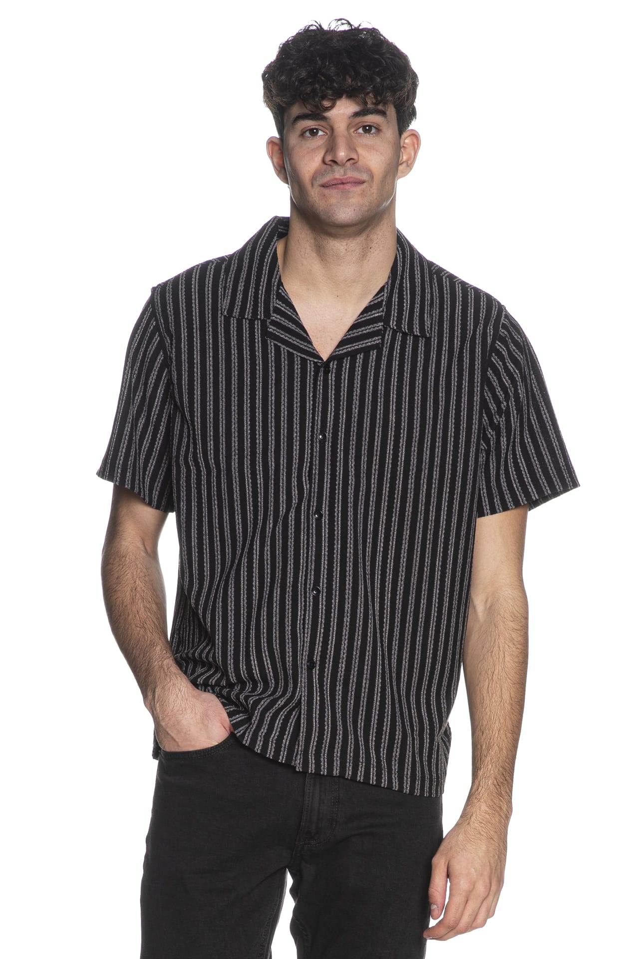 Camicia Guess Resort Blend Textured da uomo in croccante tessuto jacquard rigato, regular fit, con colletto dal taglio bowling, abbottonatura full centrale, mini etichetta logo cucita sul fondo nel retro e spacchetti laterali