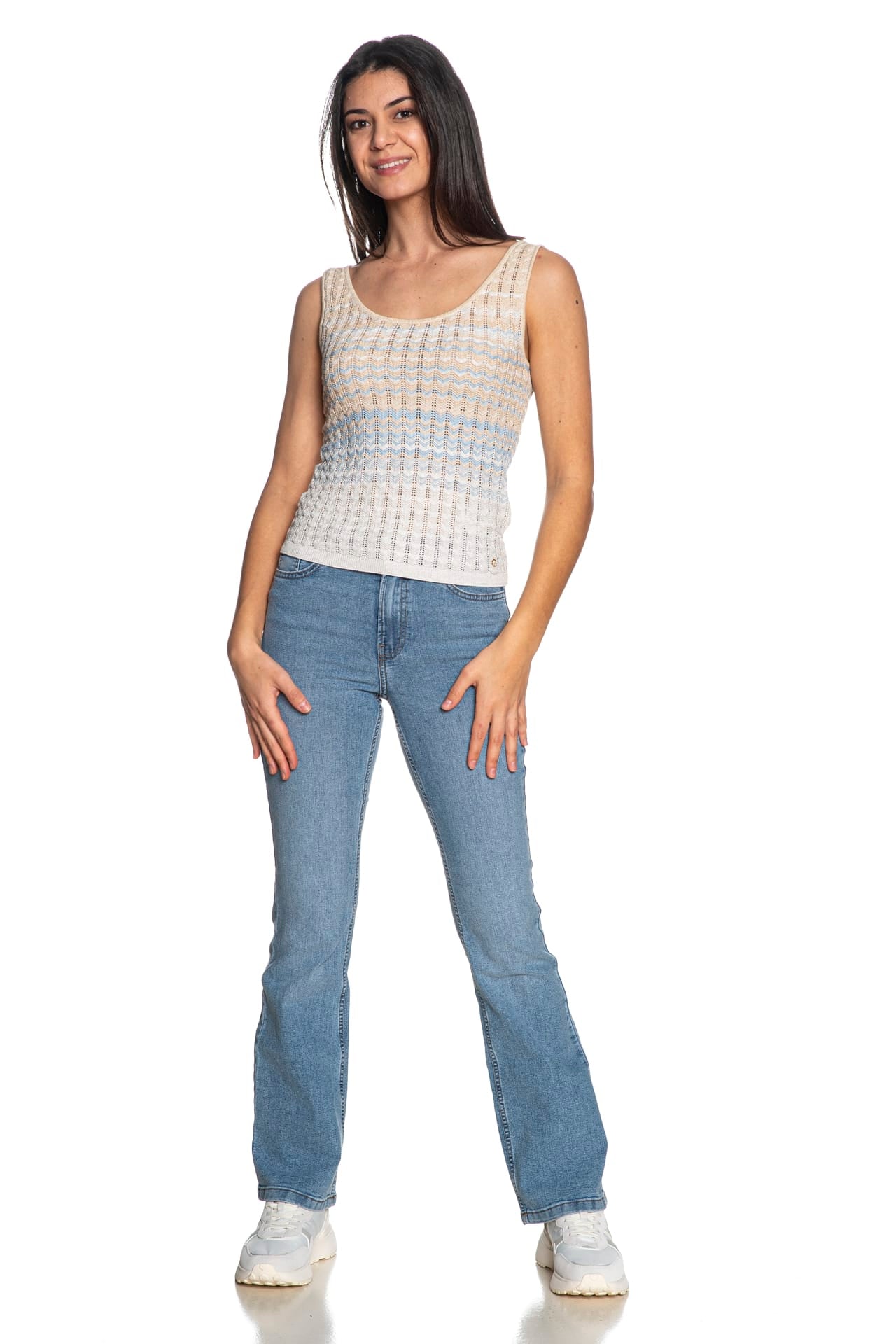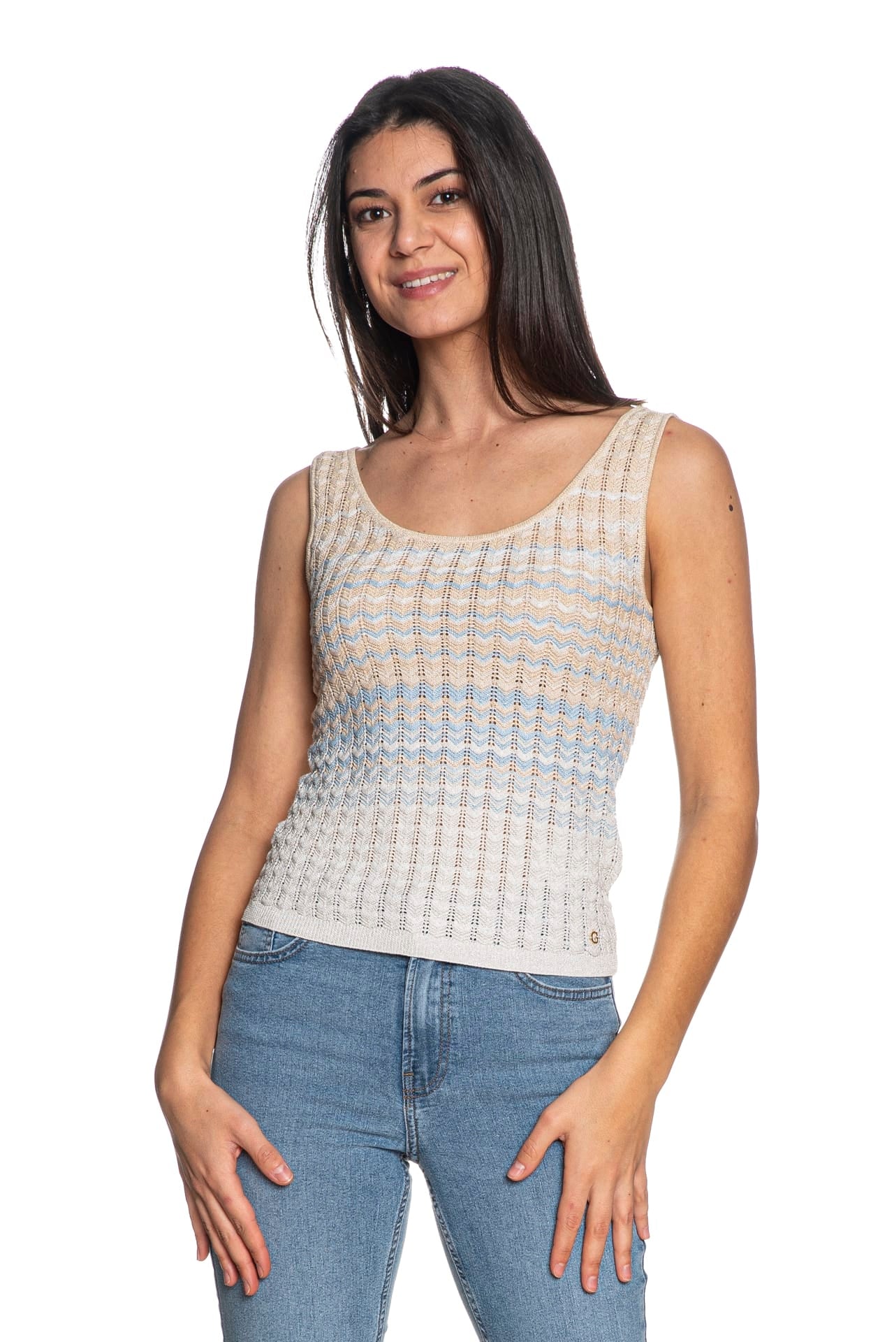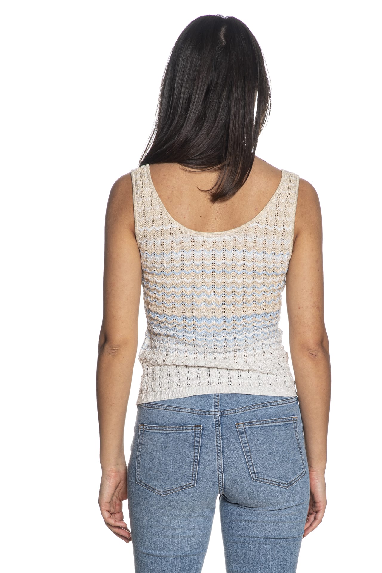 Canotta Guess Rosalyn Tank Top da donna in filato multicolor degradè misto lurex di viscosa e poliestere lavorato a maglia traforata in fantasia chevron, regular fit, con mini tag logo metallico applicato sul fondo, profili e cannolè a costine