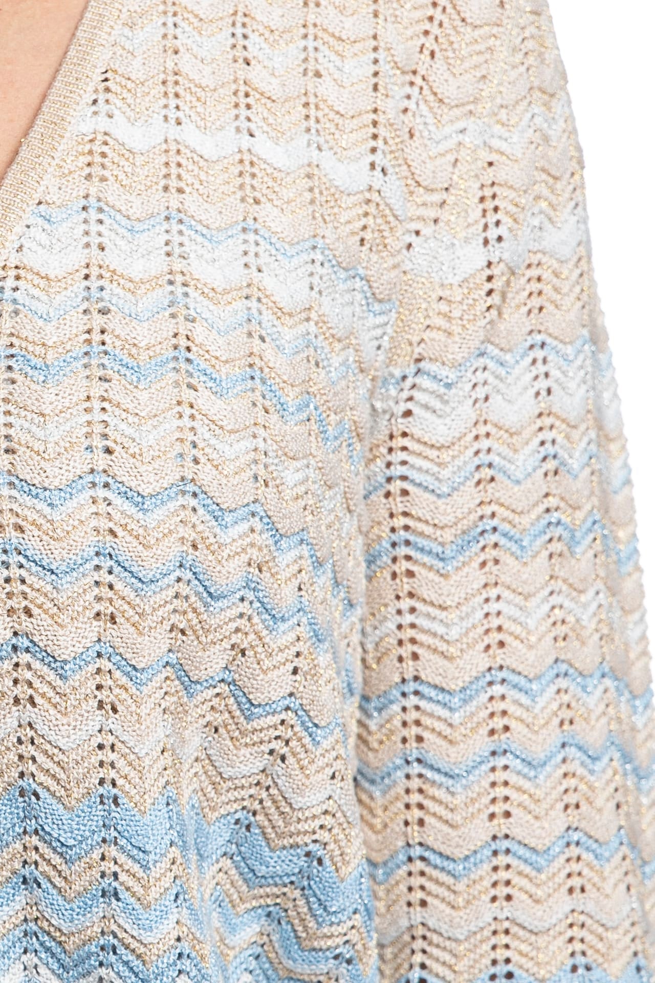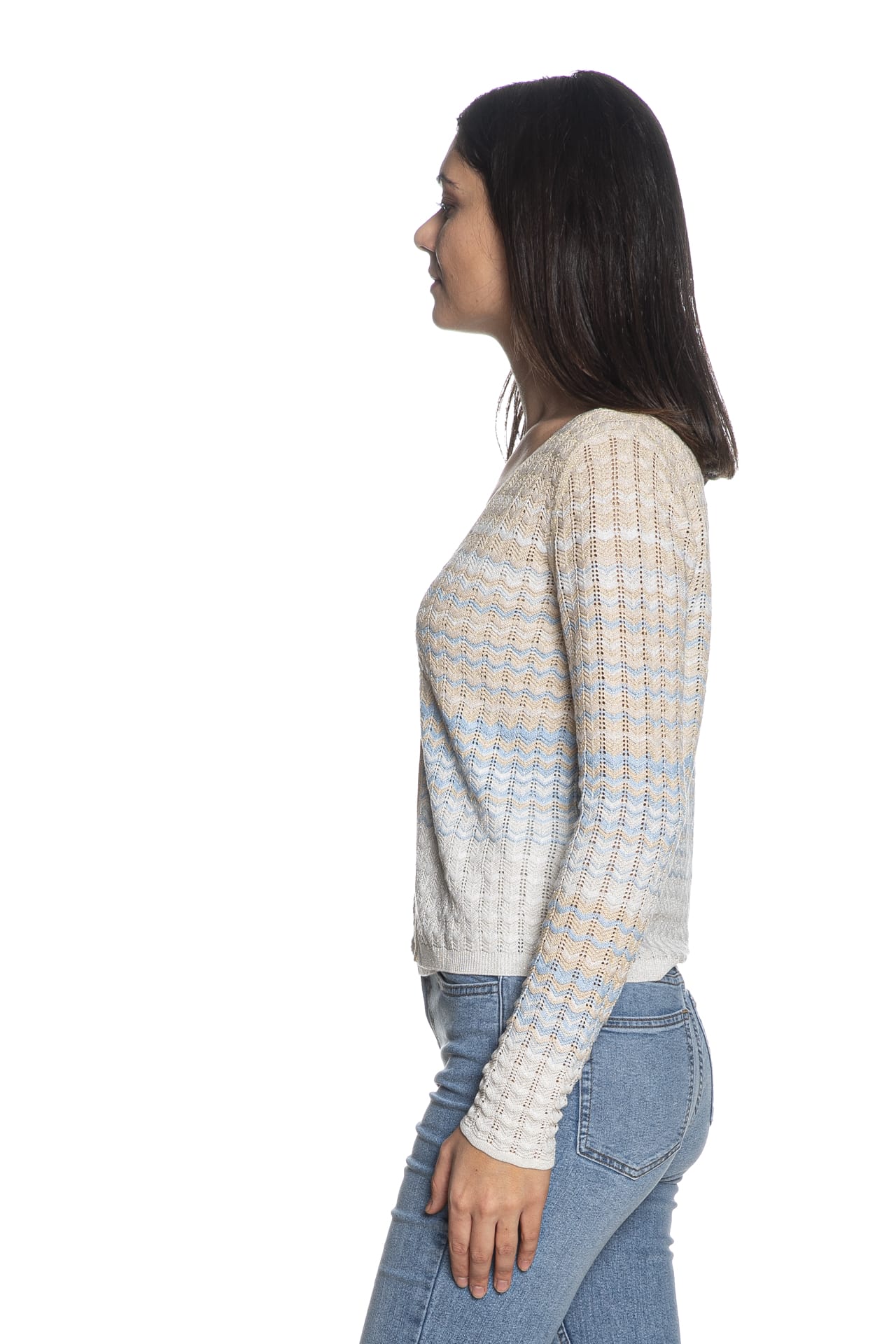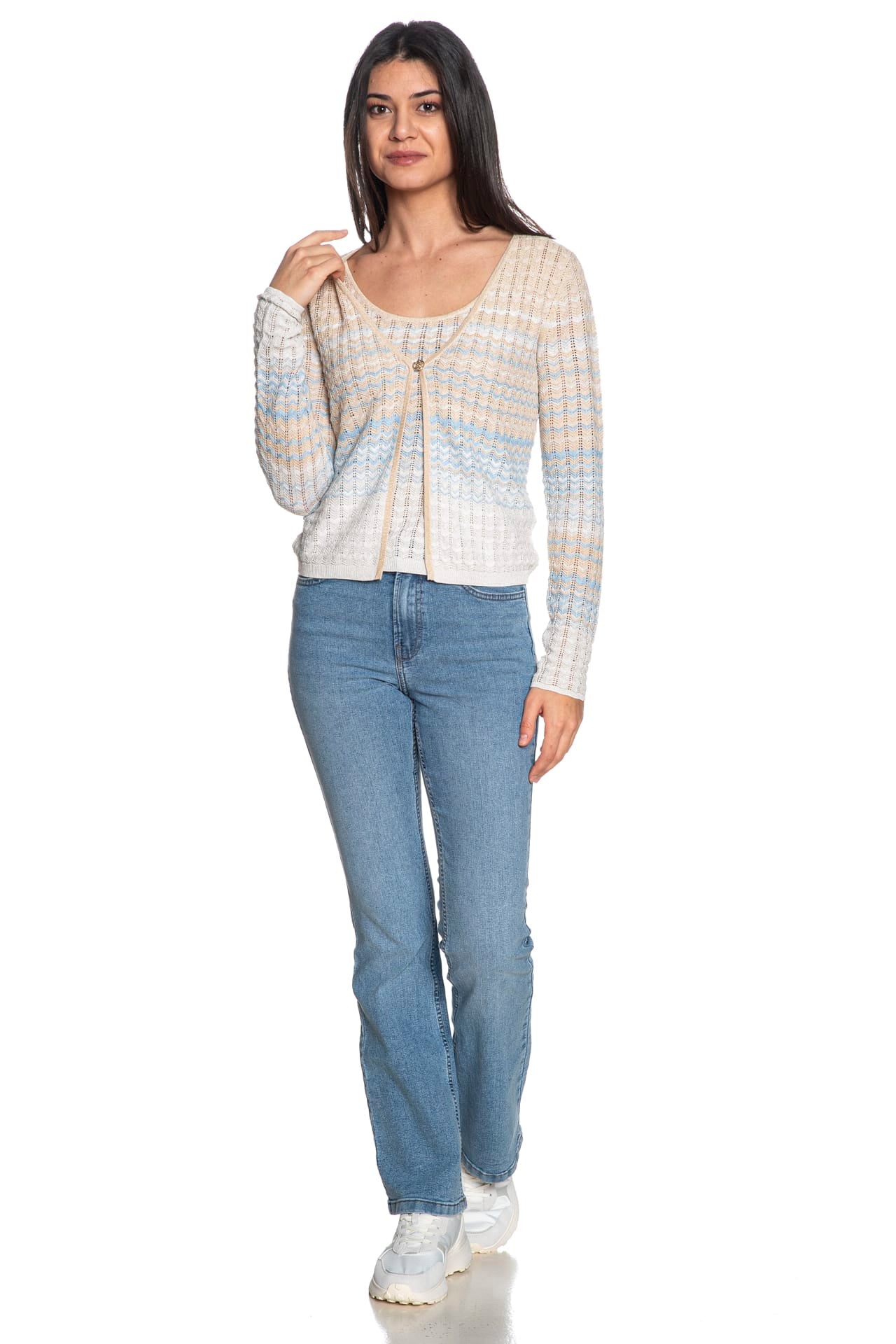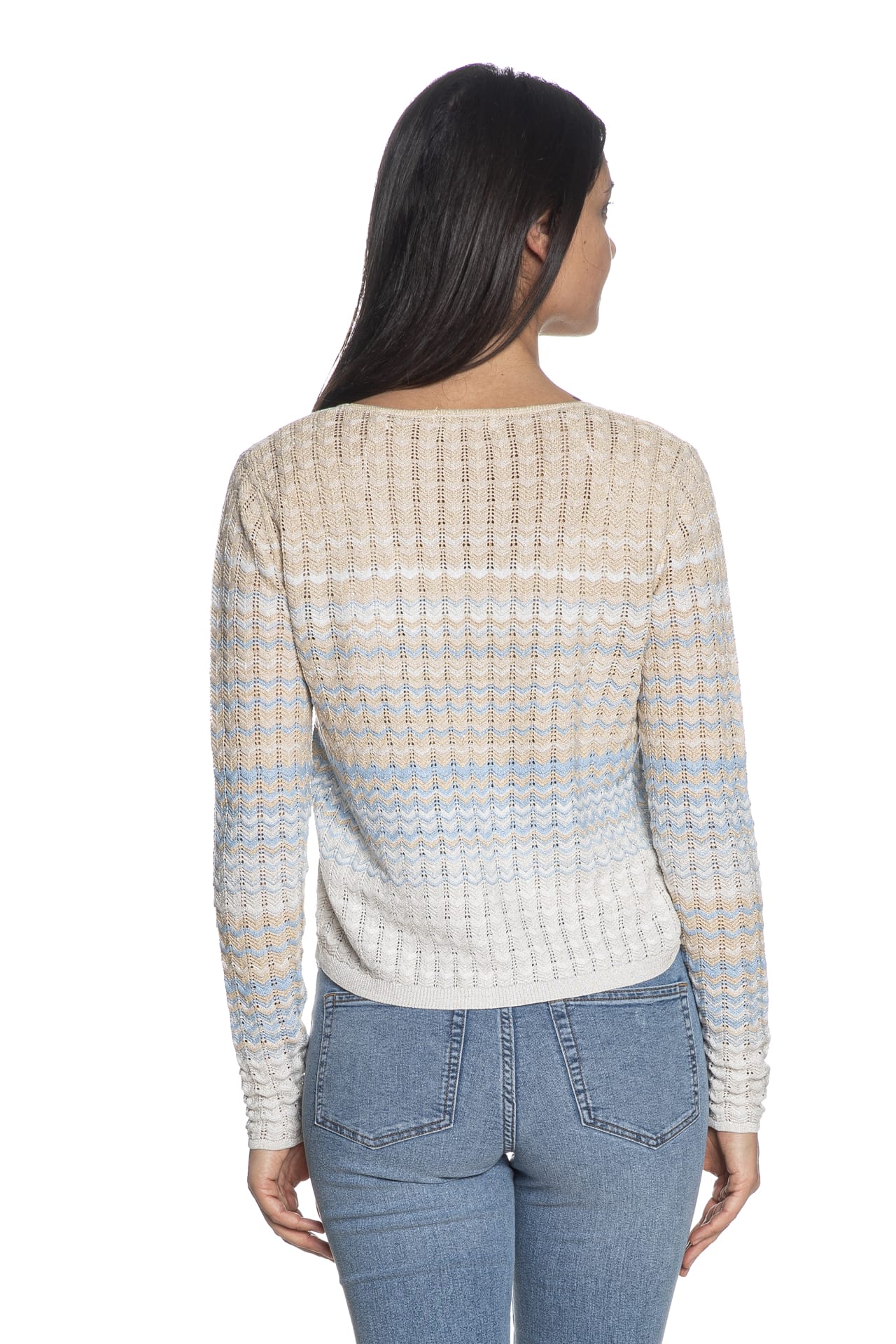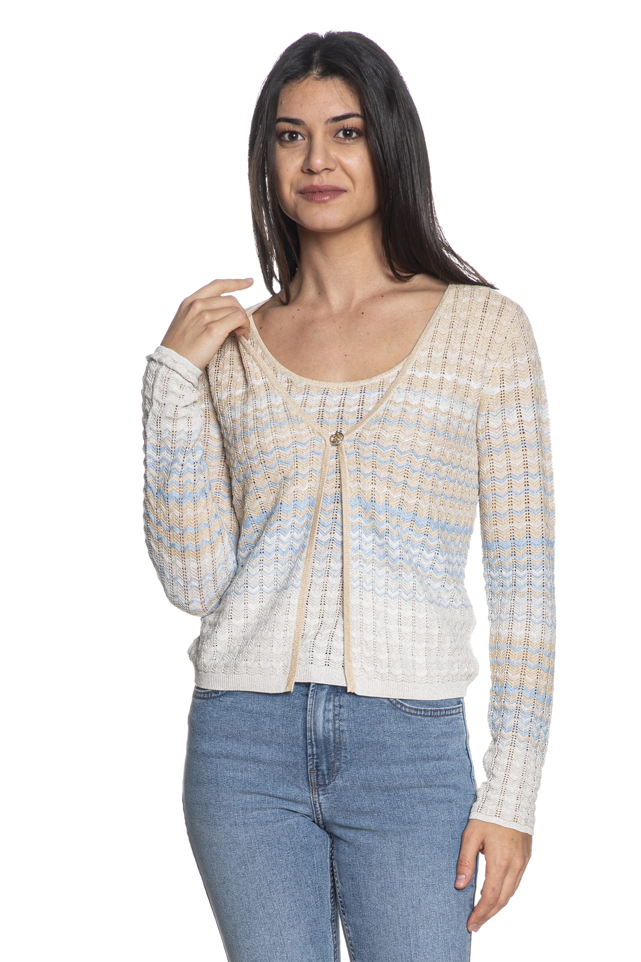 Cardigan Guess Rosalyn Cover Shoulder da donna in filato multicolor degradè misto lurex di viscosa e poliestere lavorato a maglia traforata in fantasia chevron, con profilo scollo a V, polsini e cannolè a costine e bottone metallico logato 4G e asola elasticizzata