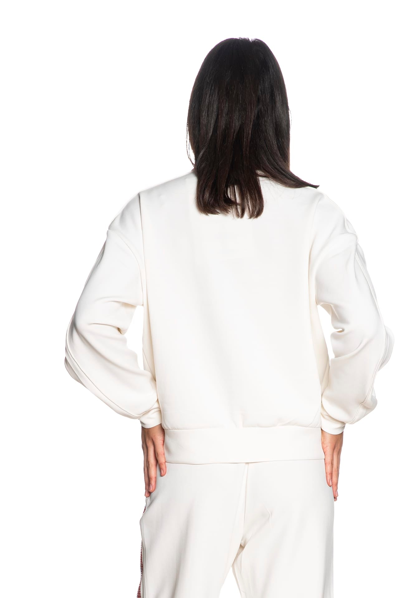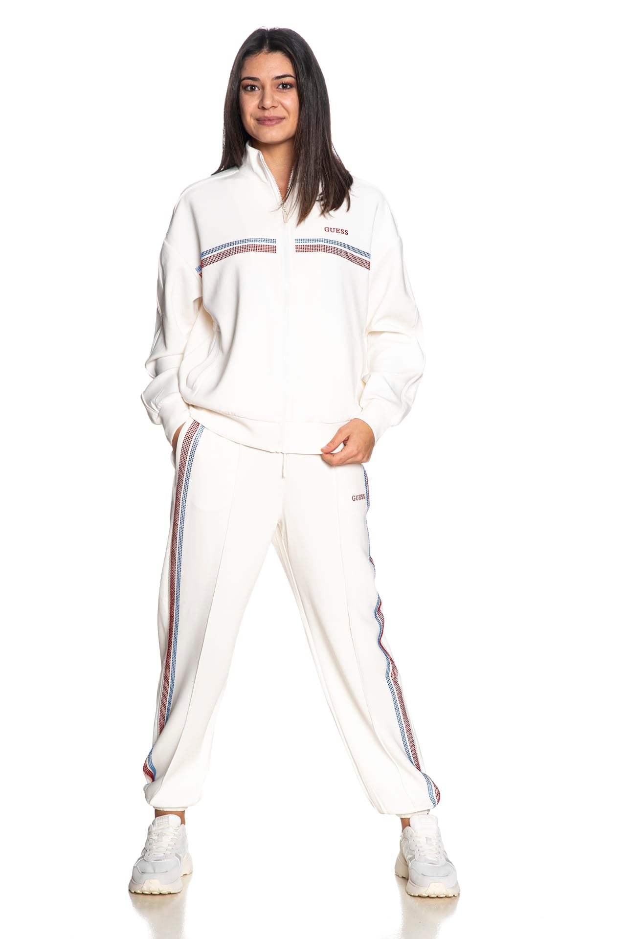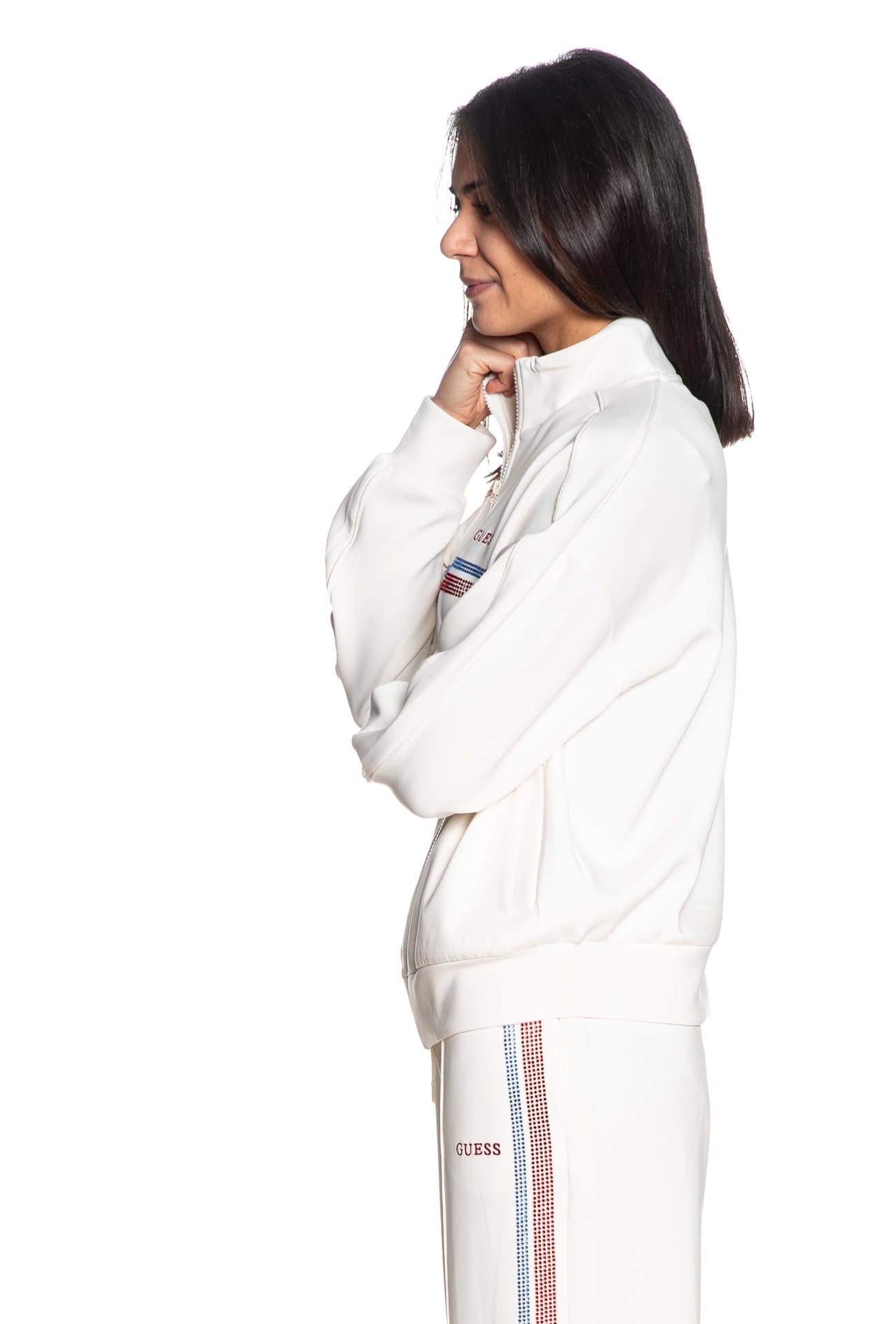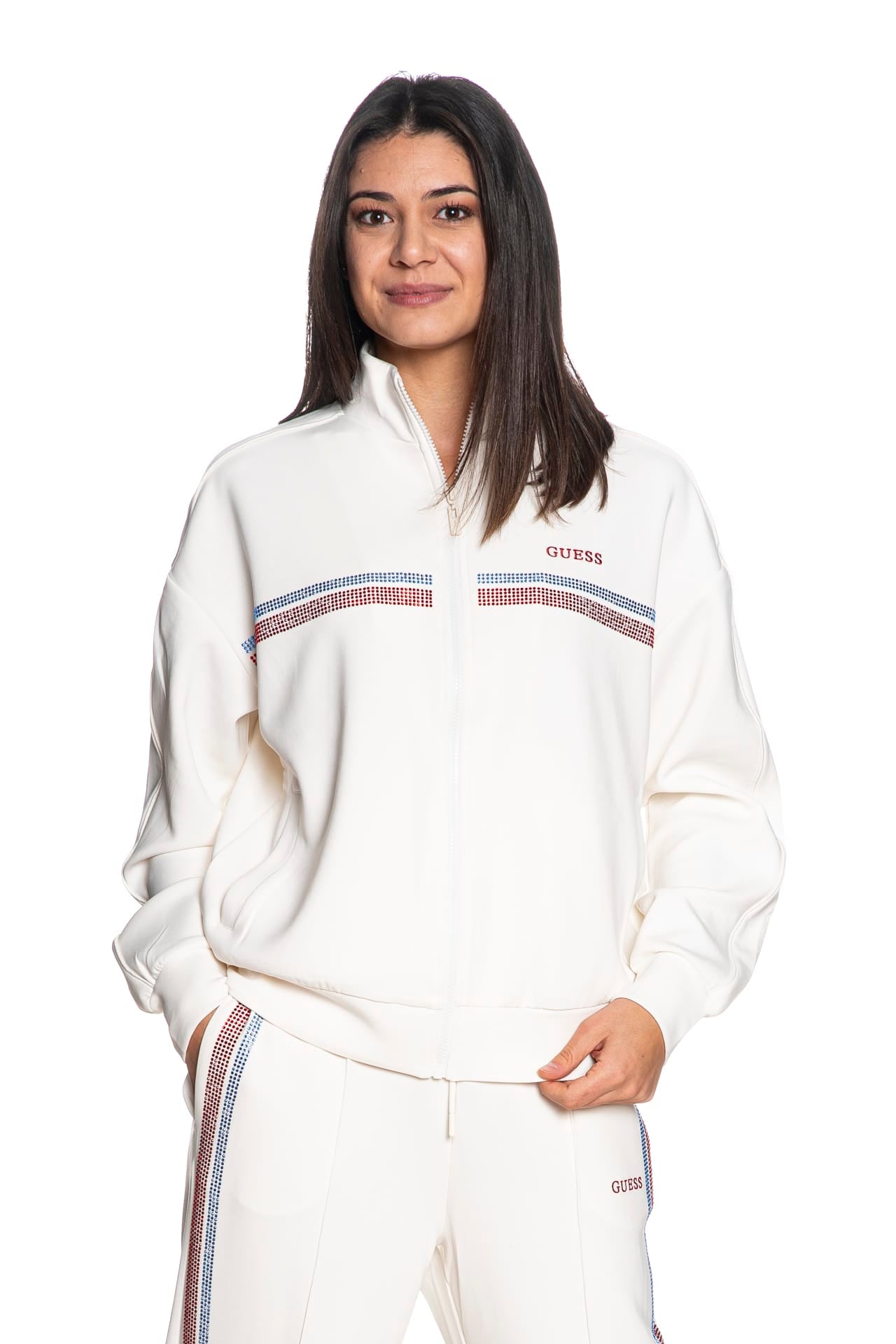 Felpa Guess Berthe High N da donna in interlock stretch di poliestere parzialmente riciclato e modal, a collo alto, con chiusura full zip a vista, tasche a filo frontali, decorazione in strass a contrasto e lettering logo ricamato sul petto