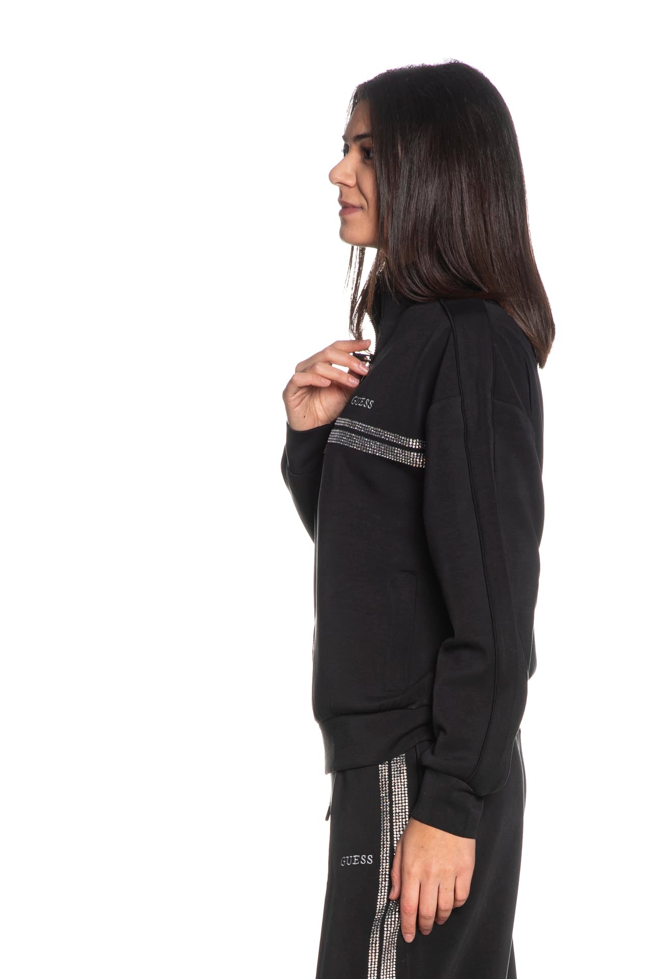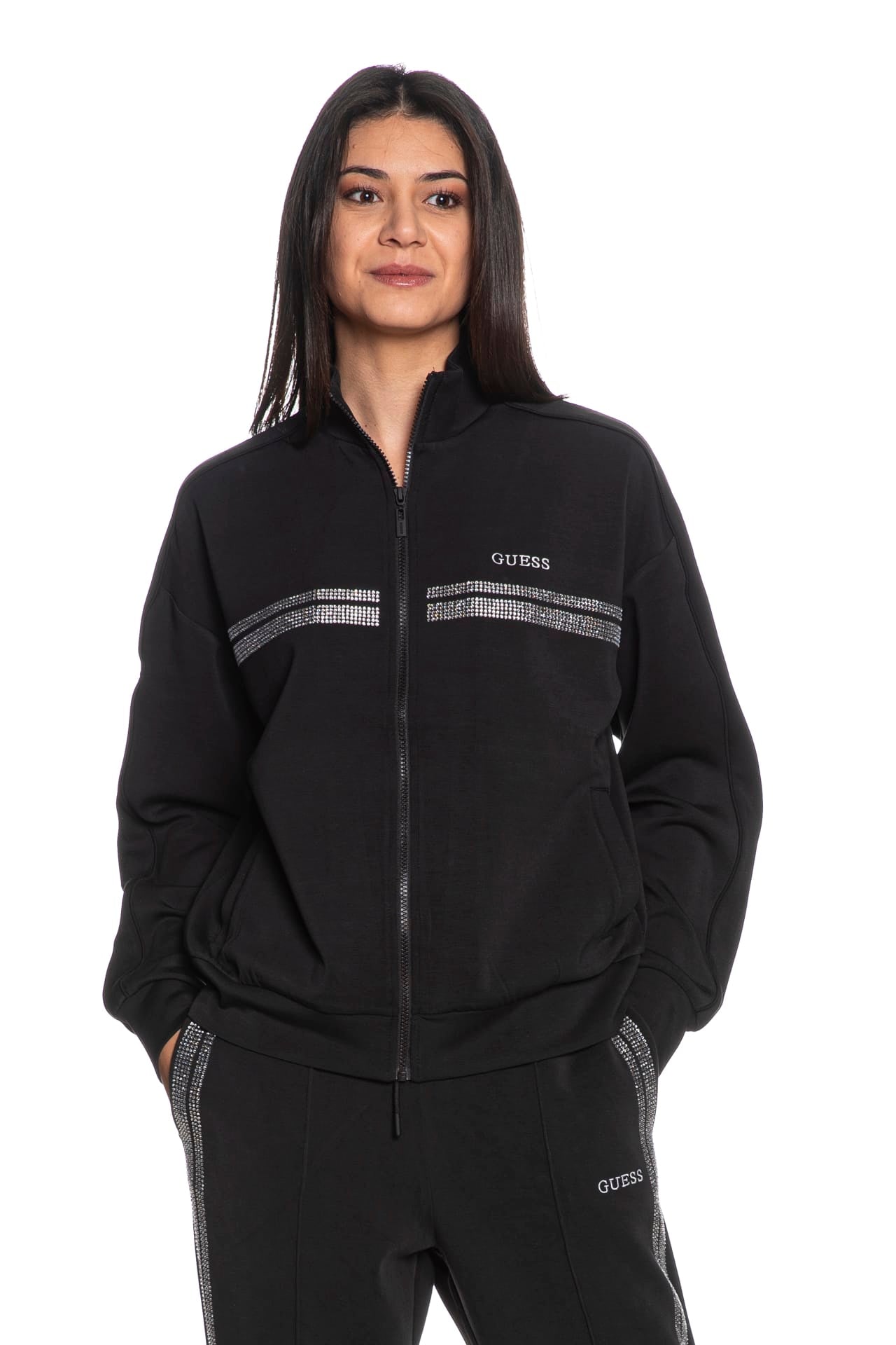 Felpa Guess Berthe High N da donna in interlock stretch di poliestere parzialmente riciclato e modal, a collo alto, con chiusura full zip a vista, tasche a filo frontali, decorazione in strass a contrasto e lettering logo ricamato sul petto